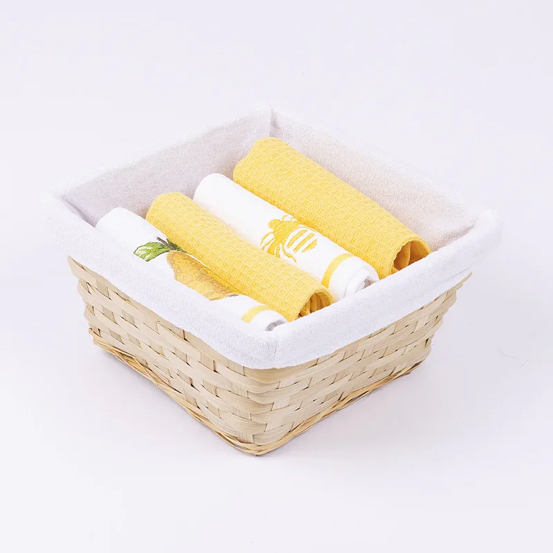 Proutěný košík s textilní vsadkou je spolu s utěrkami zabalen v celofánu a doplněn ozdobnou mašlí.
