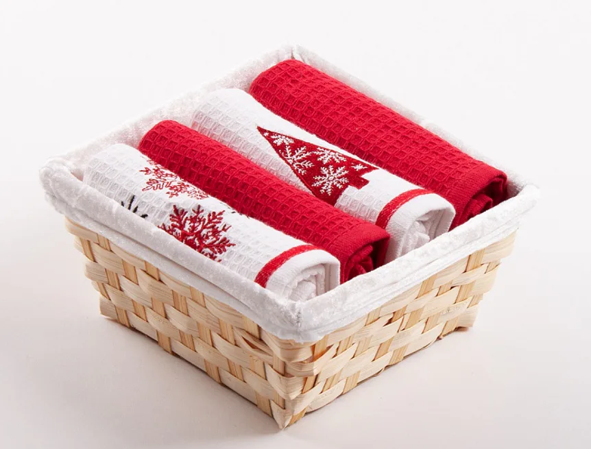 Proutěný košík s textilní vsadkou je součástí celého balení, společně s utěrkami je zabalen v celofánu a doplněn o ozdobnou mašli.