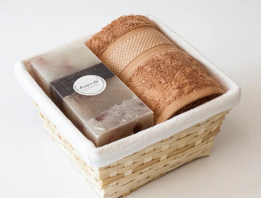 Balení obsahuje barevně sladěný set ručníku a ručně vyráběné vonné svíčky.