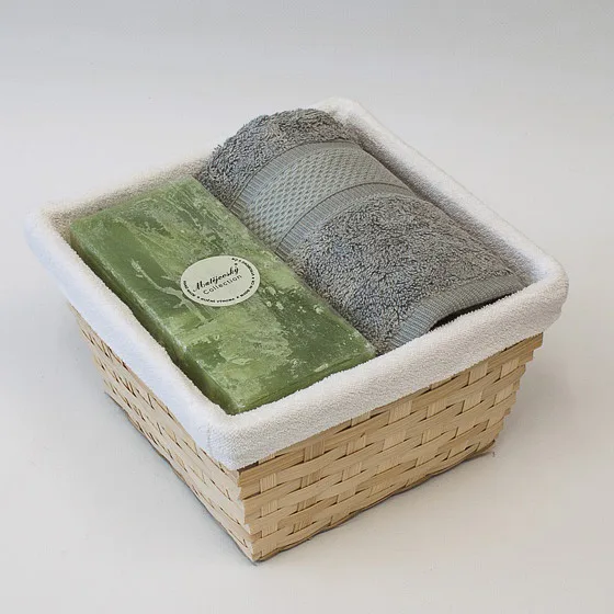 Balení obsahuje barevně sladěný set ručníku a ručně vyráběné vonné svíčky.