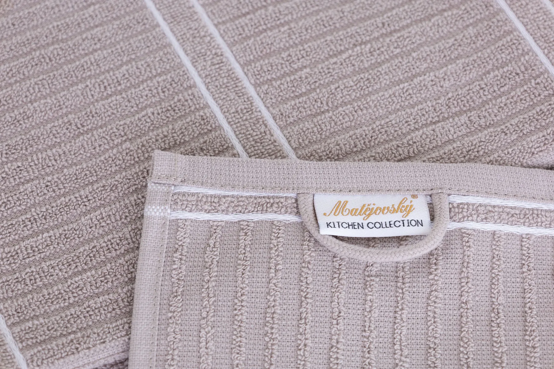 Kuchyňské utěrky Arona upoutají vaši pozornost moderním designem - vytkaný proužkovaný vzor vyniká na lícové straně smyčkového froté. Spodní stranu utěrky tvoří odlehčené froté v inverzním provedení. Originální design utěrek podtrhuje vodorovně vyšitá bílá linka. Utěrky jsou navrženy tak, aby měly ideální absorpční vlastnosti a současně rychle schly. Utěrky jsou ze všech čtyř stran lemované a jsou opatřeny praktickým poutkem.