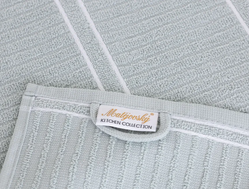 Kuchyňské utěrky Arona upoutají vaši pozornost moderním designem - vytkaný proužkovaný vzor vyniká na lícové straně smyčkového froté. Spodní stranu utěrky tvoří odlehčené froté v inverzním provedení. Originální design utěrek podtrhuje vodorovně vyšitá bílá linka. Utěrky jsou navrženy tak, aby měly ideální absorpční vlastnosti a současně rychle schly. Utěrky jsou ze všech čtyř stran lemované a jsou opatřeny praktickým poutkem.