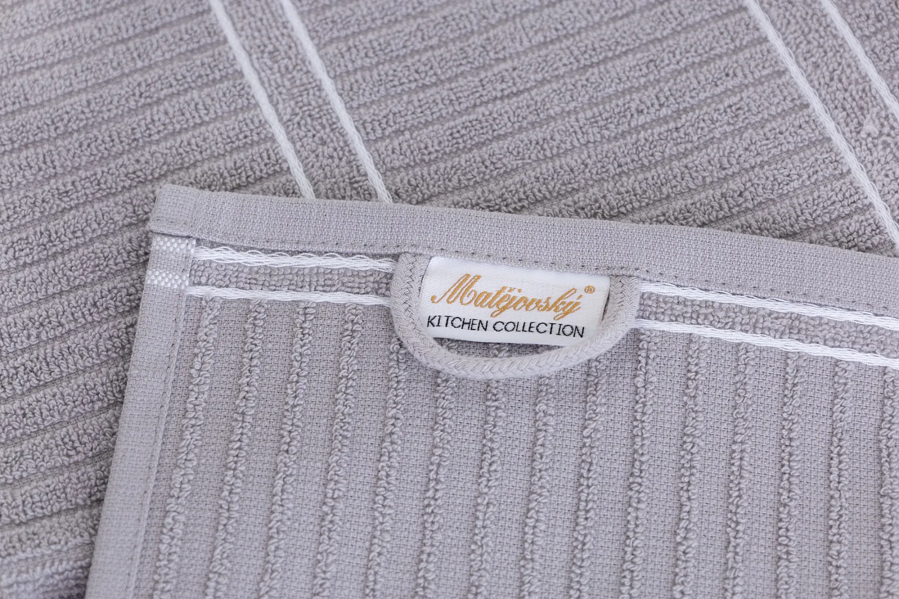 Kuchyňské utěrky Arona upoutají vaši pozornost moderním designem - vytkaný proužkovaný vzor vyniká na lícové straně smyčkového froté. Spodní stranu utěrky tvoří odlehčené froté v inverzním provedení. Originální design utěrek podtrhuje vodorovně vyšitá bílá linka. Utěrky jsou navrženy tak, aby měly ideální absorpční vlastnosti a současně rychle schly. Utěrky jsou ze všech čtyř stran lemované a jsou opatřeny praktickým poutkem.