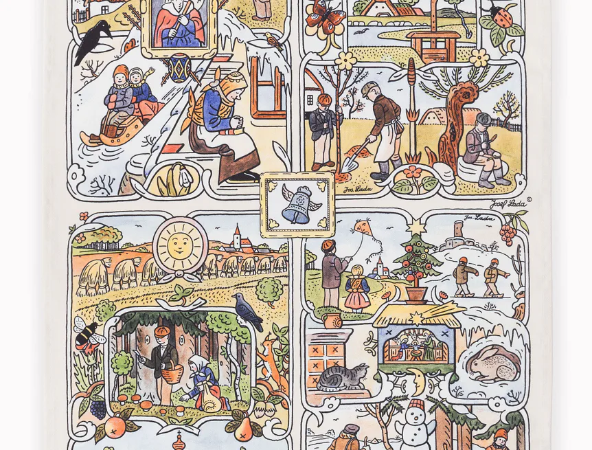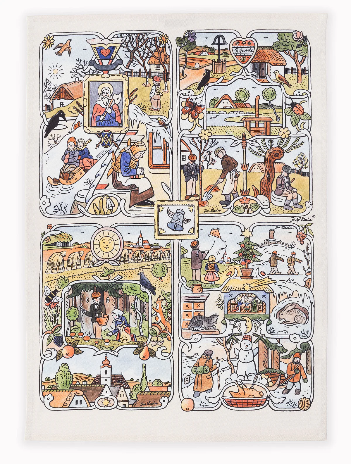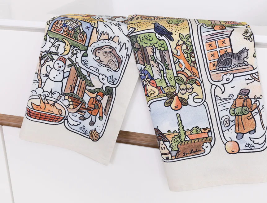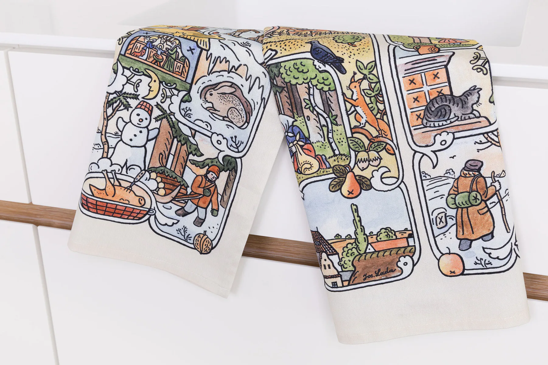 Kuchyňské utěrky Čtyři roční období se díky nejmodernější digitální tiskové technologii pyšní nádhernými barvami a precizními detaily, které vykreslují autentickou ladovskou poetiku.
