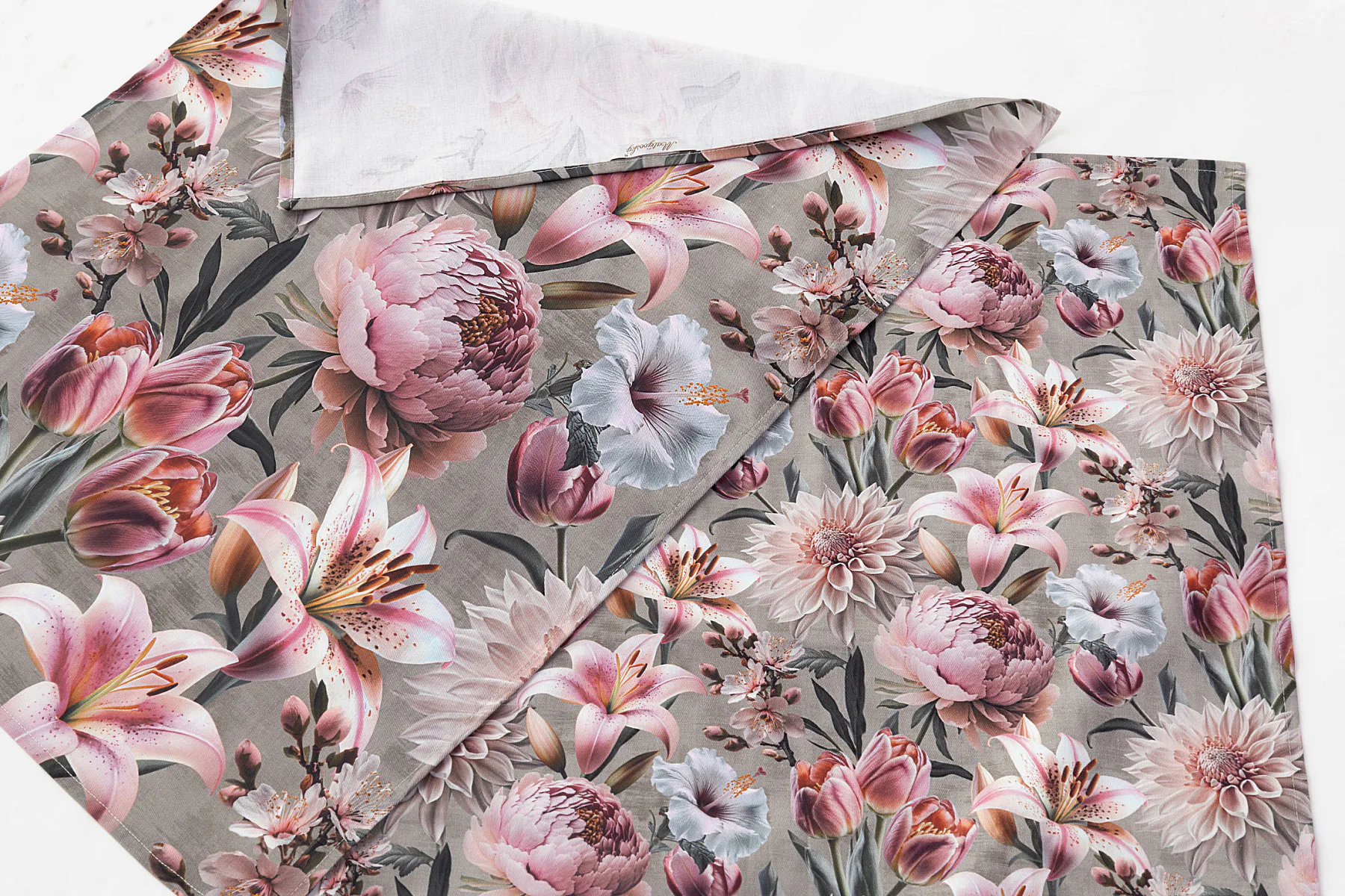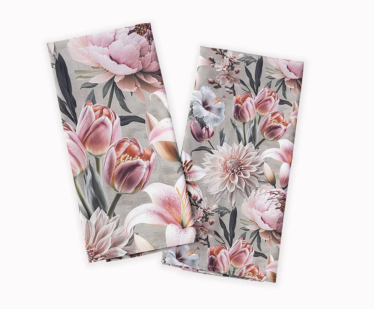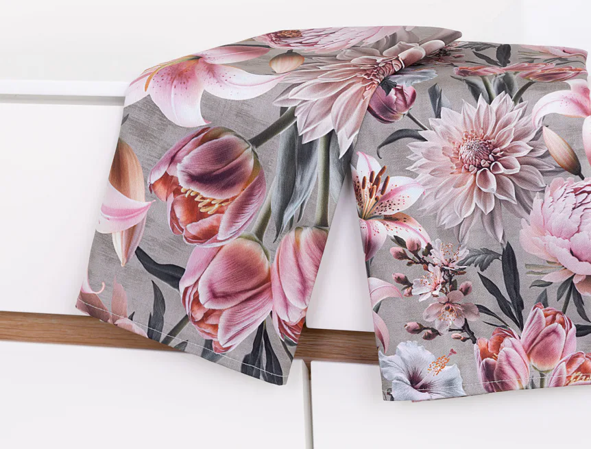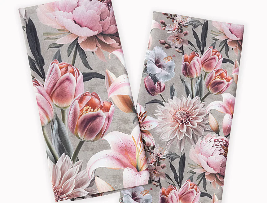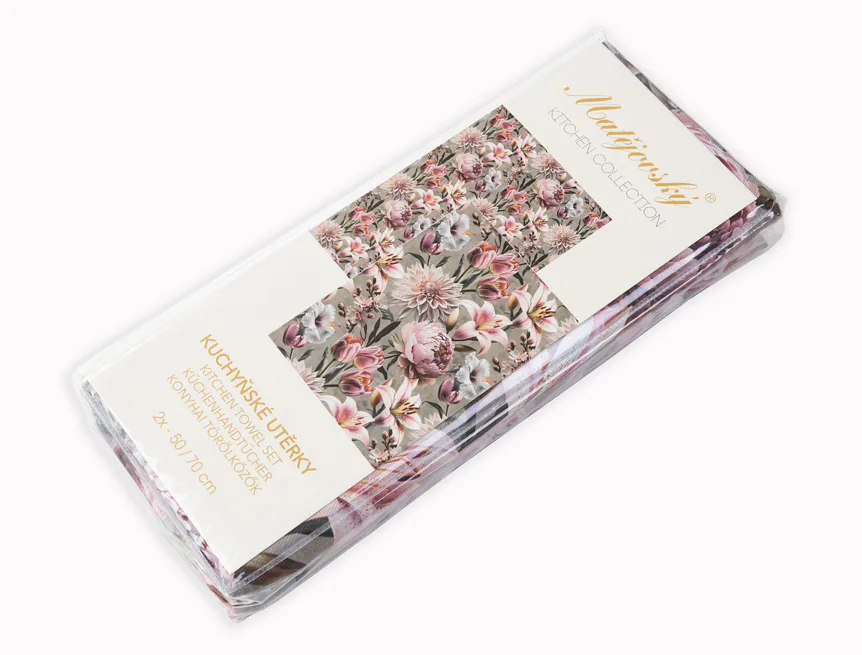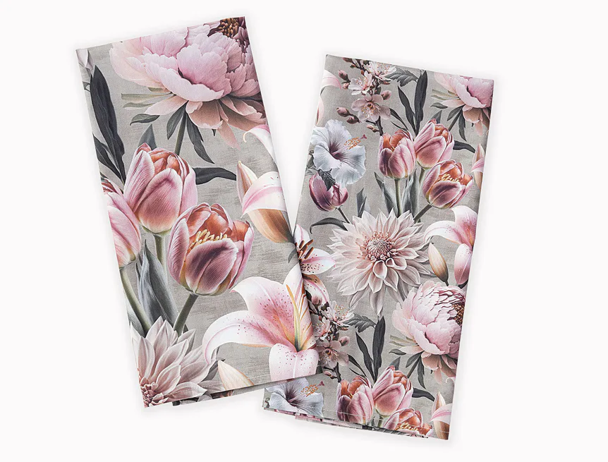Potisk: jednostranný, obě utěrky zachycují stejný florální motiv s odlišnou velikostí květin