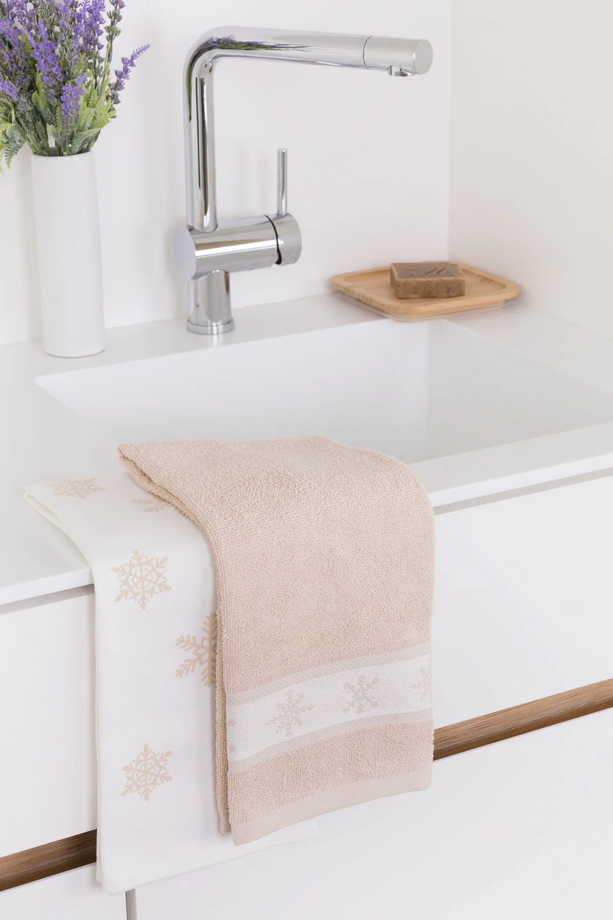 Kuchyňský set Holy si vás získá svým praktickým provedením. Vrchní strana bílé potištěné utěrky je hladká s jemnou vlnkovou strukturou, spodní stranu tvoří hebké froté. Béžovou utěrku s vánoční bordurou, chcete-li kuchyňský ručník, tvoří skvěle savé froté. Utěrky mají všechny čtyři strany lemované a jsou opatřeny praktickým poutkem pro zavěšení.