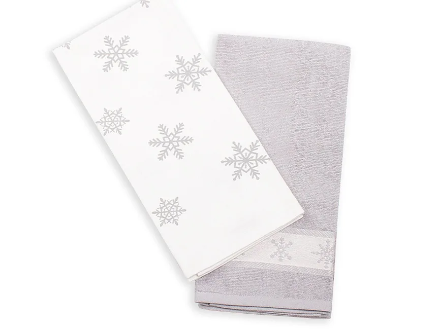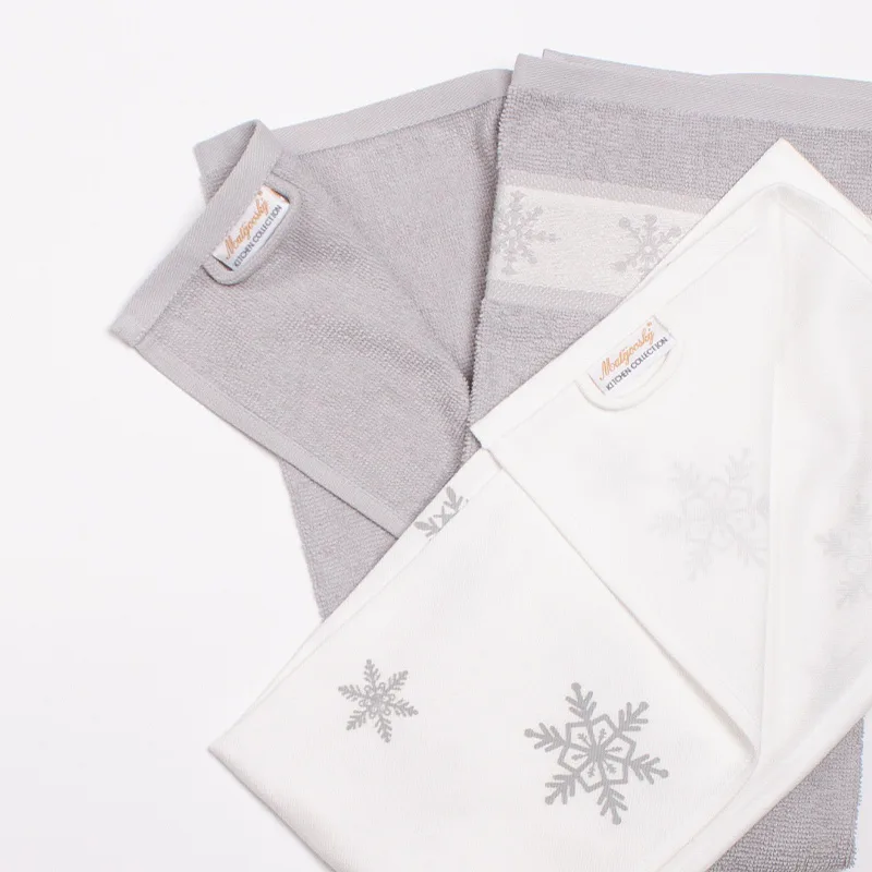 Kuchyňský set Holy si vás získá svým praktickým provedením. Vrchní strana bílé potištěné utěrky je hladká s jemnou vlnkovou strukturou, spodní stranu tvoří hebké froté. Šedou utěrku s vánoční bordurou, chcete-li kuchyňský ručník, tvoří skvěle savé froté. Utěrky mají všechny čtyři strany lemované a jsou opatřeny praktickým poutkem pro zavěšení.
