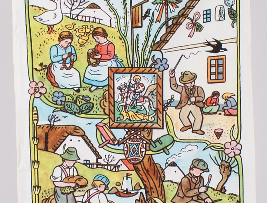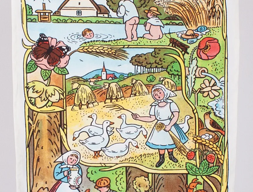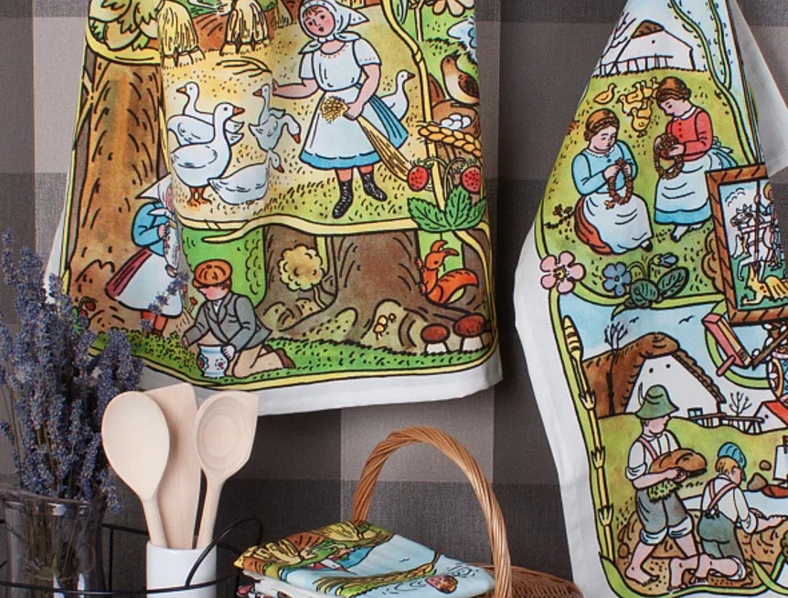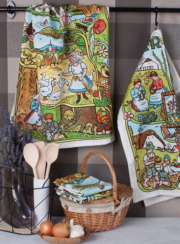 Kuchyňské utěrky Jaro & Léto se díky nejmodernější digitální tiskové technologii pyšní nádhernými barvami a precizními detaily, které vykreslují autentickou ladovskou poetiku.