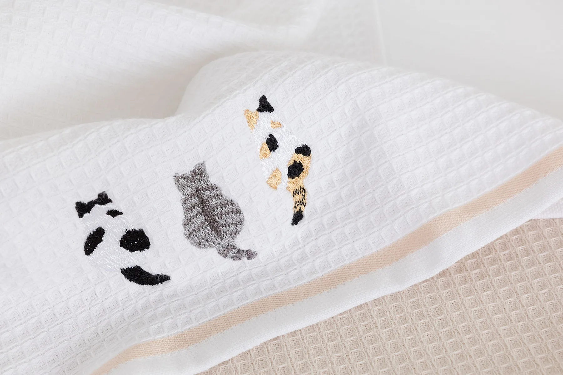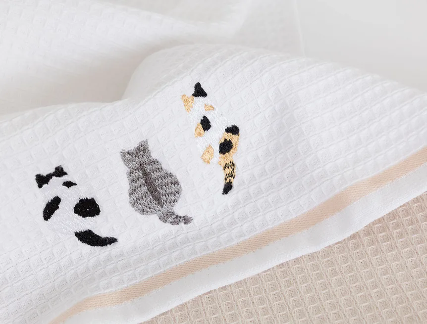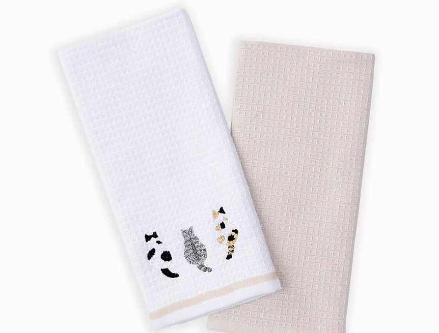 Atraktivní a precizně provedené lesklé výšivky se skvěle doplňují s okouzlujícími barevnými odstíny napříč celou kolekcí vaflových utěrek.
