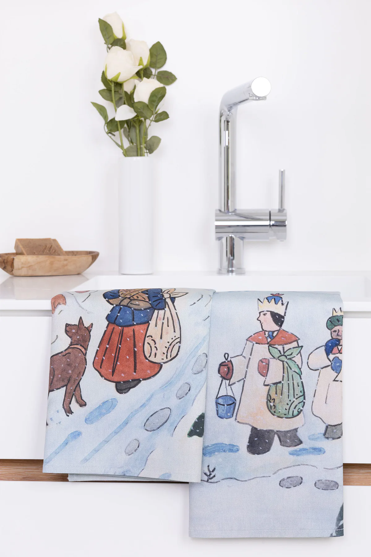 Kuchyňské utěrky Koleda Tříkrálová se díky nejmodernější digitální tiskové technologii pyšní nádhernými barvami a precizními detaily, které vykreslují autentickou ladovskou poetiku.