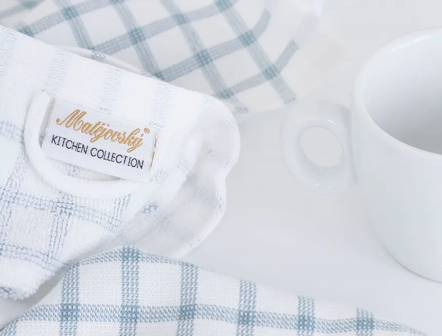 Kuchyňské utěrky Kostky vynikají svým praktickým provedením a nadčasovým designem. Vrchní strana utěrky je hladká s jednoduchým kostkovaným vzorem, spodní stranu tvoří hebké bílé froté s prosvítajícím motivem kostek z vrchní strany. Díky optimální gramáži utěrky výborně sají a velmi rychle schnou. Utěrky mají všechny čtyři strany lemované a jsou opatřeny praktickým poutkem.