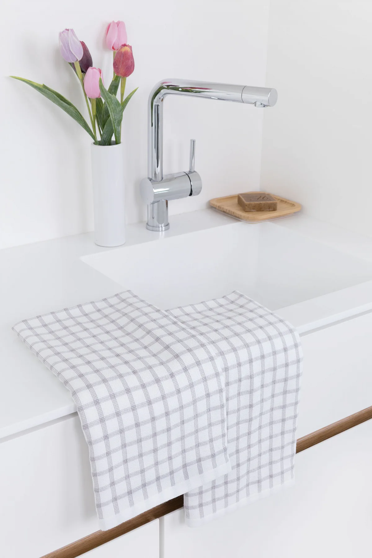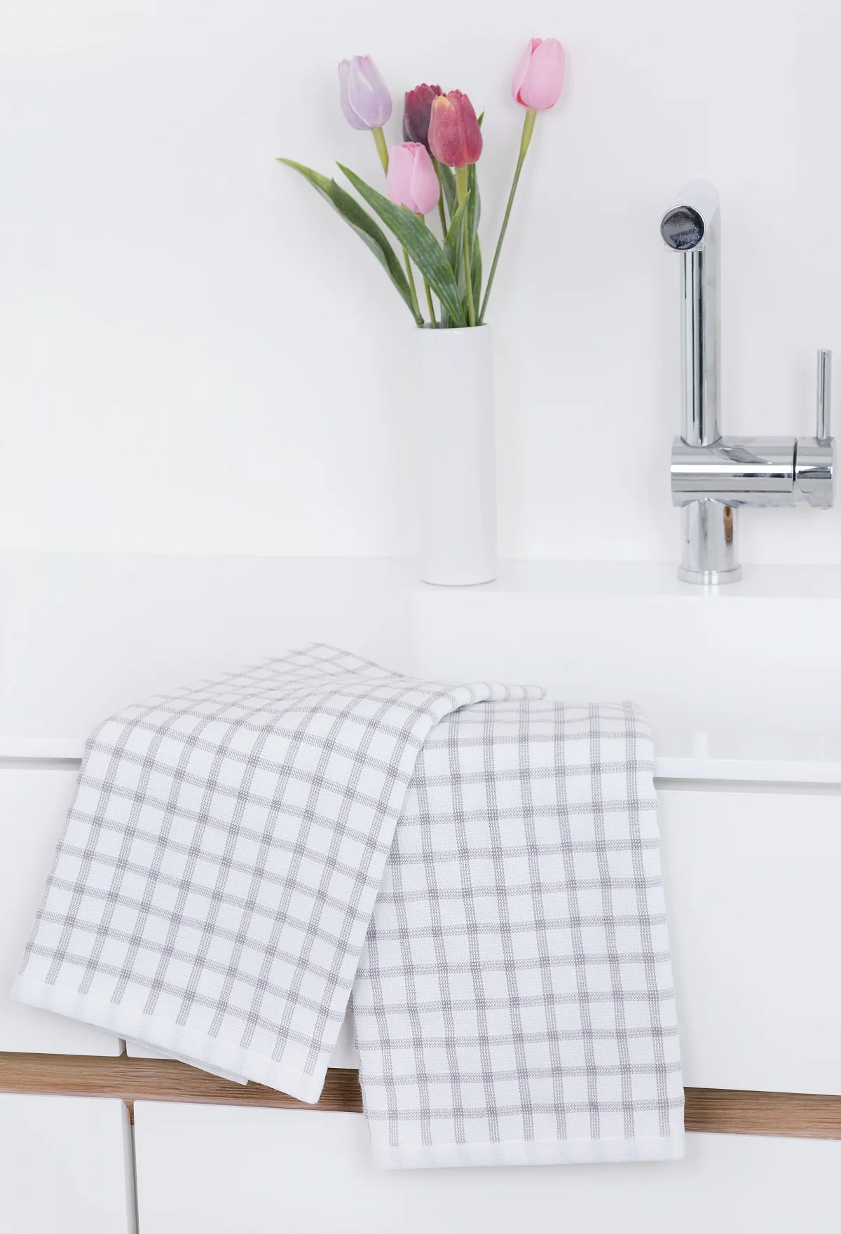 Kuchyňské utěrky Kostky vynikají svým praktickým provedením a nadčasovým designem. Vrchní strana utěrky je hladká s jednoduchým kostkovaným vzorem, spodní stranu tvoří hebké bílé froté s prosvítajícím motivem kostek z vrchní strany. Díky optimální gramáži utěrky výborně sají a velmi rychle schnou. Utěrky mají všechny čtyři strany lemované a jsou opatřeny praktickým poutkem.