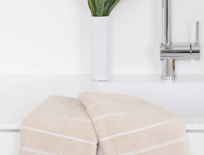 Kuchyňské utěrky Mona zdobí na vrchní straně smyčkového froté elegantní bílé proužky, na spodní straně utěrky jsou tyto proužky v barvě froté. Utěrky jsou navrženy tak, aby měly ideální absorpční vlastnosti a současně rychle schly. Utěrky jsou ze všech čtyř stran lemované a jsou opatřeny praktickým poutkem.