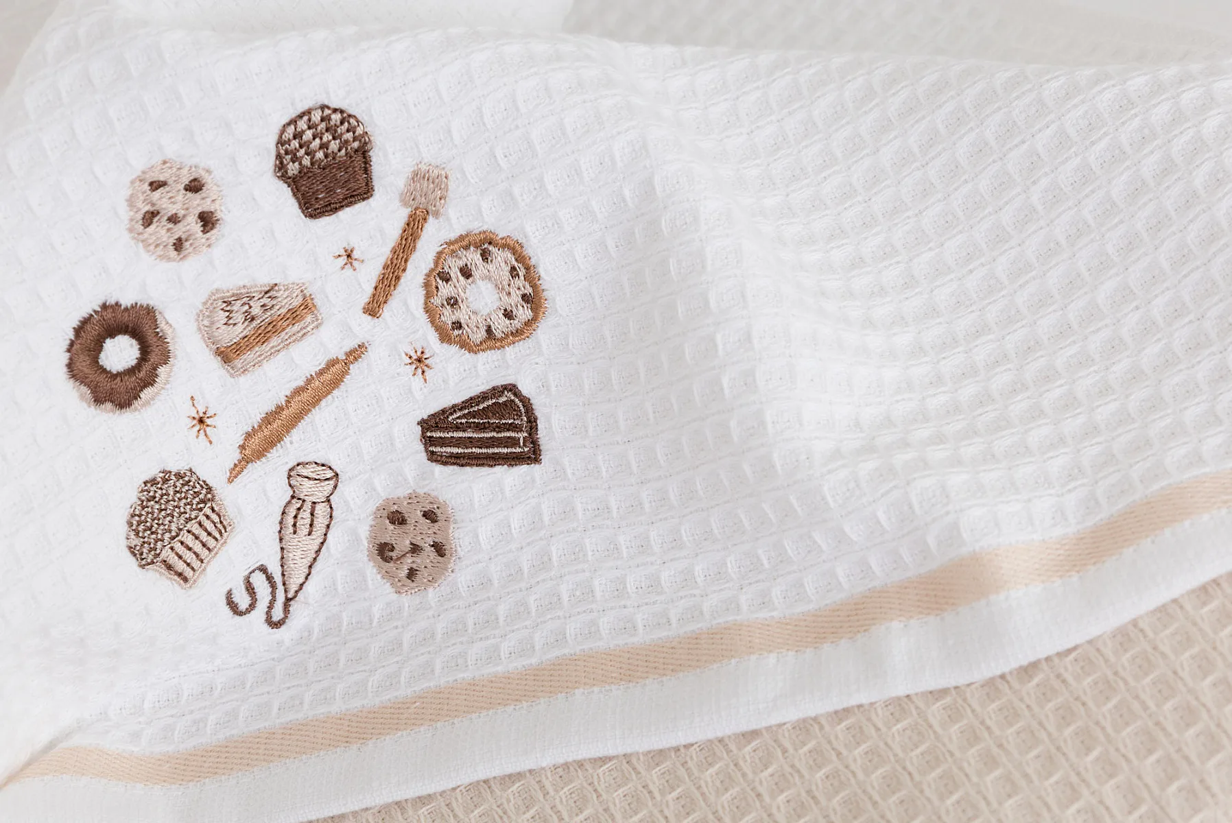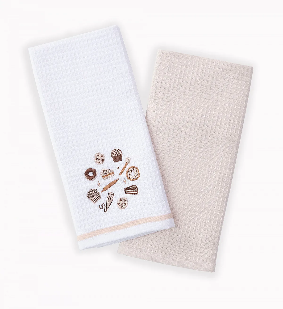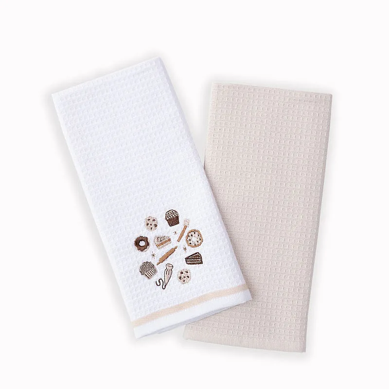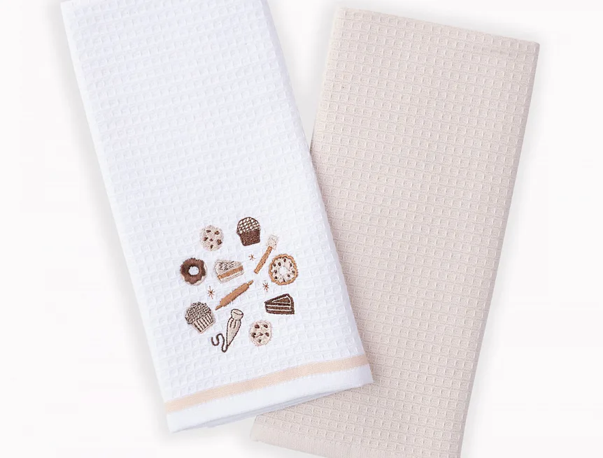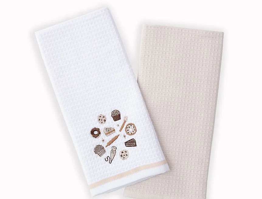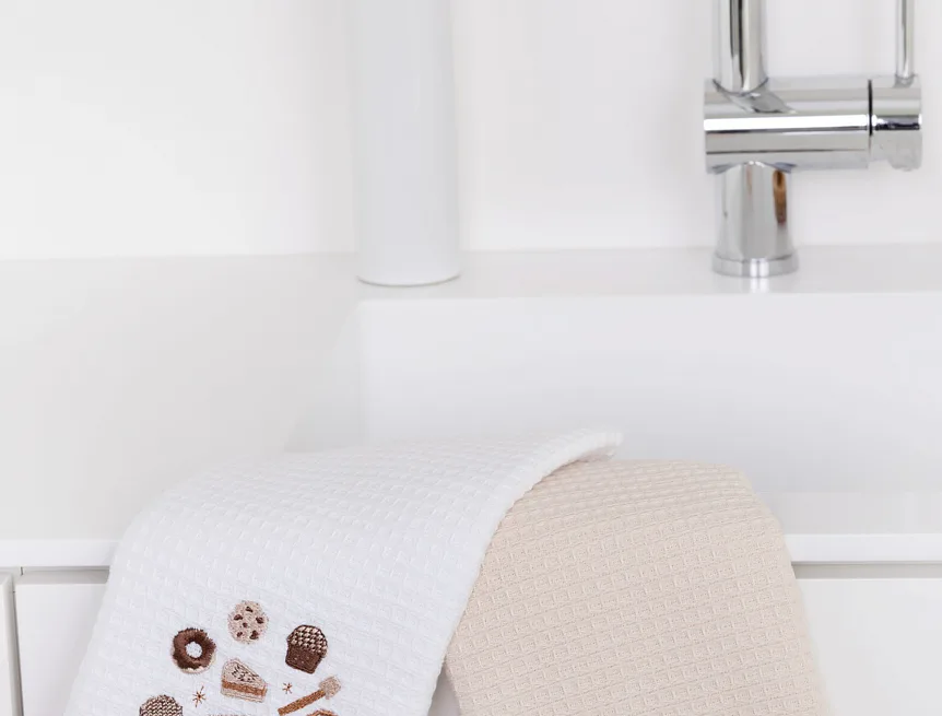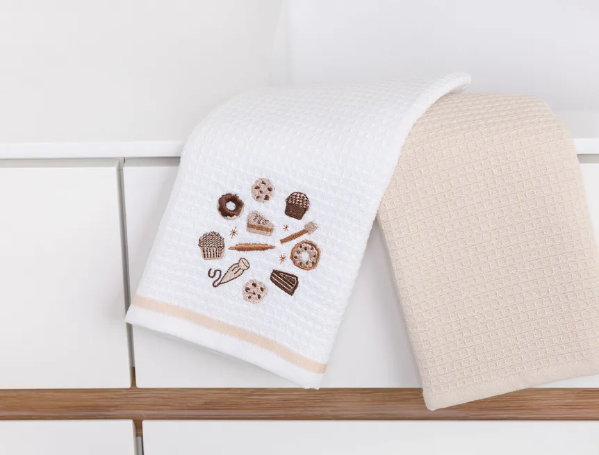 Atraktivní a precizně provedené lesklé výšivky se skvěle doplňují s okouzlujícími barevnými odstíny napříč celou kolekcí vaflových utěrek.