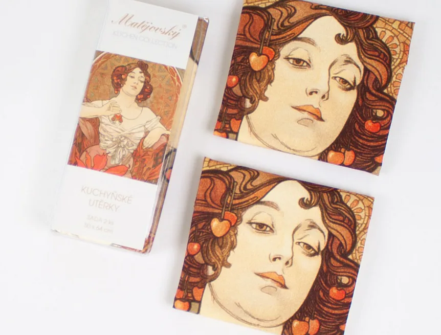 Kolekce bavlněných kuchyňských utěrek s kresbami Alfonse Muchy vnese do vaší kuchyně jediněčnou atmosféru. Nejmodernější digitální tisková technologie zajišťuje zářivé barvy a precizní detaily.