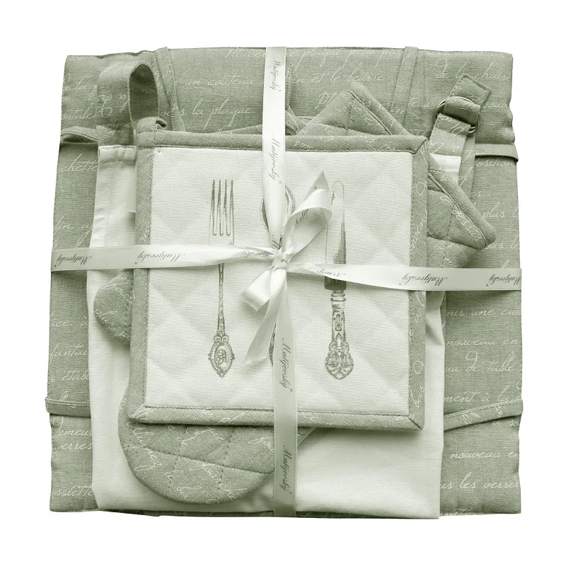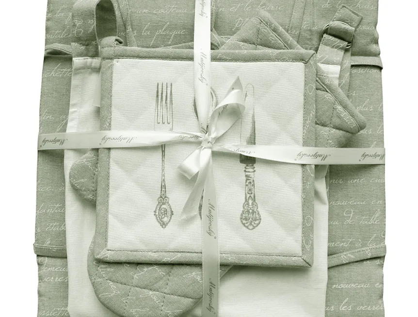 Doplňky, které dodají Vaší kuchyni eleganci a styl. Decentní barevná kombinace bílé, na které dominuje vzor kuchyňského příboru a béžovo šedé, doplněná drobným vzorem psacího písma, dává celému setu noblesní nádech.