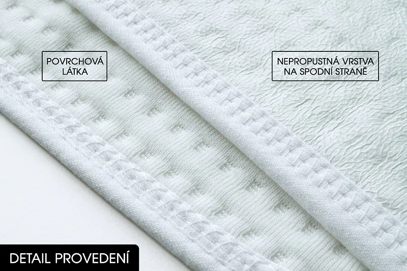 Povrchová látka - 65 % polyester, 35 % bavlna. Tento chránič neobsahuje výplň a je opatřen v rozích širokou gumou pro snadné uchycení k matraci. Spodní stranu tvoří nepropustný zátěr z polyuretanu.