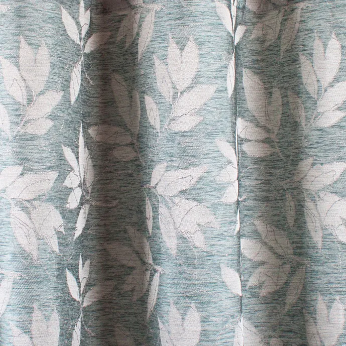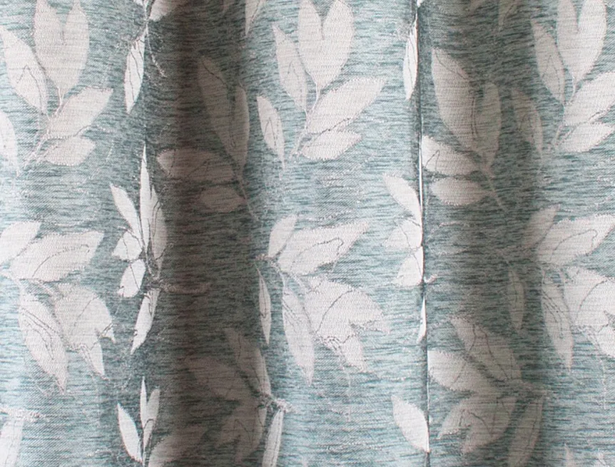 Látka má melírovanou, precizně tkanou proužkovanou strukturu doplněnou a vytkávaný lístečkový motiv v perfektně sladěných světlých odstínech pastelové modrozelené. Látka je částečně zatemňující, nejedná se o blackout. Příjemný matný lesk dodává nadčasovou eleganci.