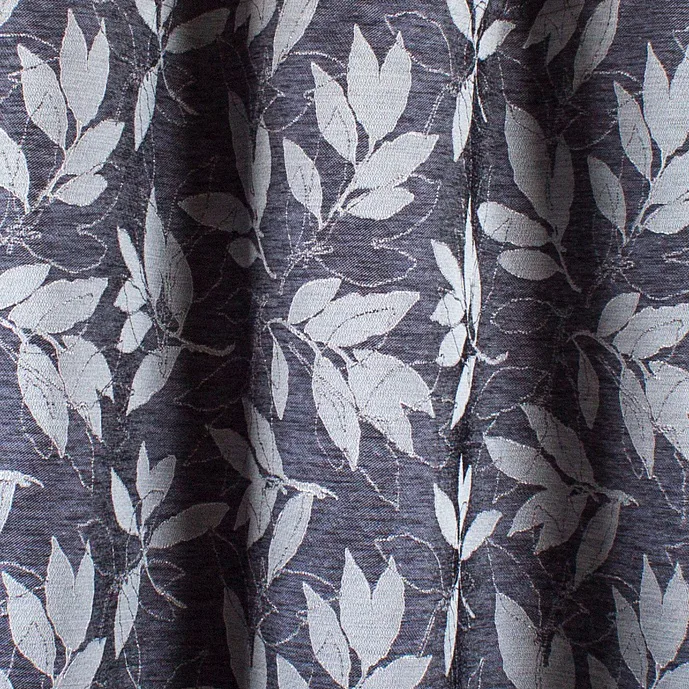 Látka má melírovanou, precizně tkanou proužkovanou strukturu doplněnou a vytkávaný lístečkový motiv v perfektně sladěných odstínech světlé a tmavě modré se stříbrnými konturami. Látka je částečně zatemňující, nejedná se o blackout. Příjemný matný lesk dodává závěsu nadčasovou eleganci.