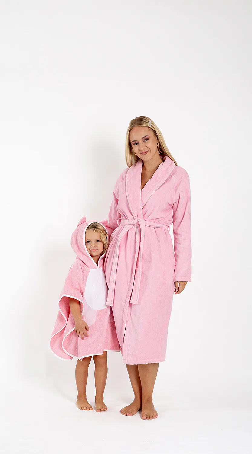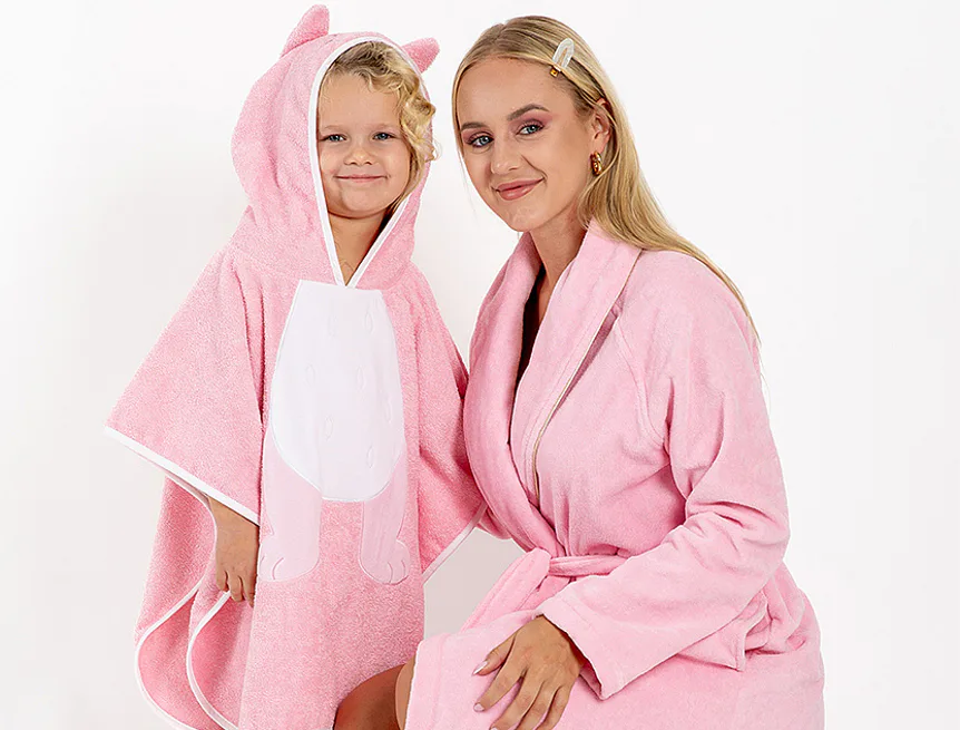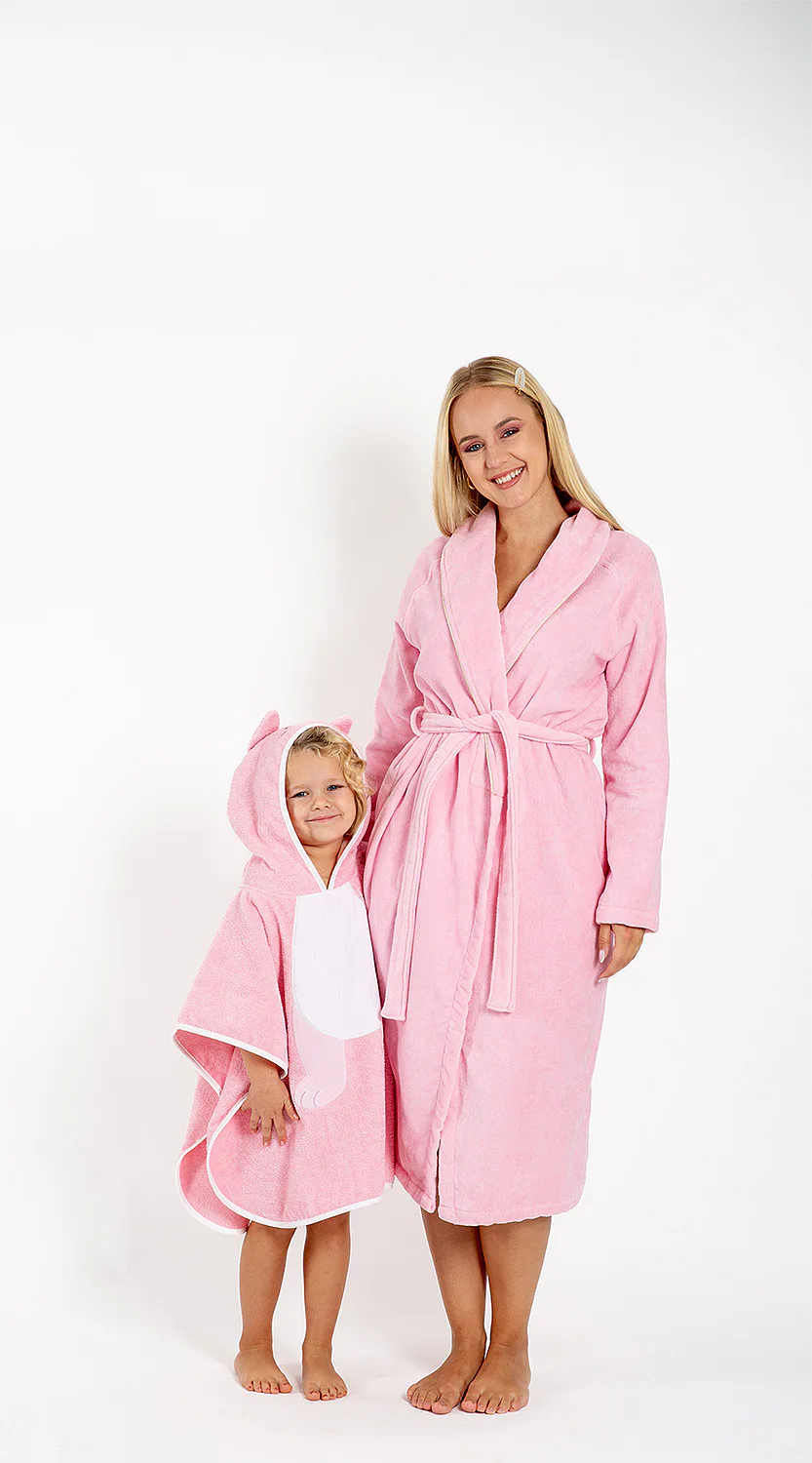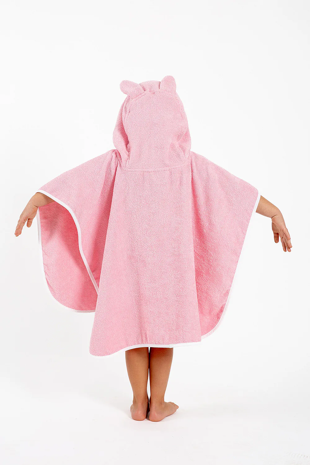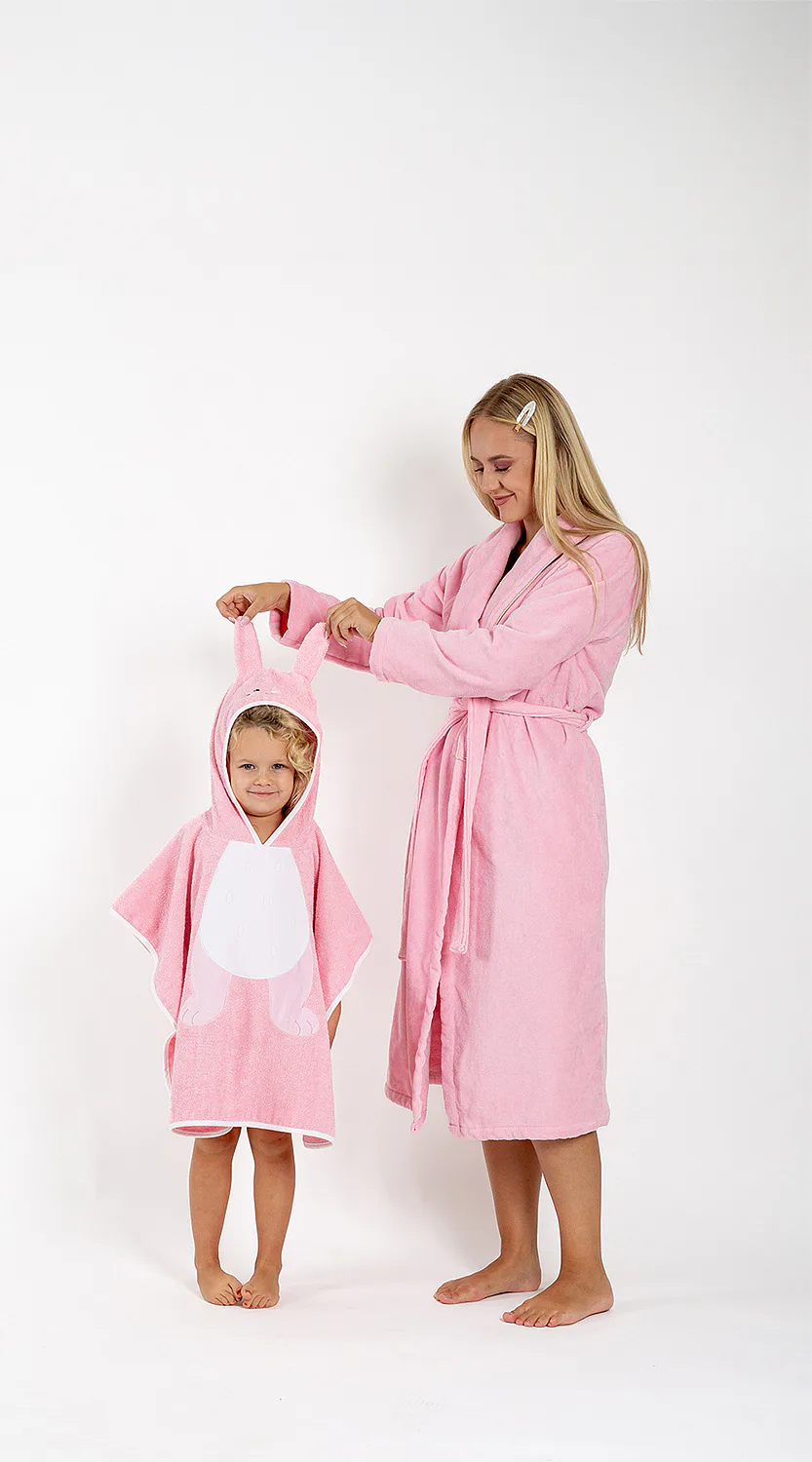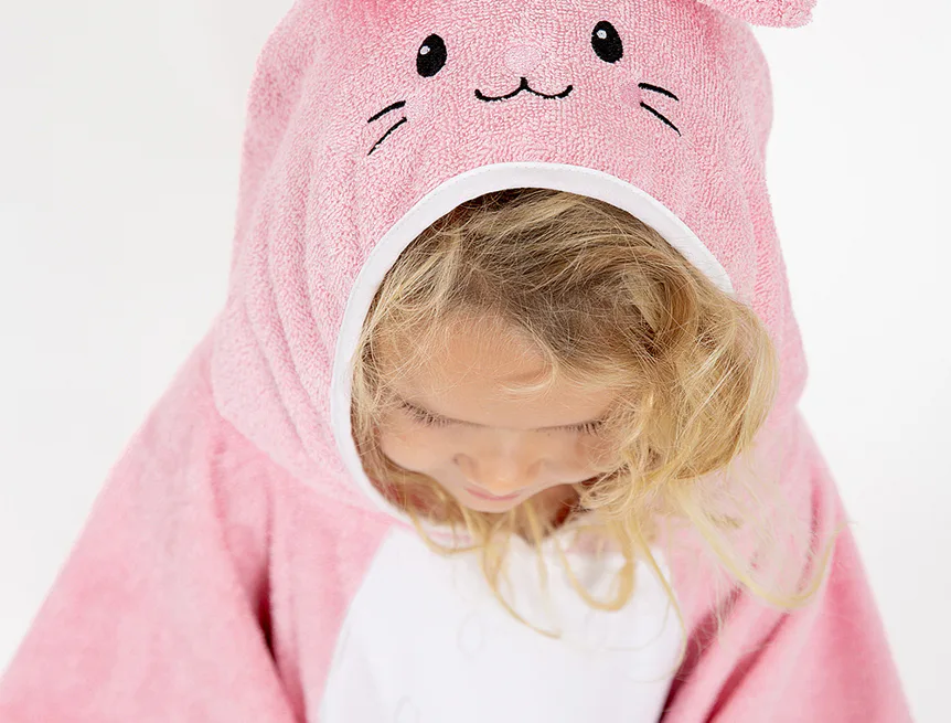 Dětské froté pončo se zvířecí výšivkou je ideální společník po koupeli, plavání nebo dovádění u moře. Výšivka s motivem zajíčka laděná do růžových tónů potěší hlavně malé princezny!