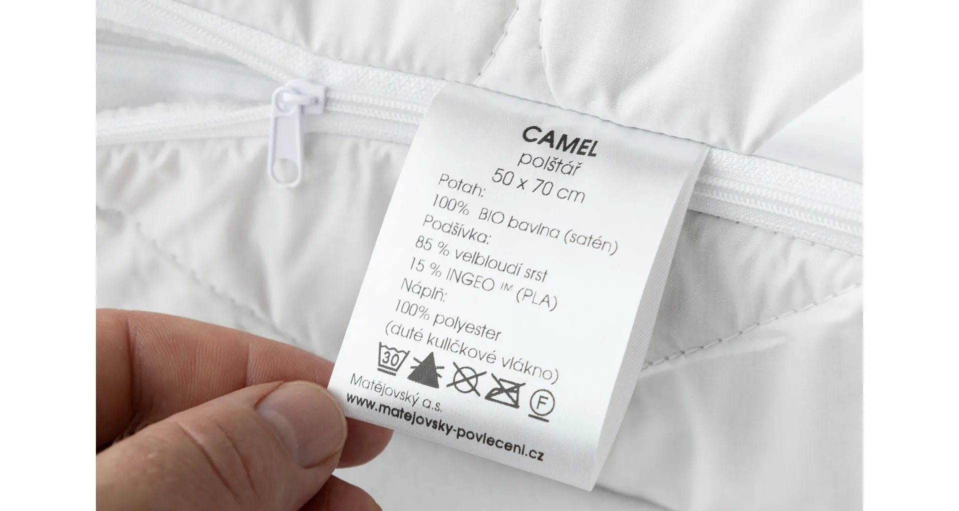 Velbloudí srst je u polštáře obsažena v podšívce vrchního bavlněného potahu, což je plně dostačující pro zajištění efektivní termoregulace, a zároveň praktické pro údržbu. Výplň polštáře tvoří polyesterové kuličky, díky kterým je náplň prodyšná a objemná, nesléhá a krásně se naklepává. V porovnání s polštáři plněnými dutým silikonizovaným vláknem je polštář Camel spíše tužší a poskytuje stabilní oporu.