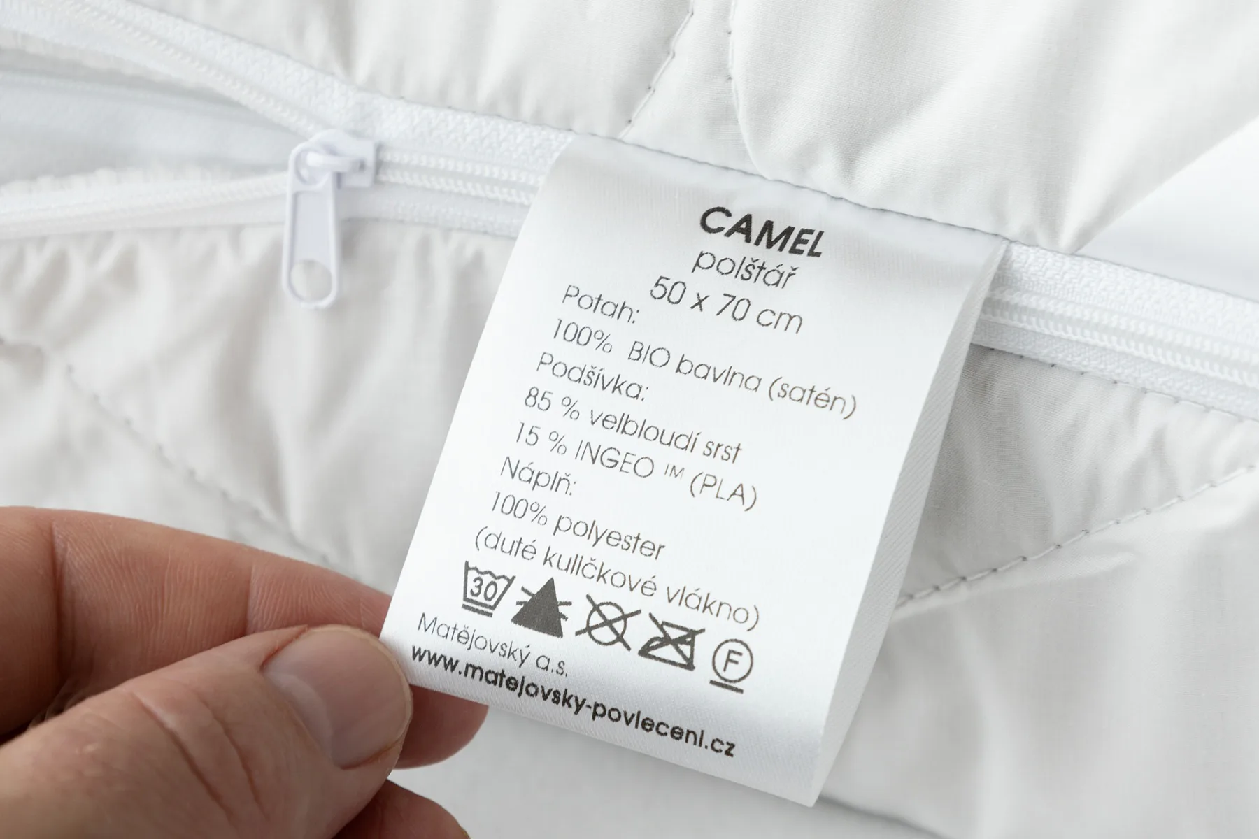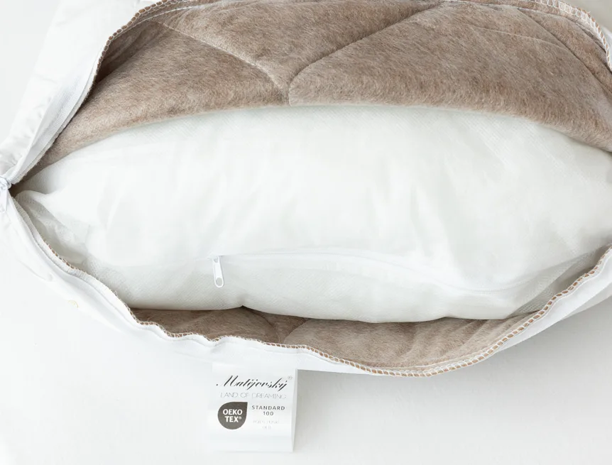 Velbloudí srst je u polštáře obsažena v podšívce vrchního bavlněného potahu, což je plně dostačující pro zajištění efektivní termoregulace, a zároveň praktické pro údržbu. Výplň polštáře tvoří polyesterové kuličky, díky kterým je náplň prodyšná a objemná, nesléhá a krásně se naklepává. V porovnání s polštáři plněnými dutým silikonizovaným vláknem je polštář Camel spíše tužší a poskytuje stabilní oporu.