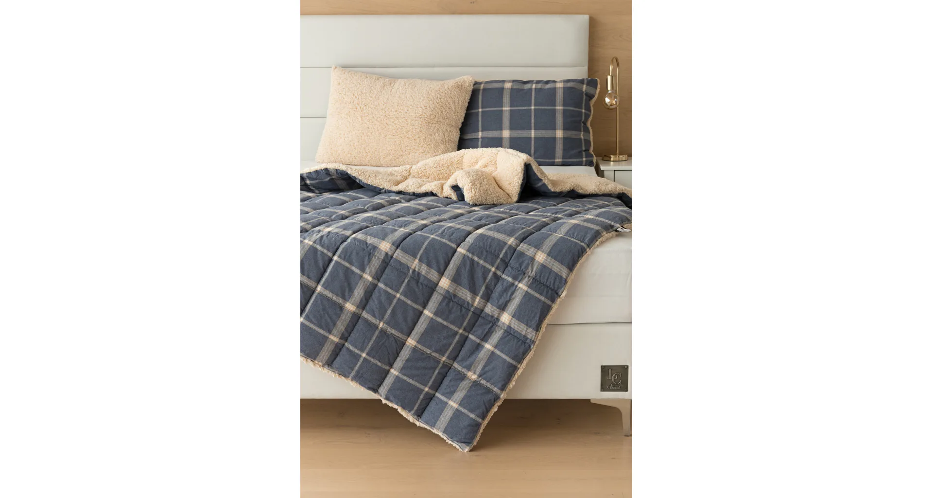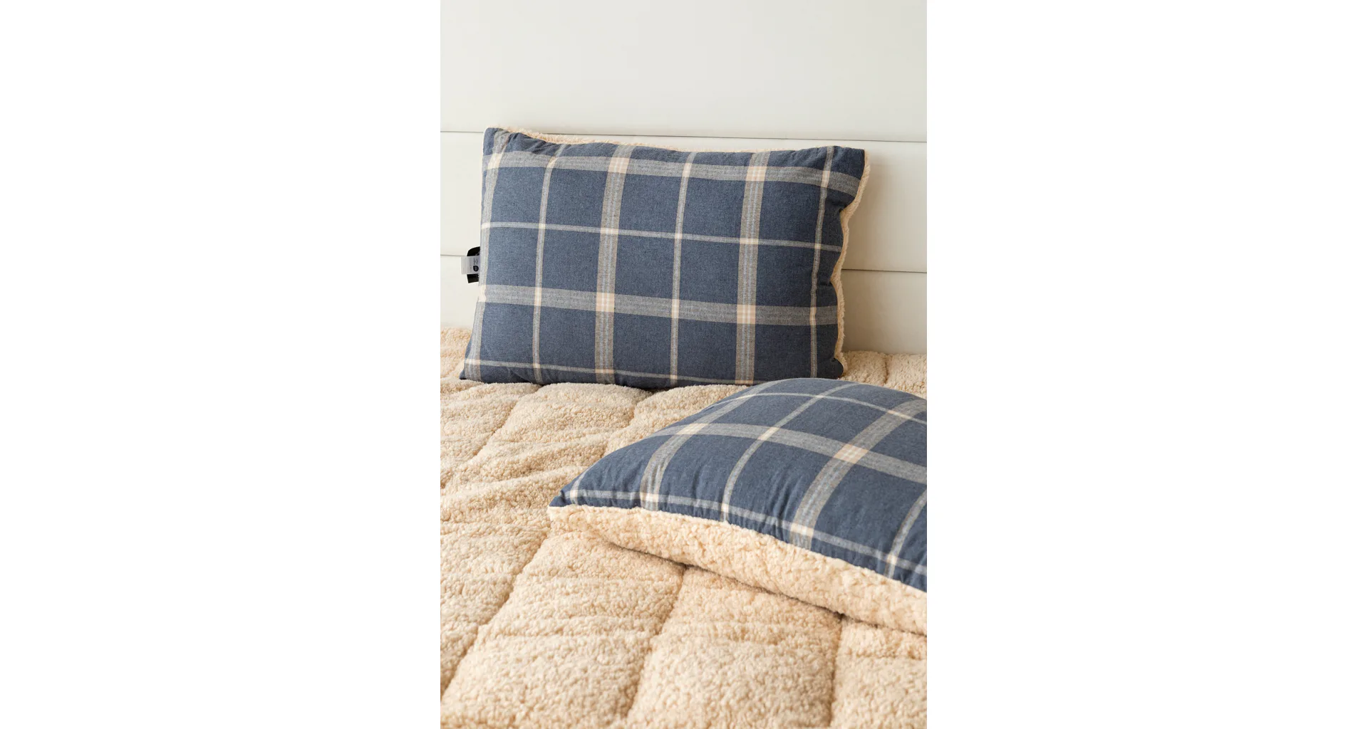 Jednoduchý, a přitom nesmírně poutavý vzor Daria tvoří nepravidelná béžová kostka na tmavě modrošedém podkladu. Spodní stranu zdobí barevně sladěný beránek v béžovém odstínu. K polštáři lze dokoupit také prošívanou přikrývku ve stejném designu.