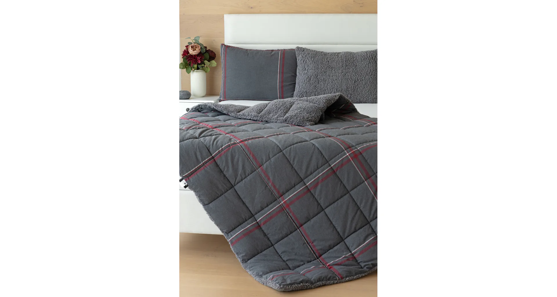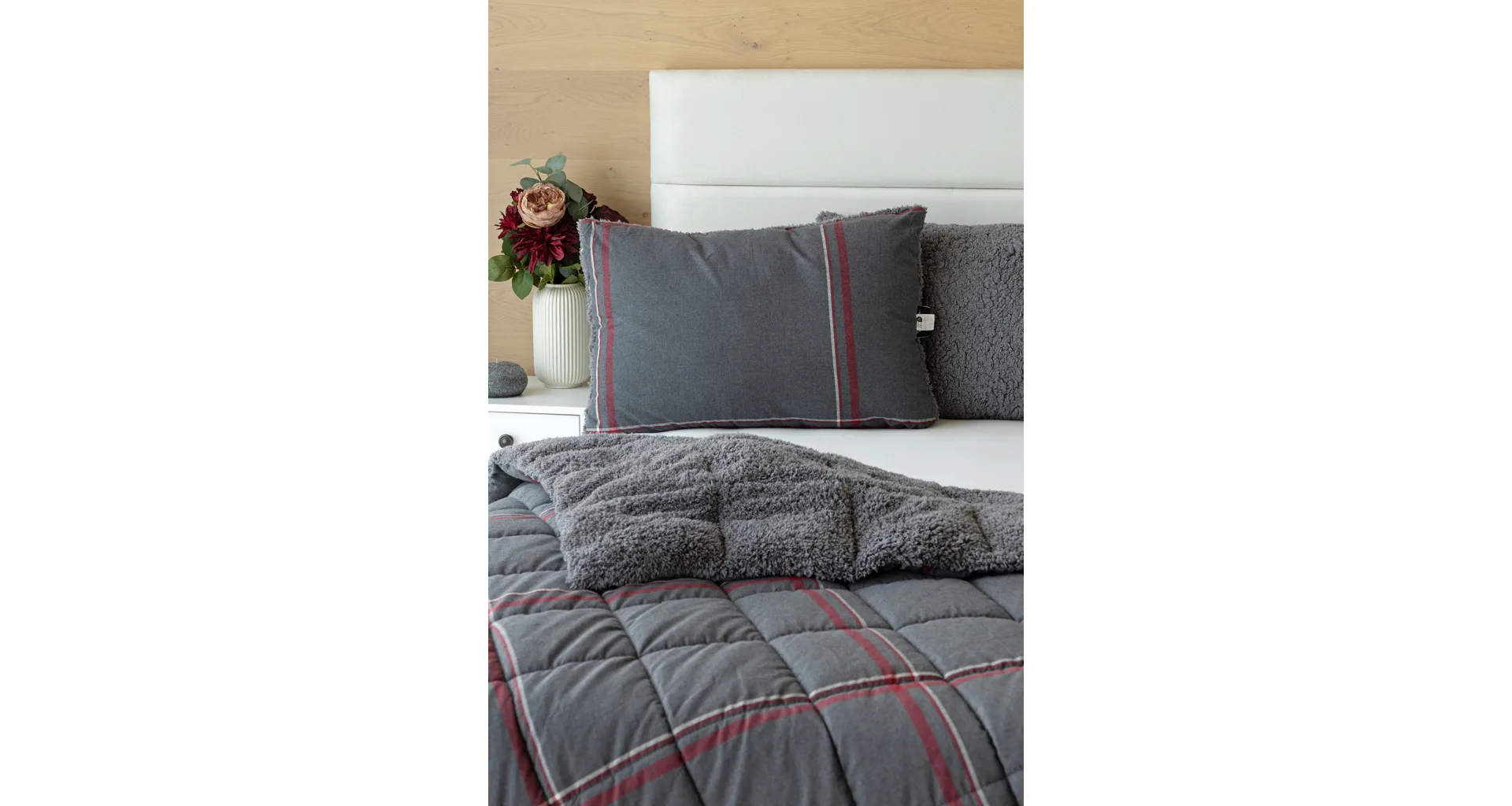 Atraktivní tmavě šedý podklad polštáře Ida protíná bílá a vínově červená linka, spodní stranu zdobí barevně sladěný beránek v tmavě šedém odstínu. K polštáři lze dokoupit také prošívanou přikrývku ve stejném designu.