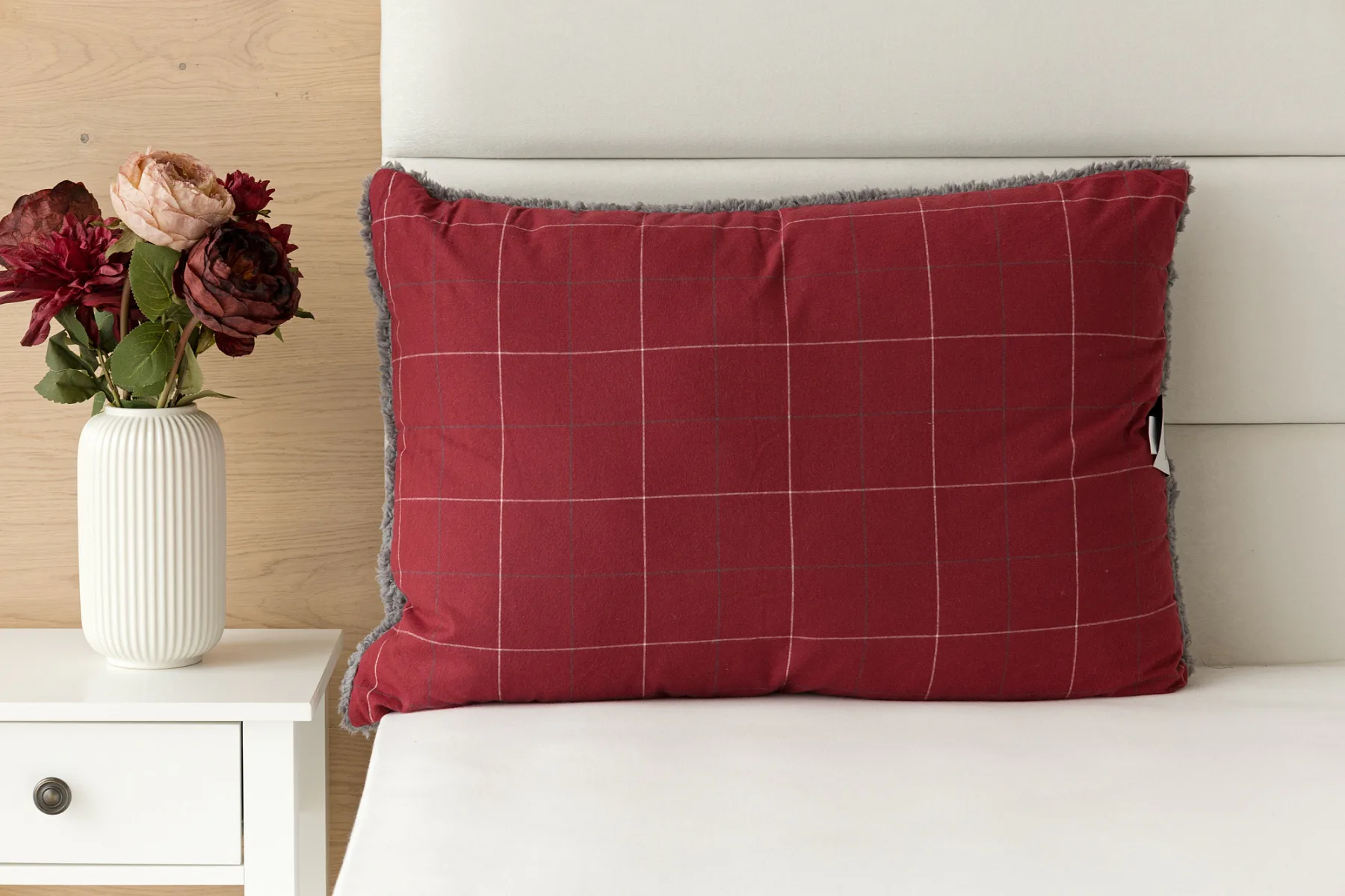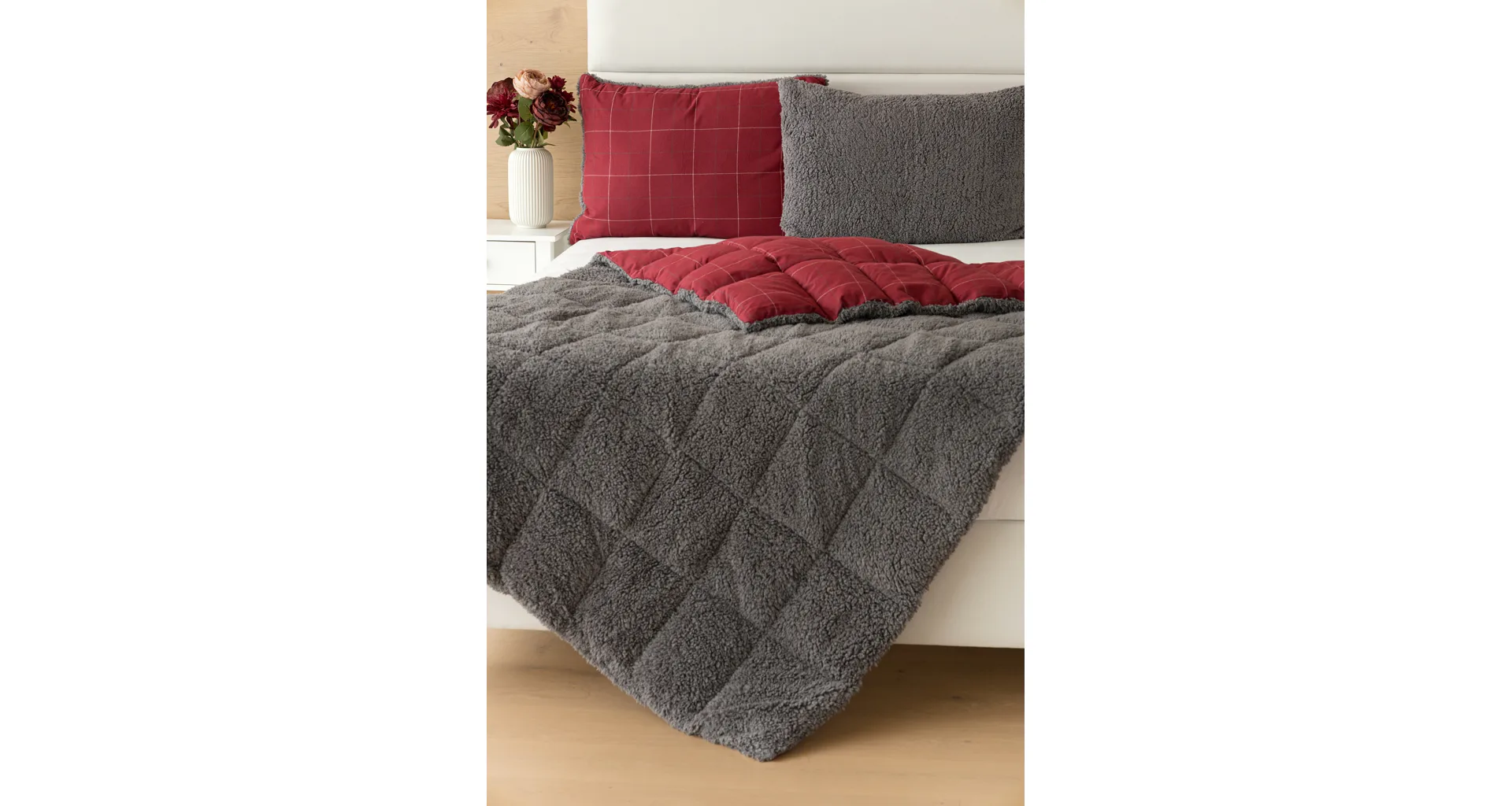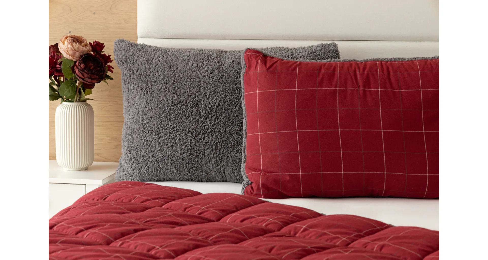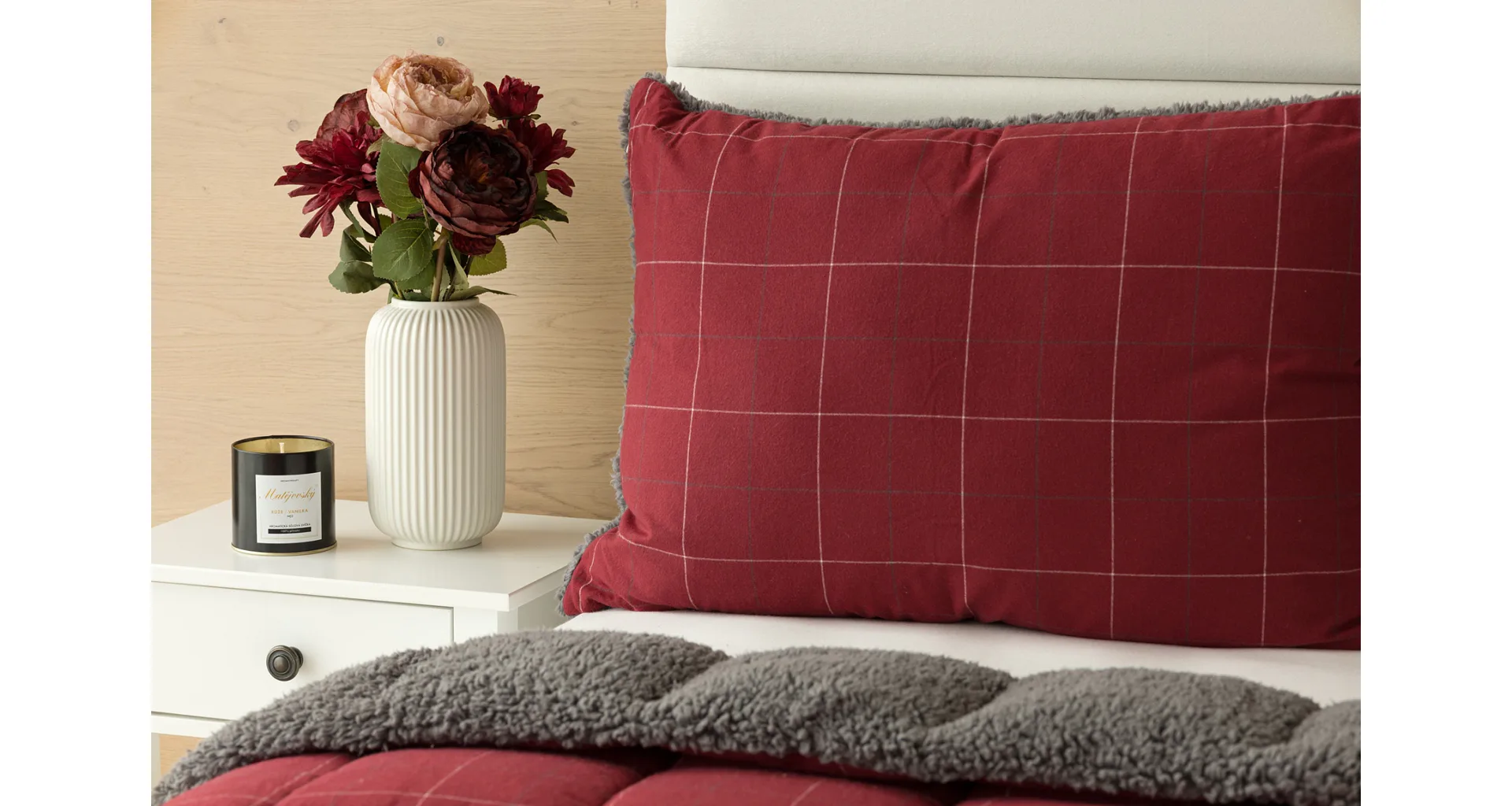 Vzor Linda ve sváteční červené barvě s jemným kostkovaným motivem doplňuje tmavě šedý beránek. K polštáři lze dokoupit také prošívanou přikrývku ve stejném designu.