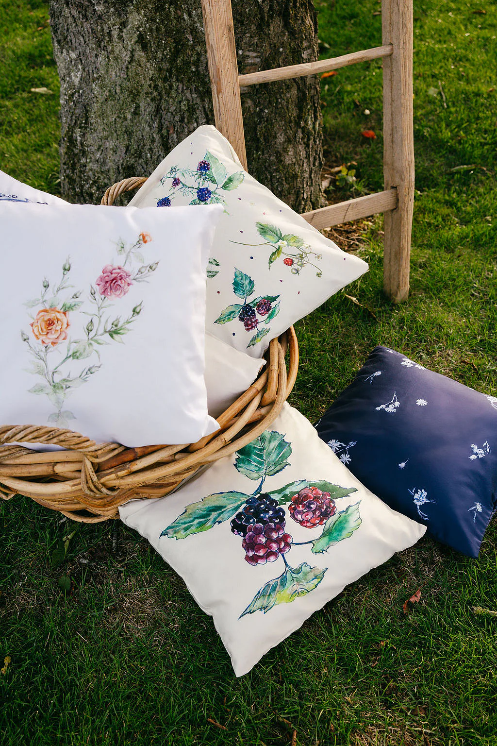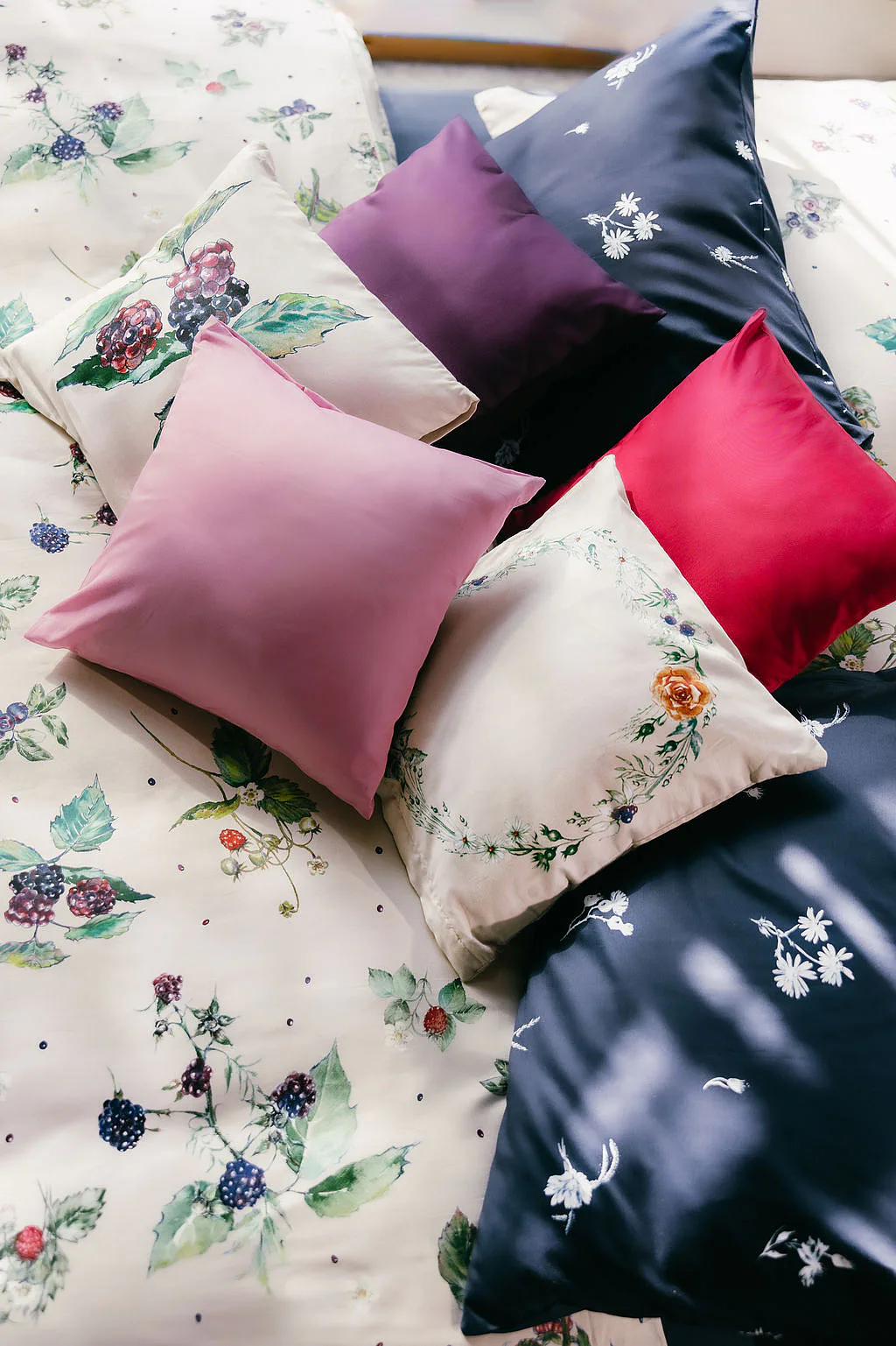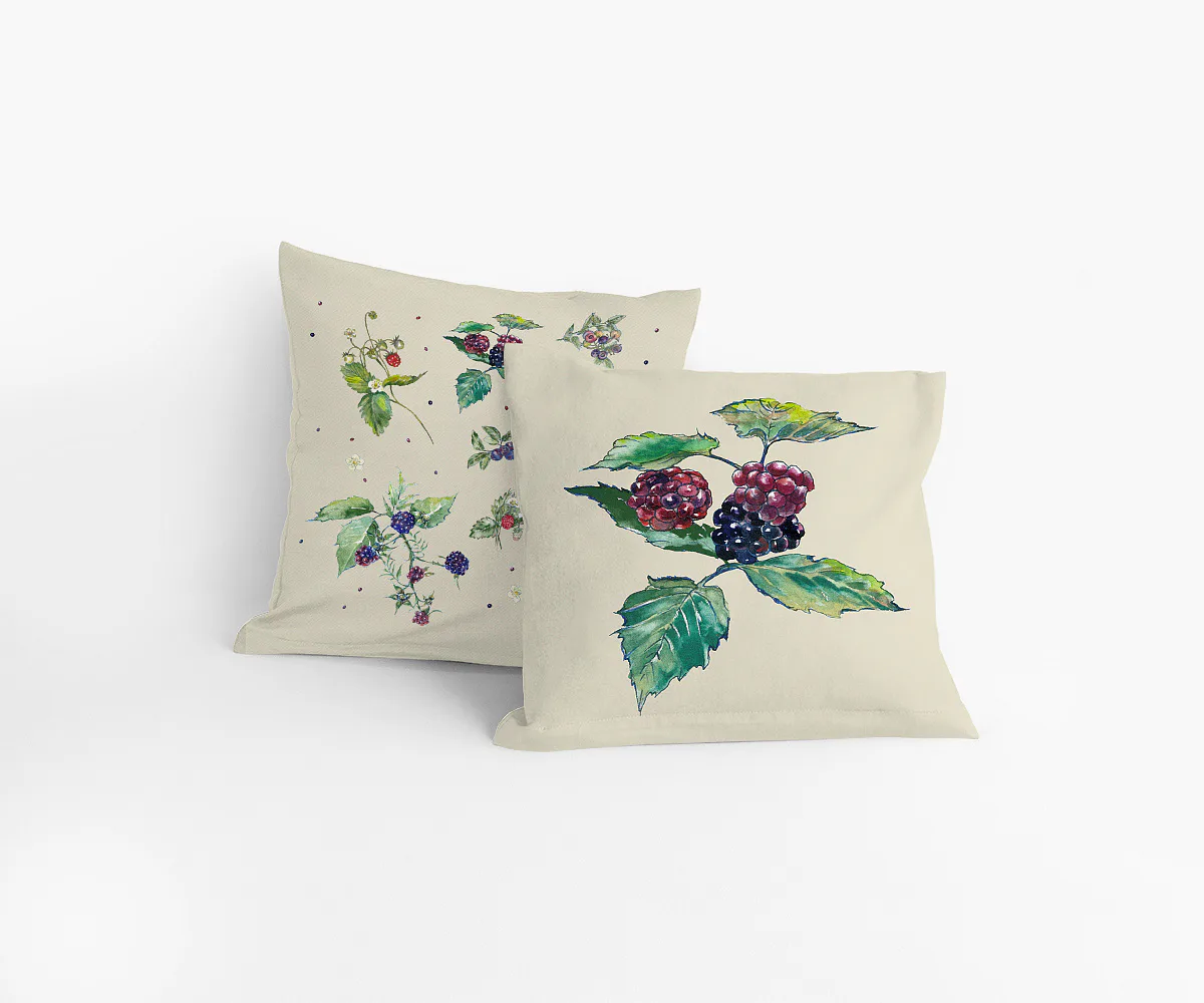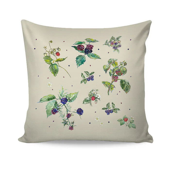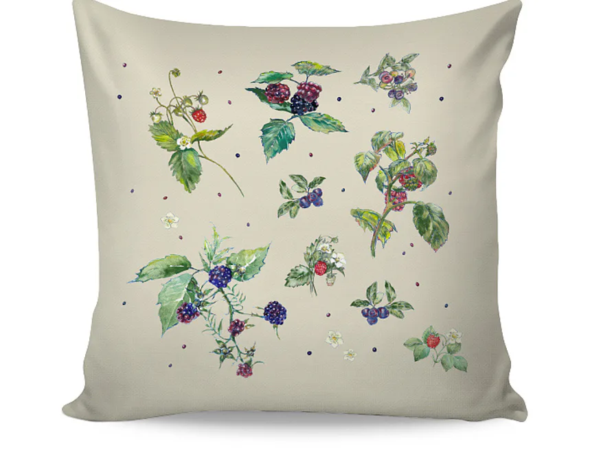 Hřejivé „berries“ v akvarelové malbě na béžovém podkladu. 100% bavlněný satén, oboustranný tisk, zipový uzávěr. Útulnost s moderním nádechem.