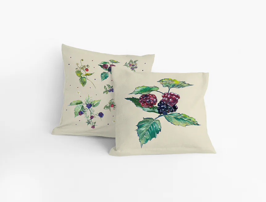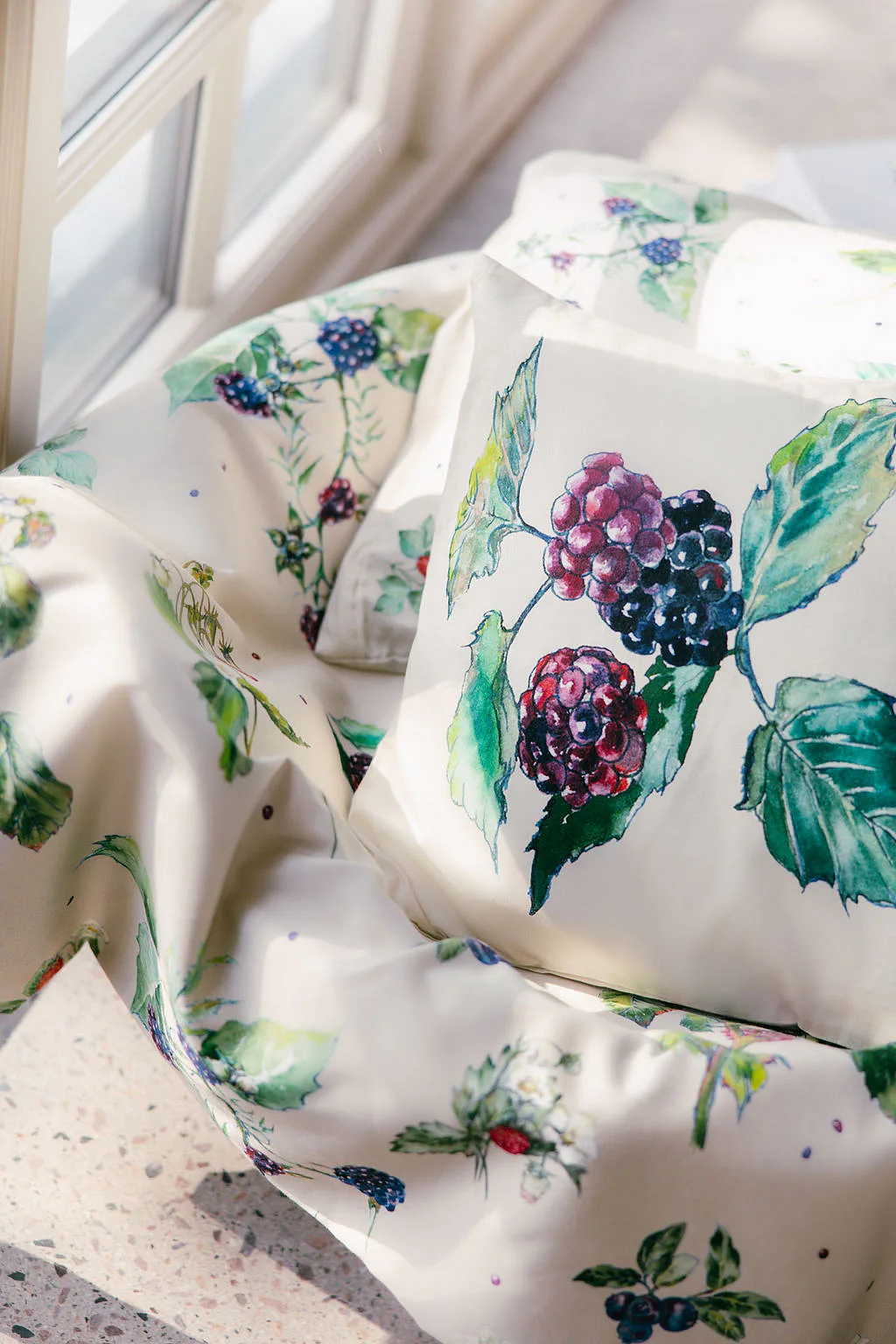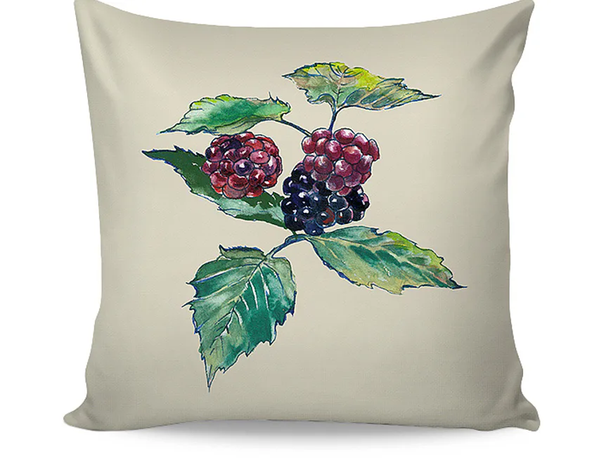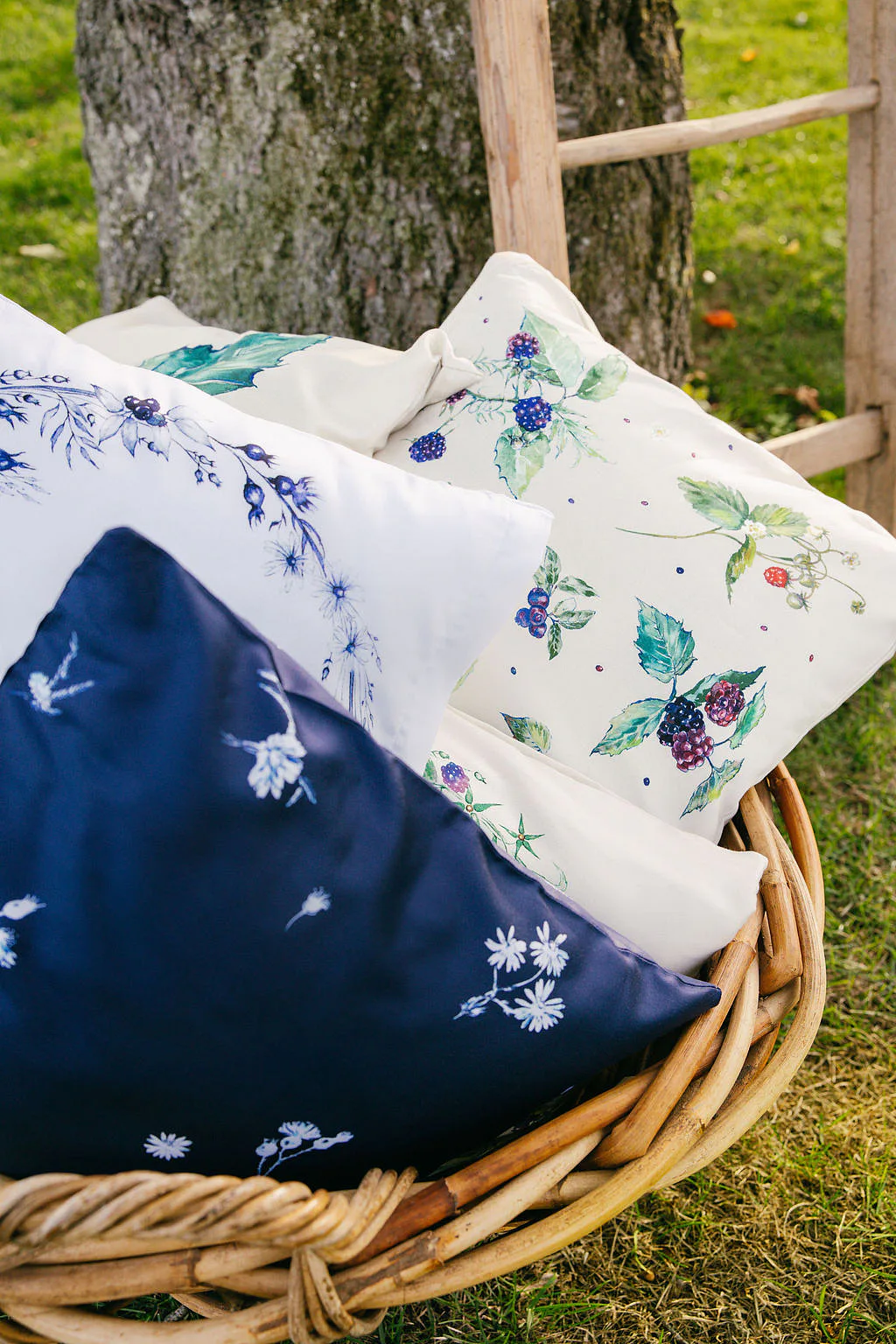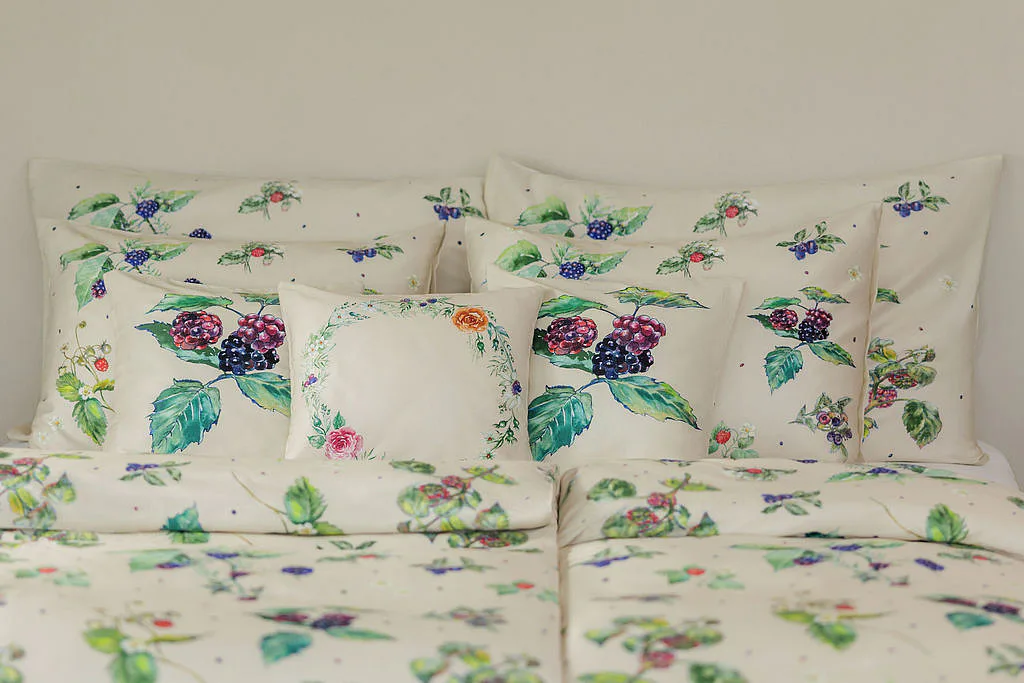 Hřejivé „berries“ v akvarelové malbě na béžovém podkladu. 100% bavlněný satén, oboustranný tisk, zipový uzávěr. Útulnost s moderním nádechem.