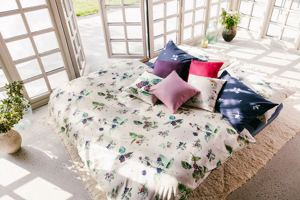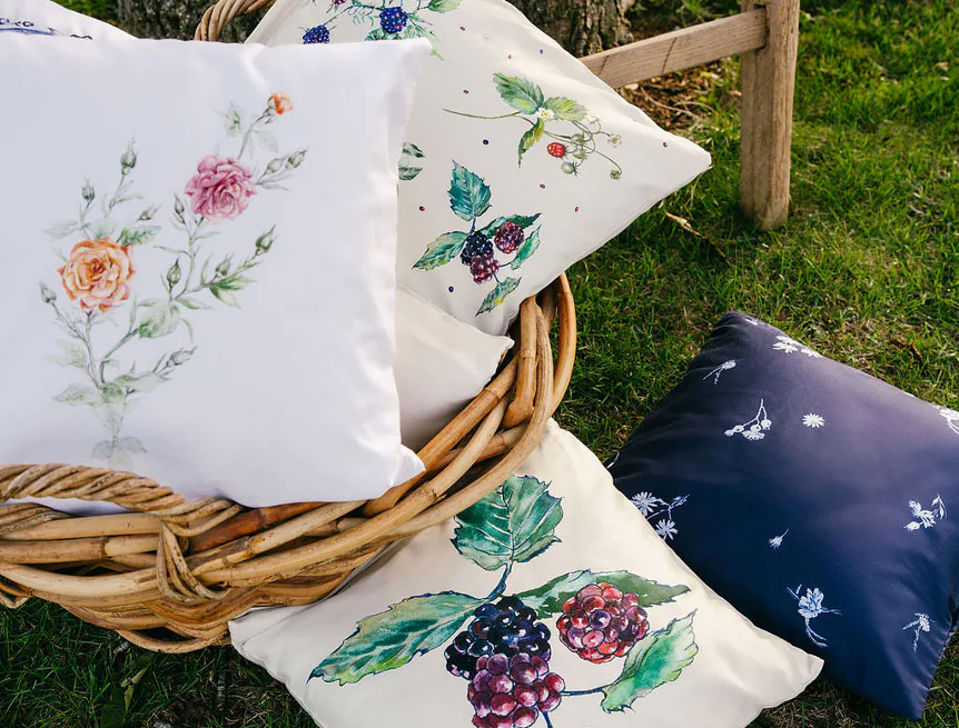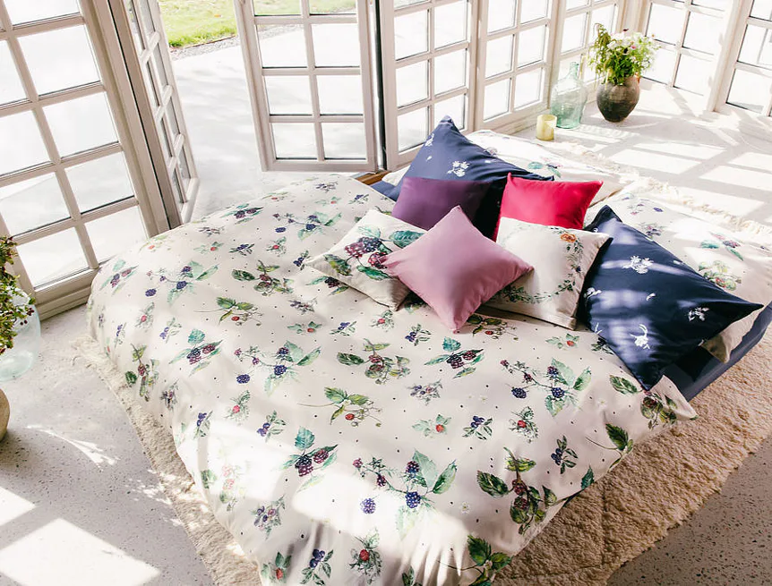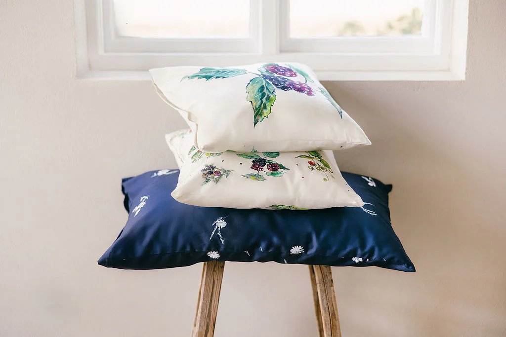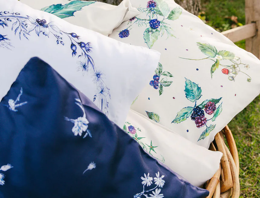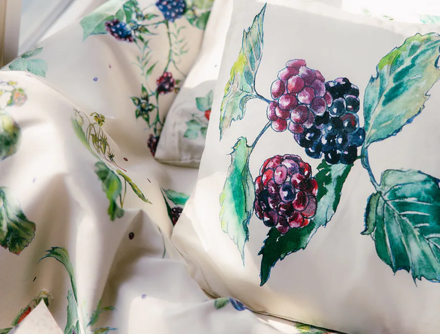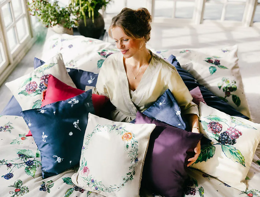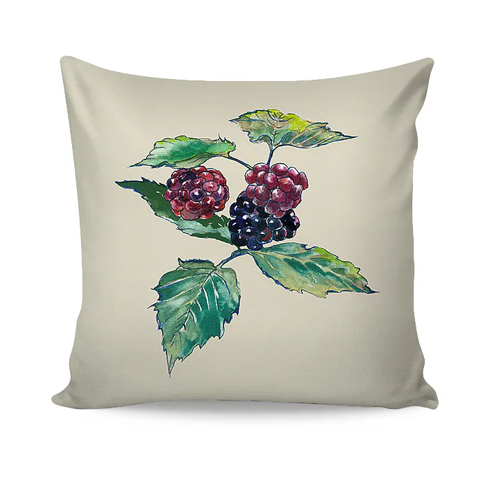 Hřejivé „berries“ v akvarelové malbě na béžovém podkladu. 100% bavlněný satén, oboustranný tisk, zipový uzávěr. Útulnost s moderním nádechem.