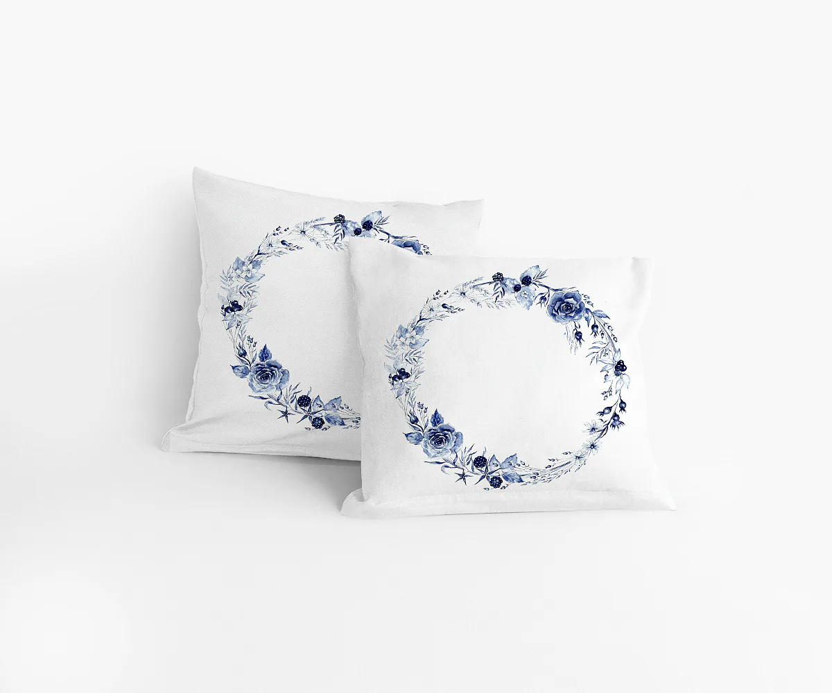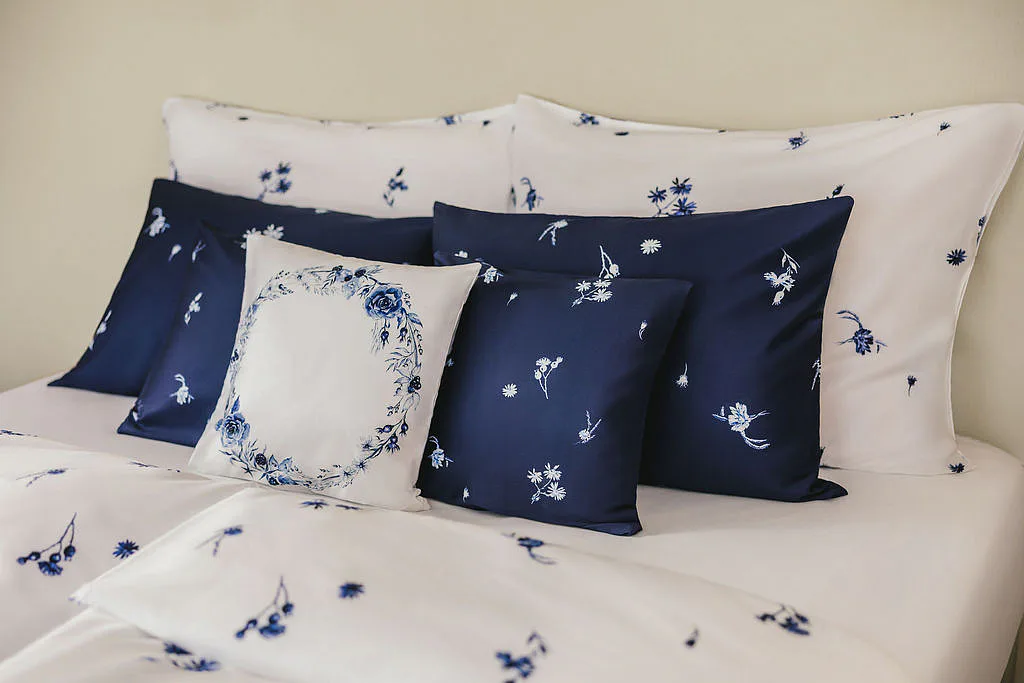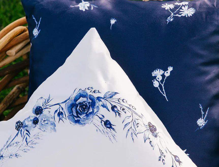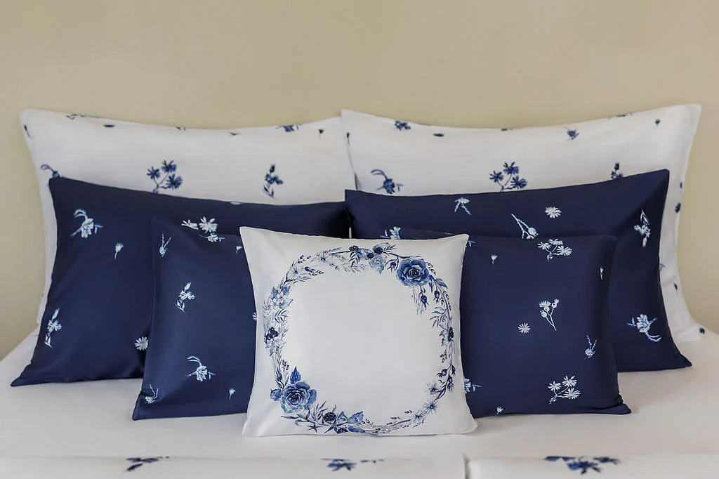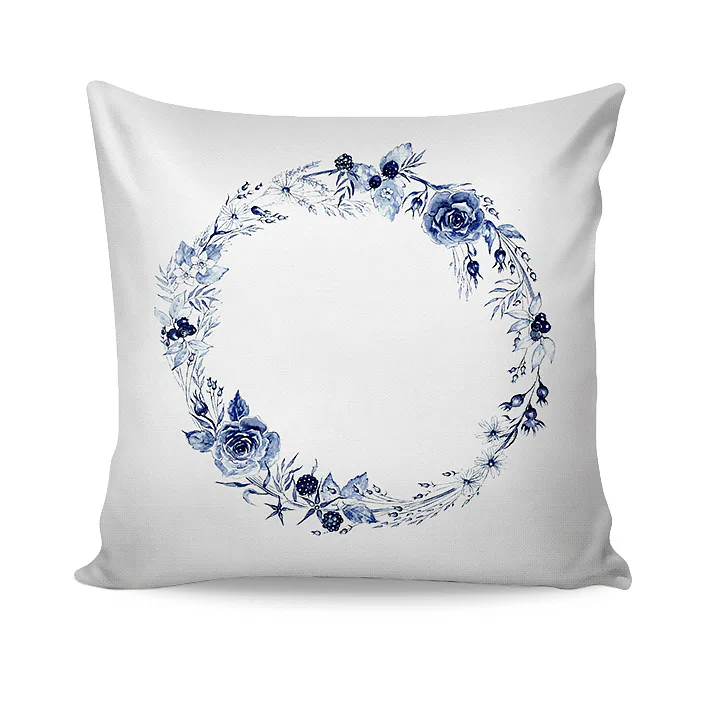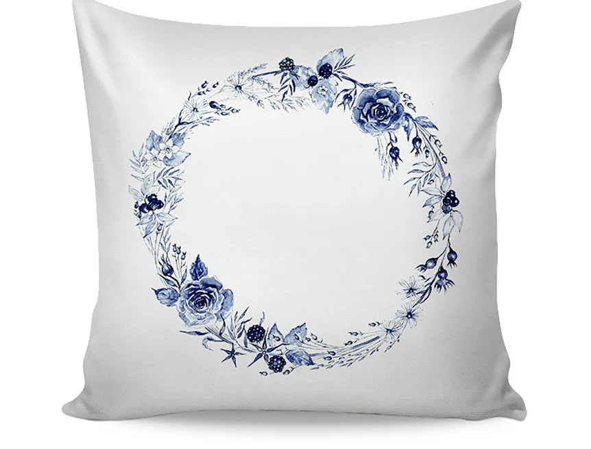 Nadčasová modrobílá v autorském věnci na 100% bavlněném saténu. Oboustranný motiv, zipový uzávěr. Elegance, která sluší chalupě i městskému bytu.