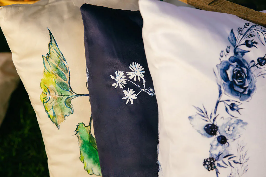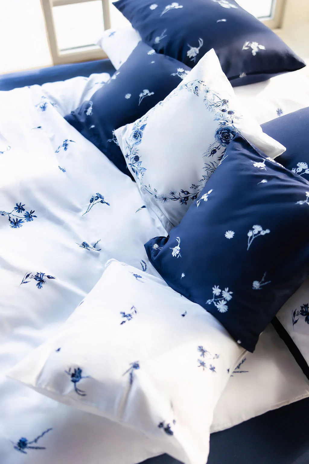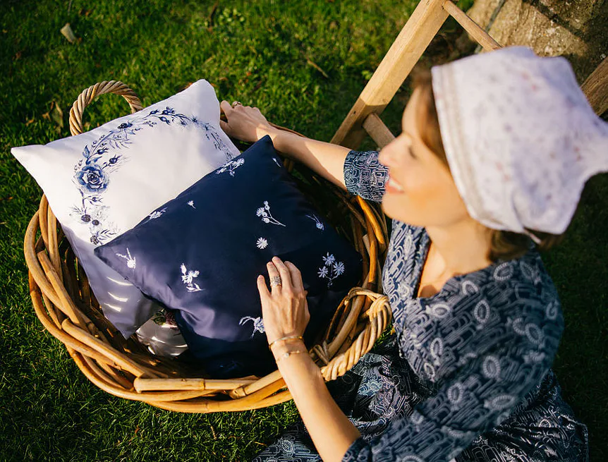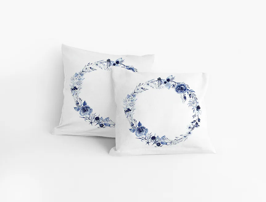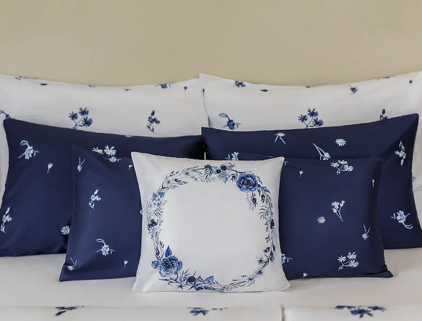 Nadčasová modrobílá v autorském věnci na 100% bavlněném saténu. Oboustranný motiv, zipový uzávěr. Elegance, která sluší chalupě i městskému bytu.