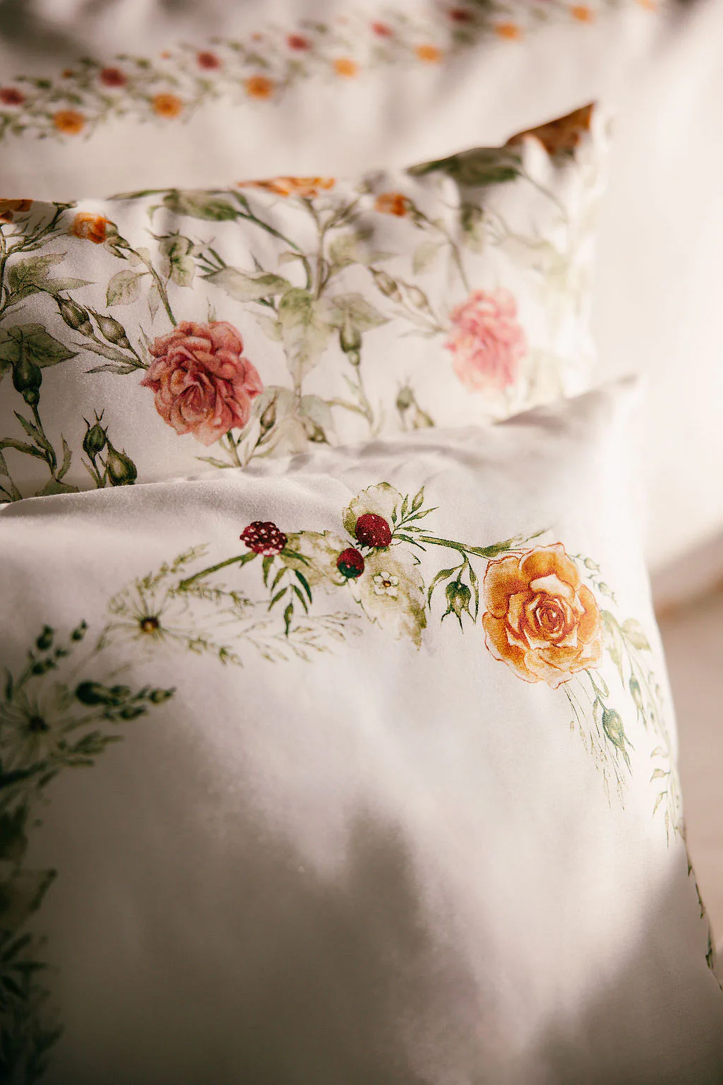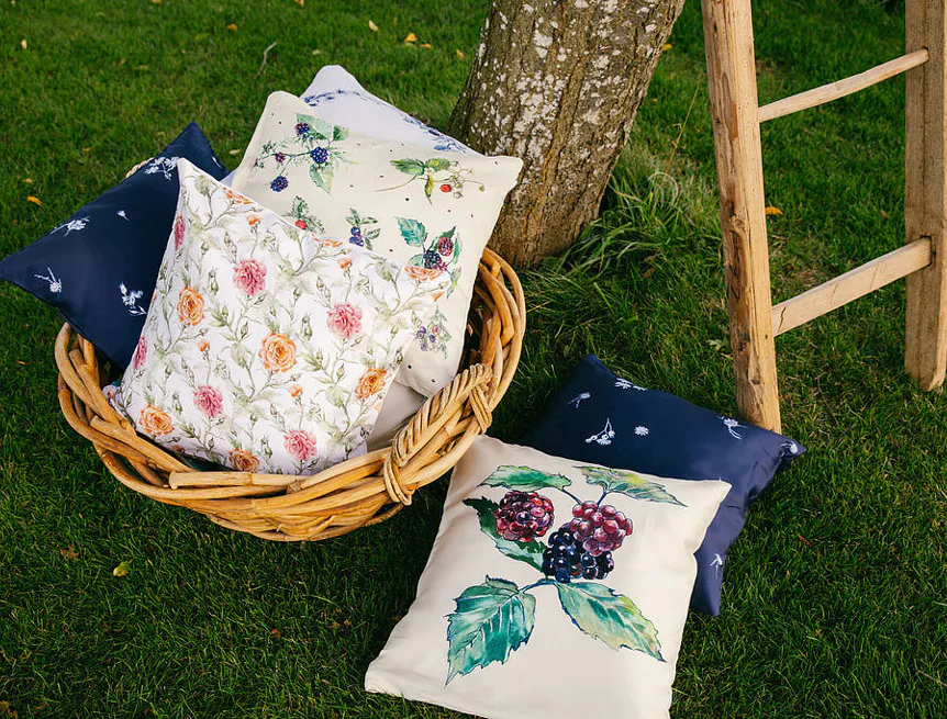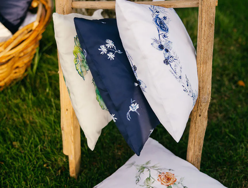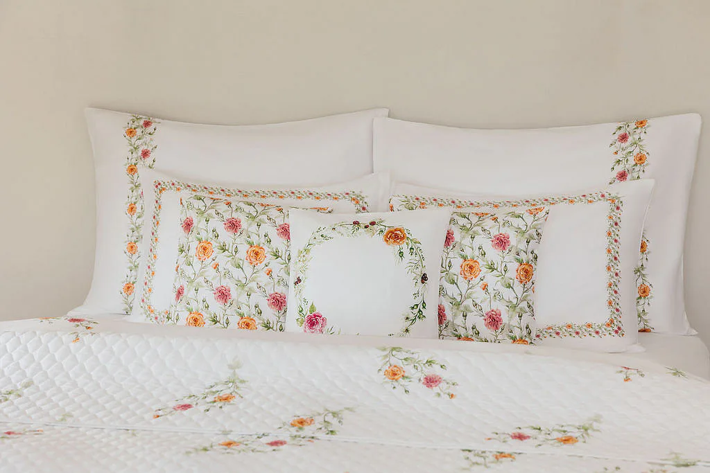 Jemný výřez motivu růže na 100% bavlněném saténu s leskem. Oboustranný tisk, komfortní zipový uzávěr. Originální porcelánová elegance do každého interiéru.