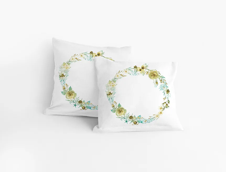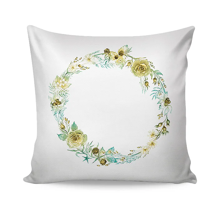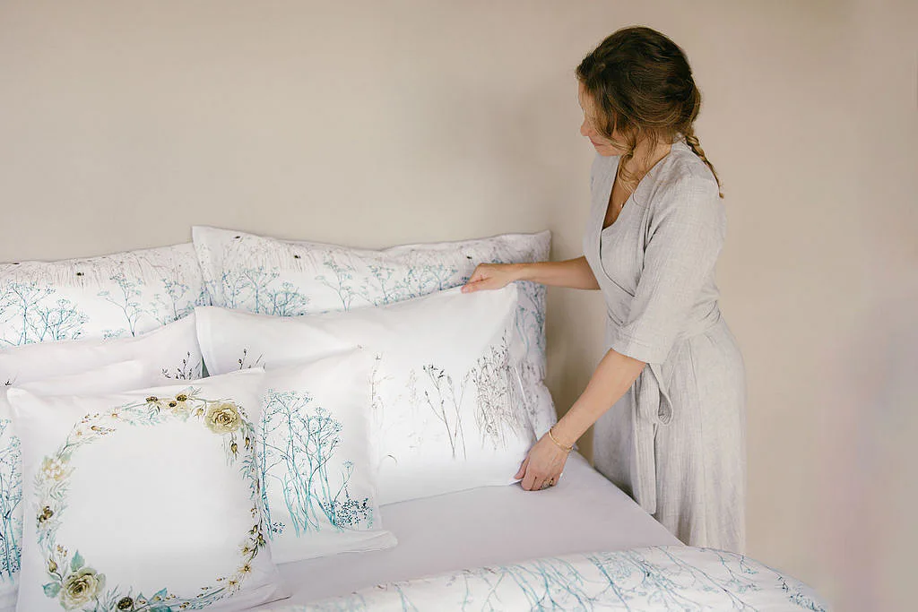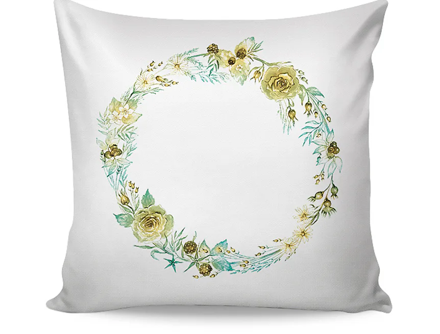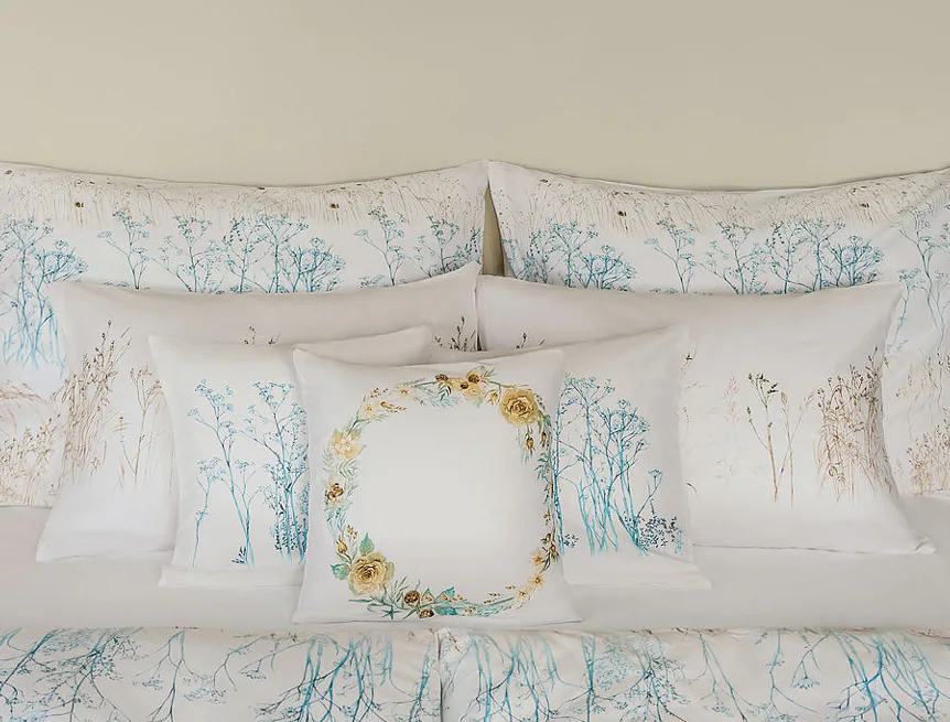 Poetika stébel v autorském věnci na 100% bavlněném saténu. Jemná grafika, oboustranný motiv, zip. Minimalisticky romantický akcent.