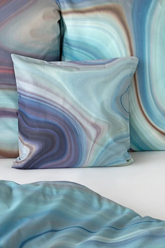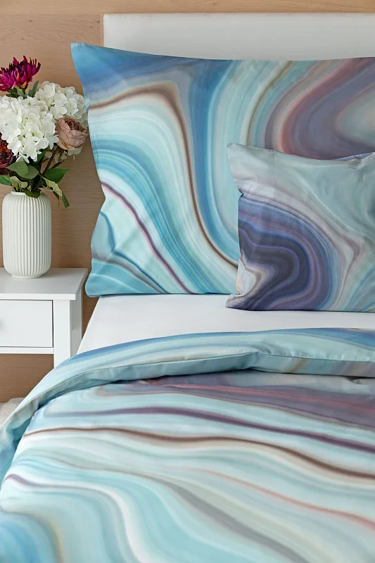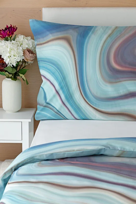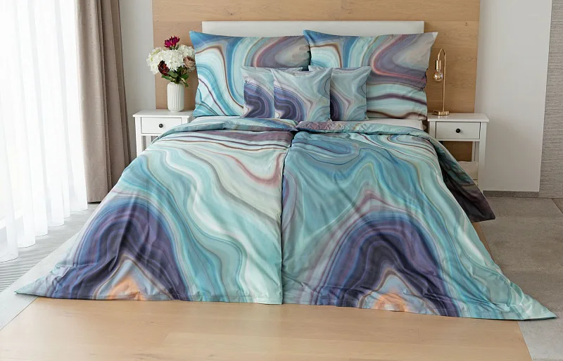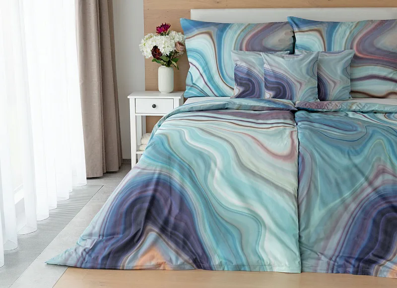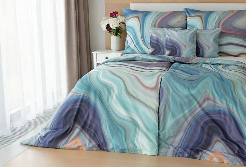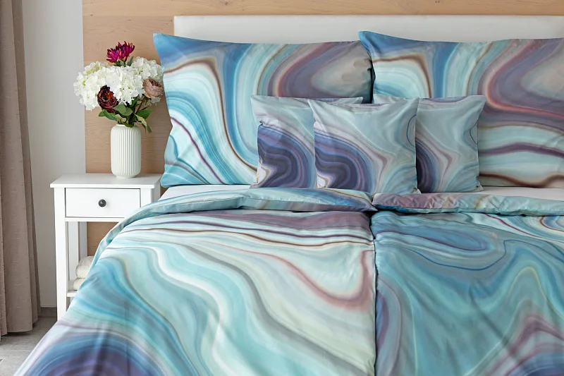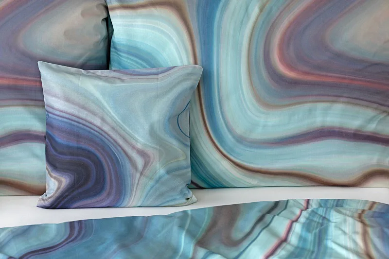 Moderní povlečení Achát se stane skutečným klenotem nejen minimalisticky zařízené ložnice. Nechte se okouzlit noblesně sladěnými barvami, ve kterých se odrážejí jemné tóny odstínů modré, šedé, fialové, starorůžové i zlatavě hnědé.