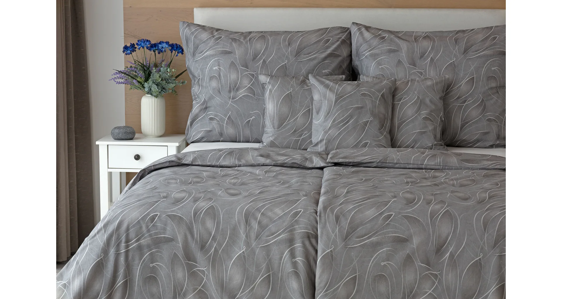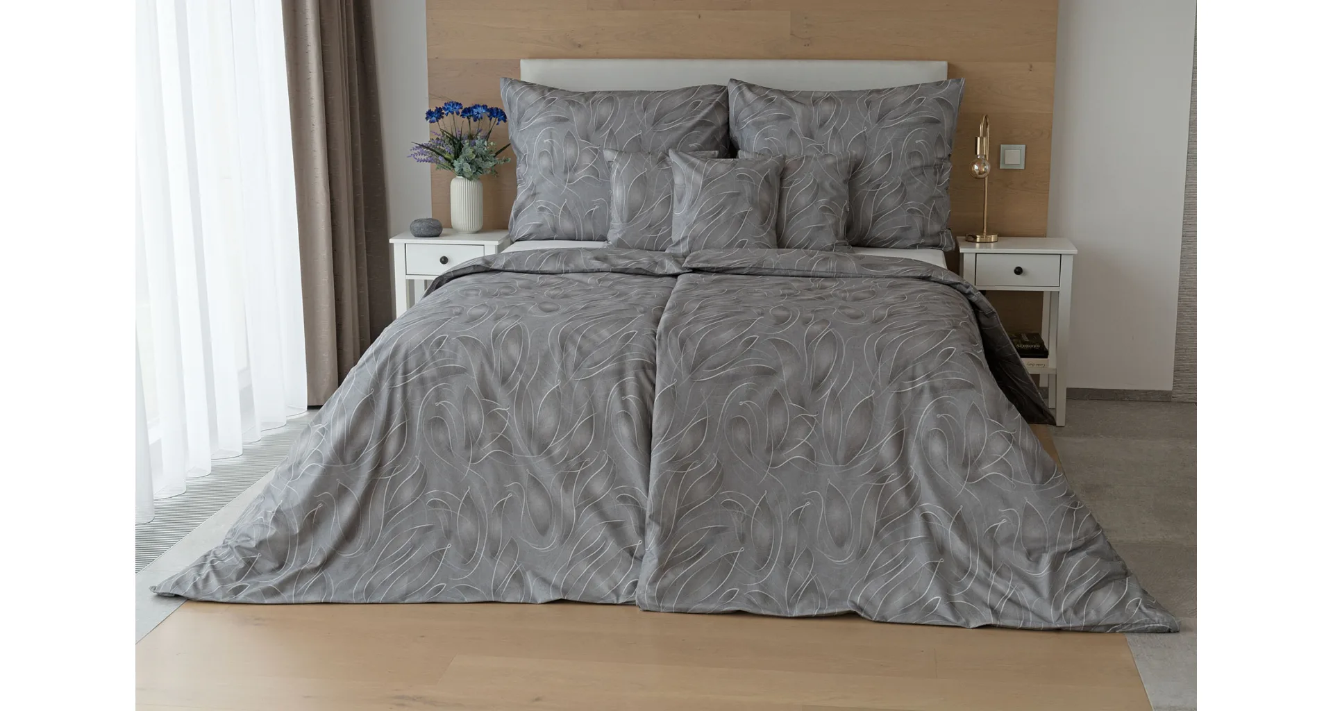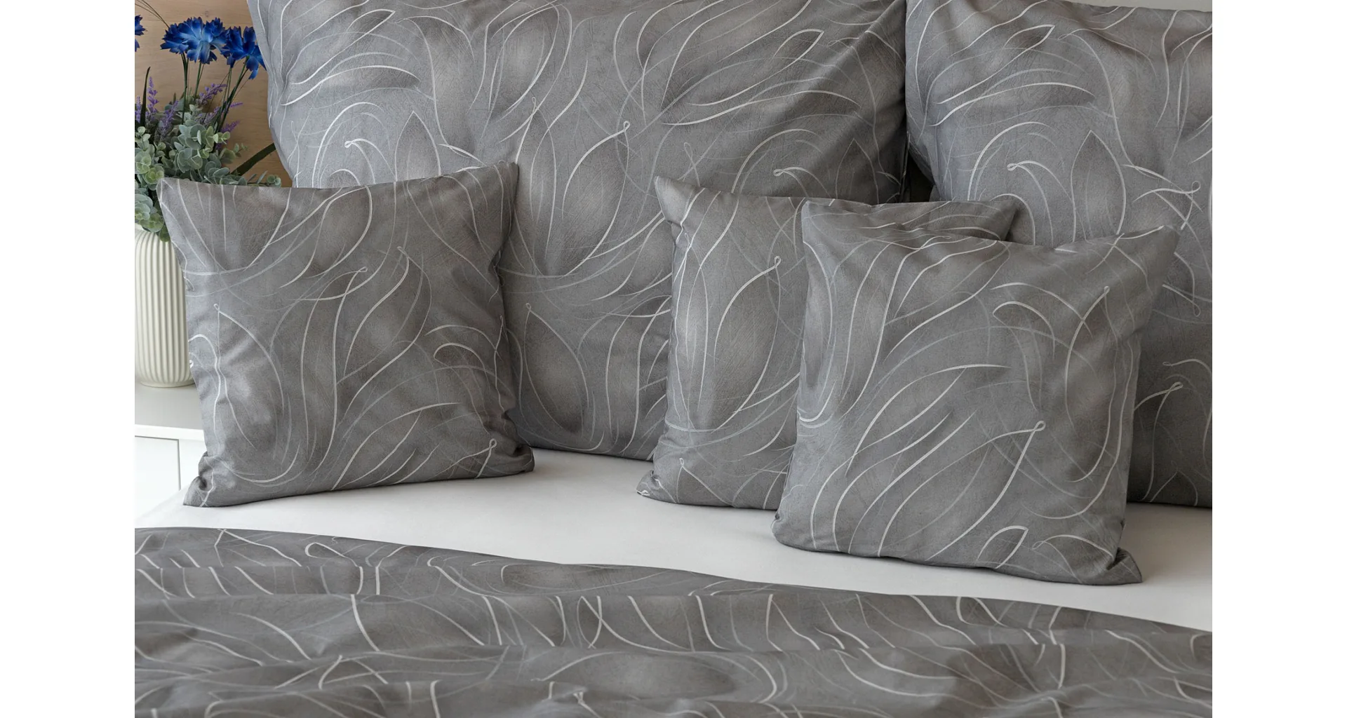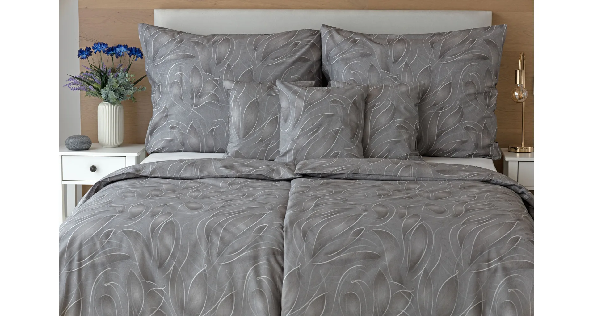S bavlněným povlečením Adeline bude vaše ložnice elegantní a vždy dokonalá. Světlé kontury decentního lístkového vzoru vynikají na antracitově šedém podkladu. Celý vzor podtrhuje důmyslné stínování, o které se postarala nejmodernější digitální tisková technologie.