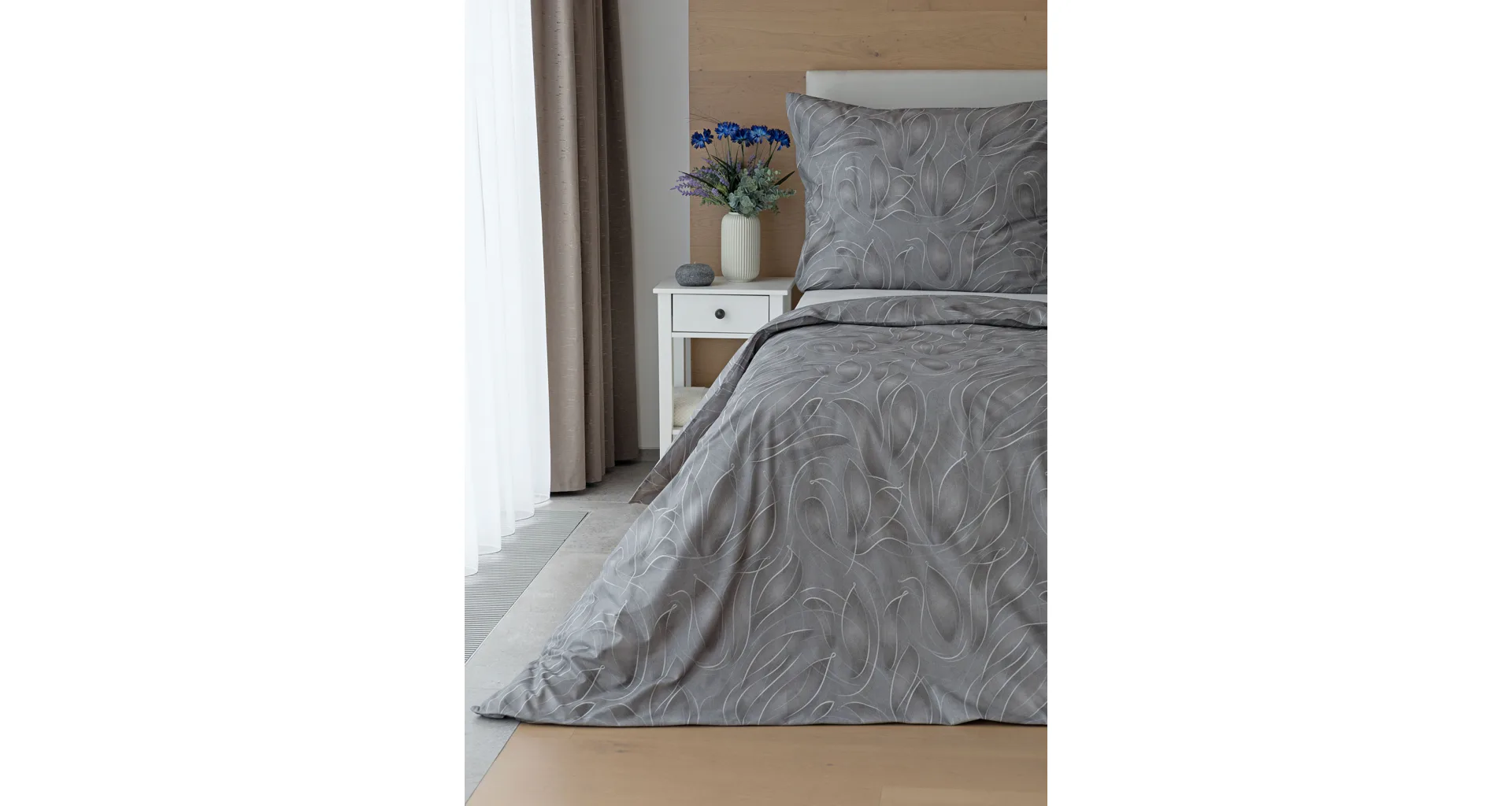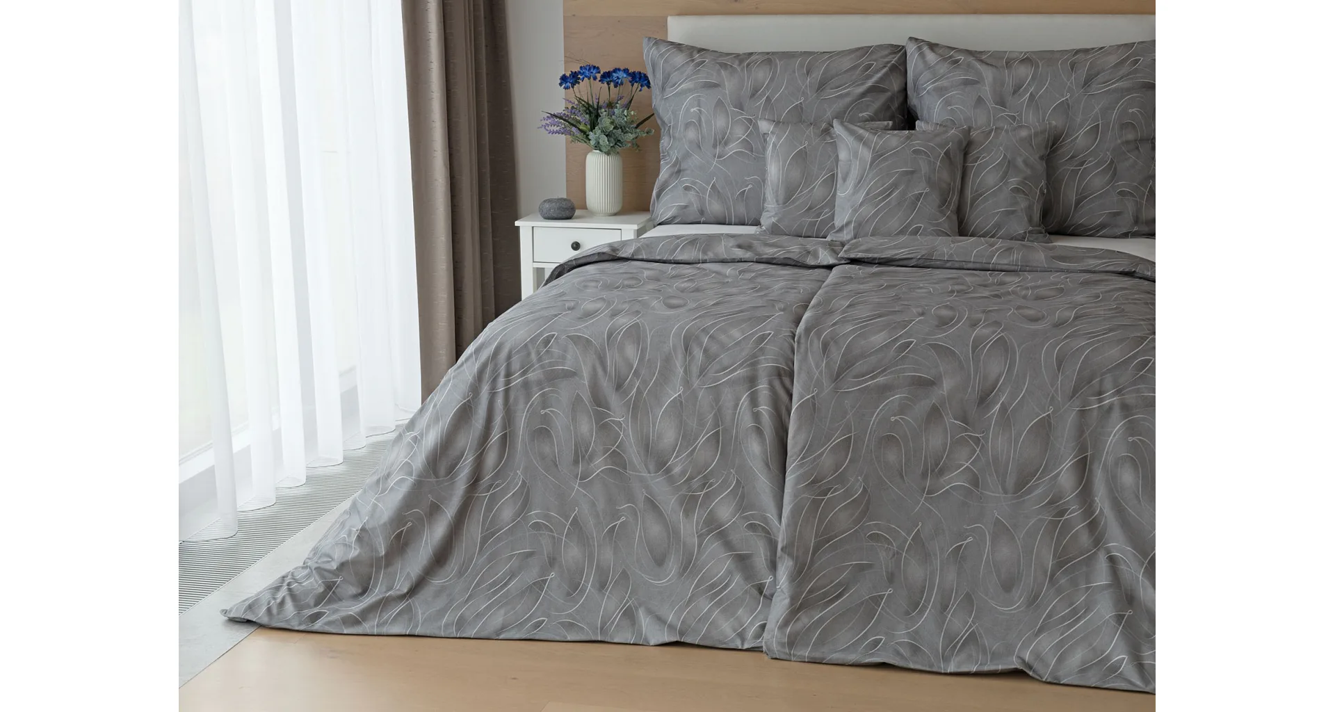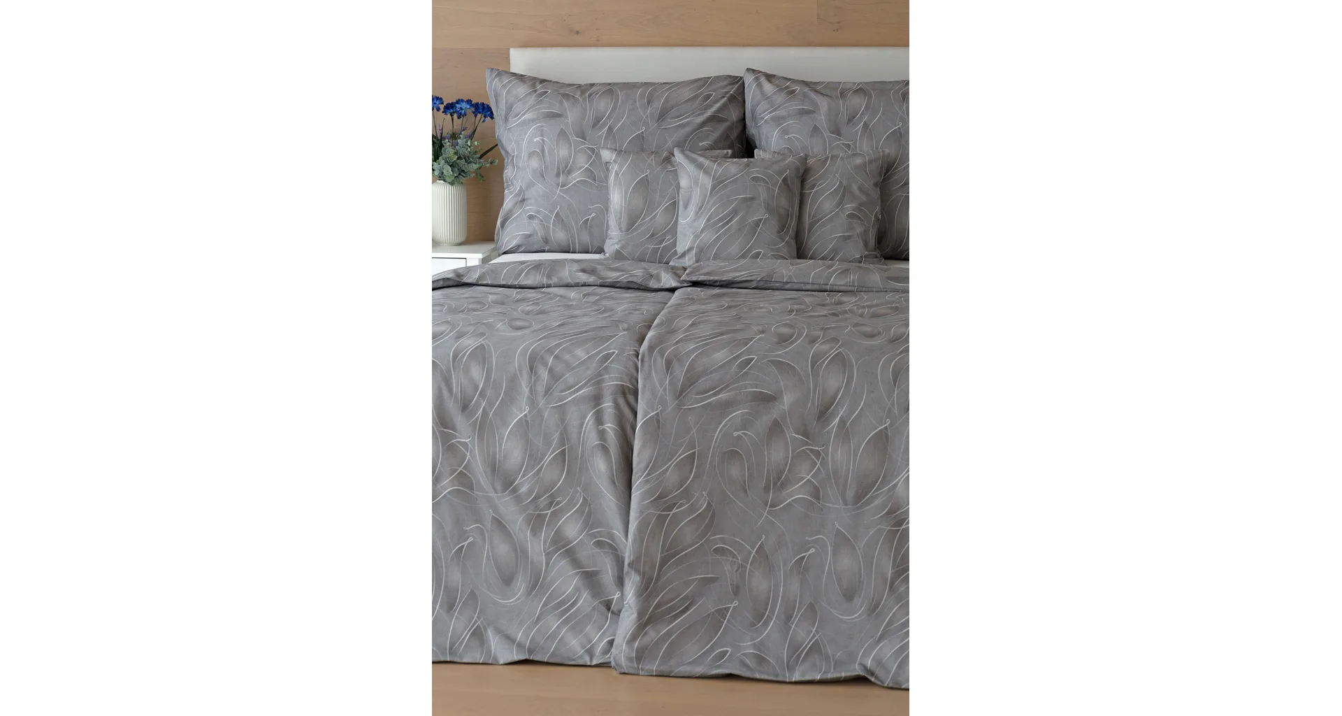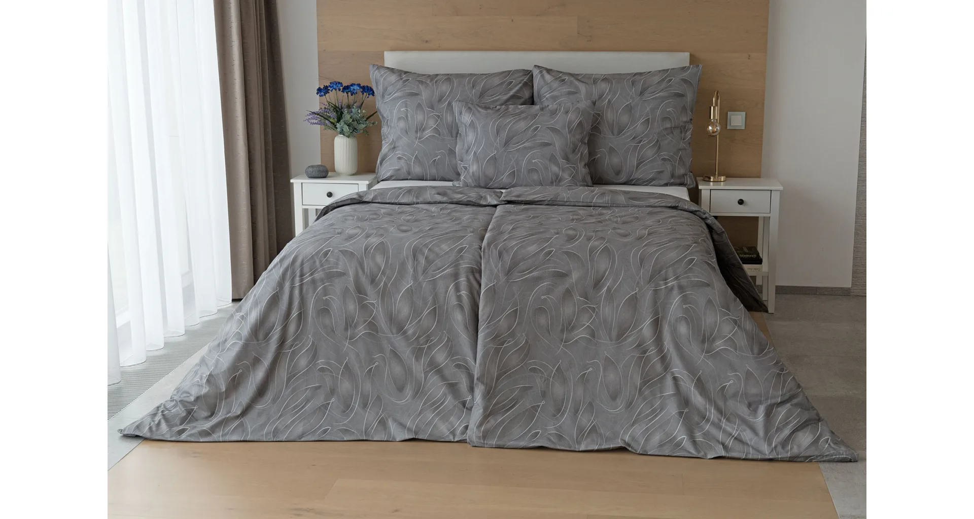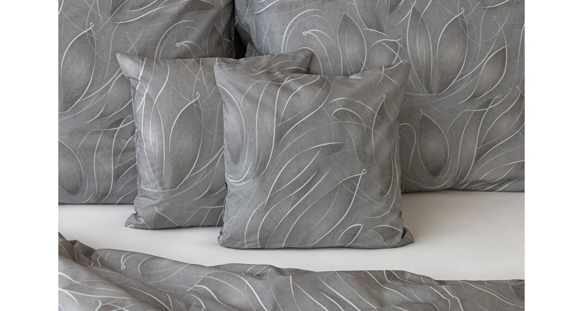 S bavlněným povlečením Adeline bude vaše ložnice elegantní a vždy dokonalá. Světlé kontury decentního lístkového vzoru vynikají na antracitově šedém podkladu. Celý vzor podtrhuje důmyslné stínování, o které se postarala nejmodernější digitální tisková technologie.
