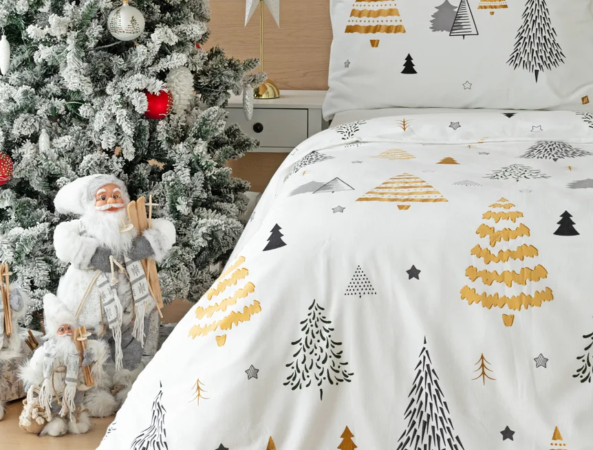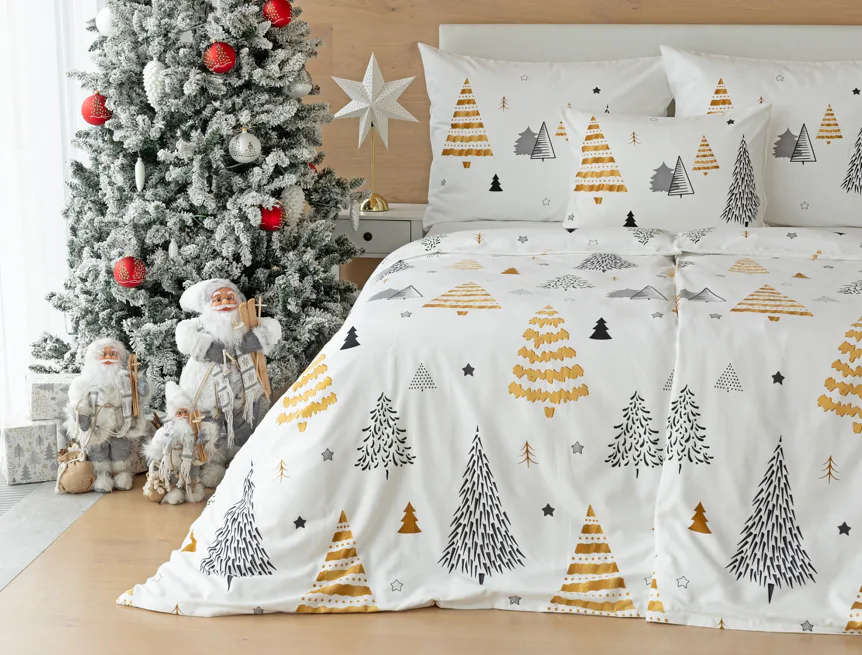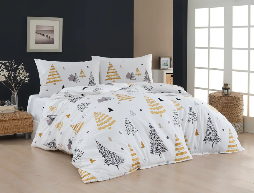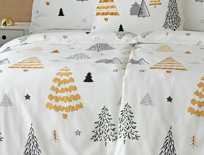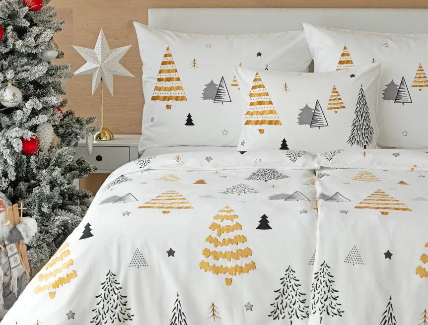 Vánoční povlečení Alder vnese do vaší ložnice noblesu a poklidnou sváteční atmosféru. Motiv zlatých a černých stromků a hvězdiček na sněhově bílém podkladu působí nesmírně čistě a elegantně. Nechte se hýčkat a zachumlejte se do měkoučkého prémiového flanelu.