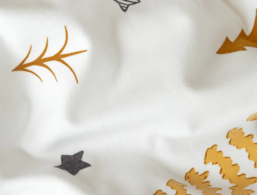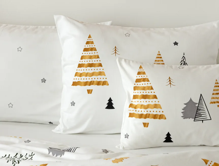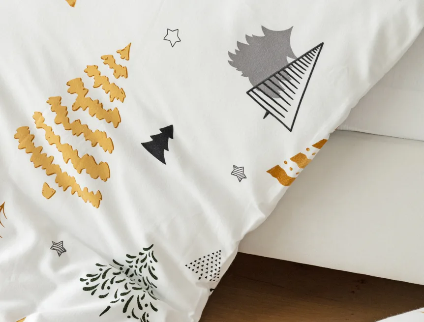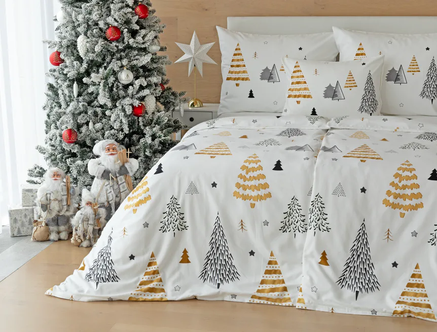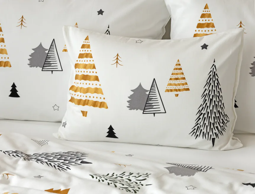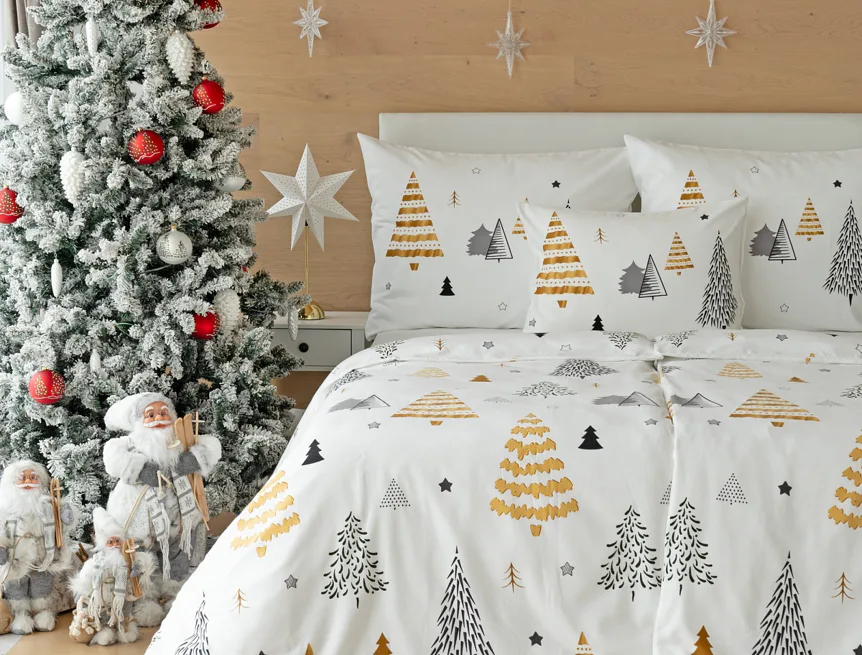 Vánoční povlečení Alder vnese do vaší ložnice noblesu a poklidnou sváteční atmosféru. Motiv zlatých a černých stromků a hvězdiček na sněhově bílém podkladu působí nesmírně čistě a elegantně. Nechte se hýčkat a zachumlejte se do měkoučkého prémiového flanelu.