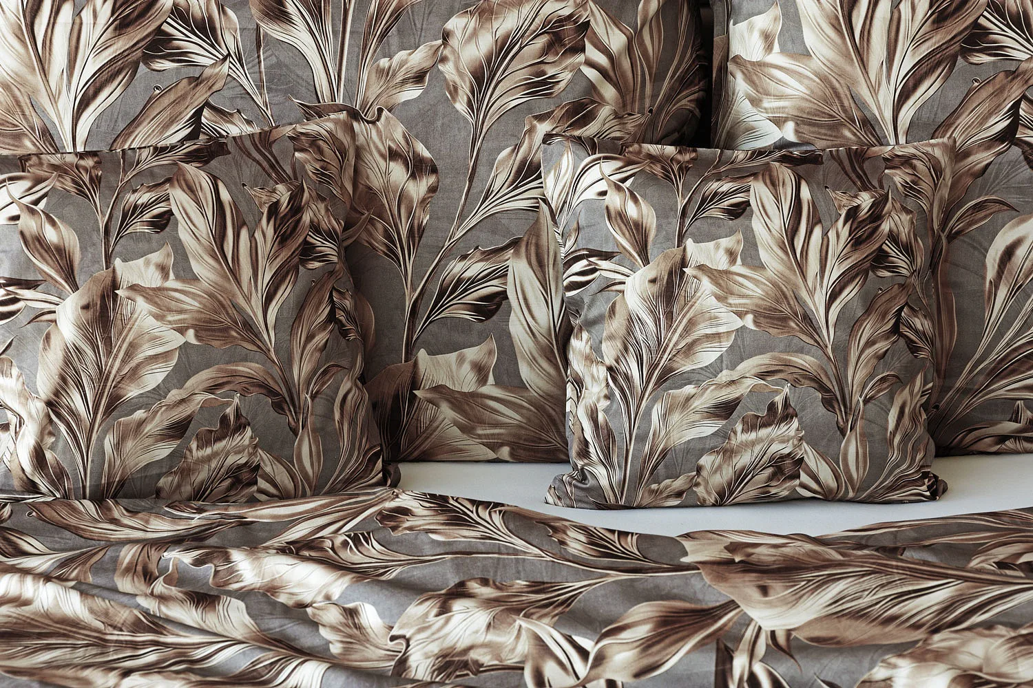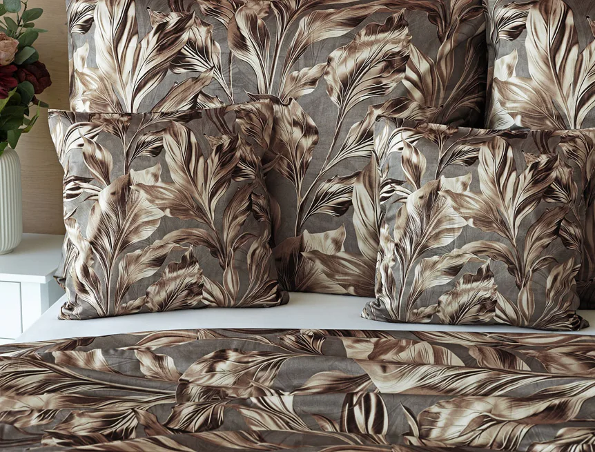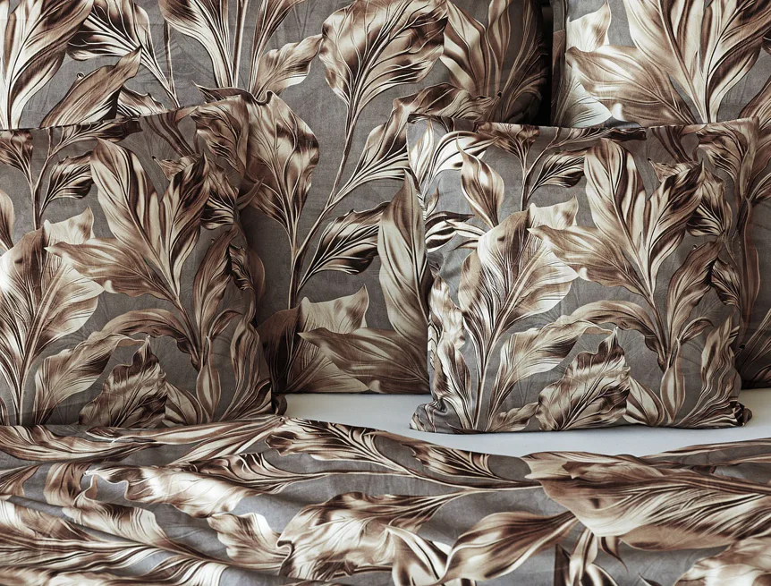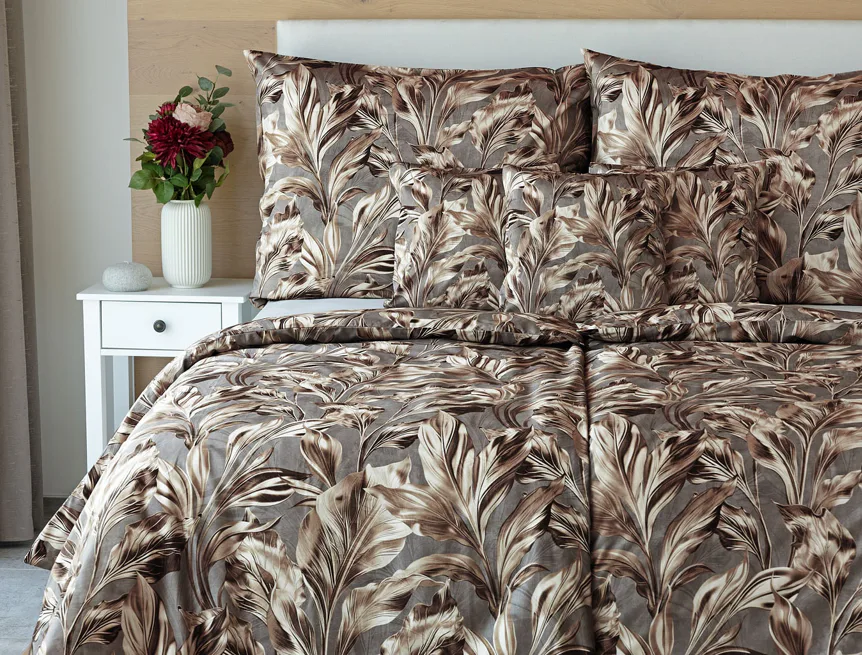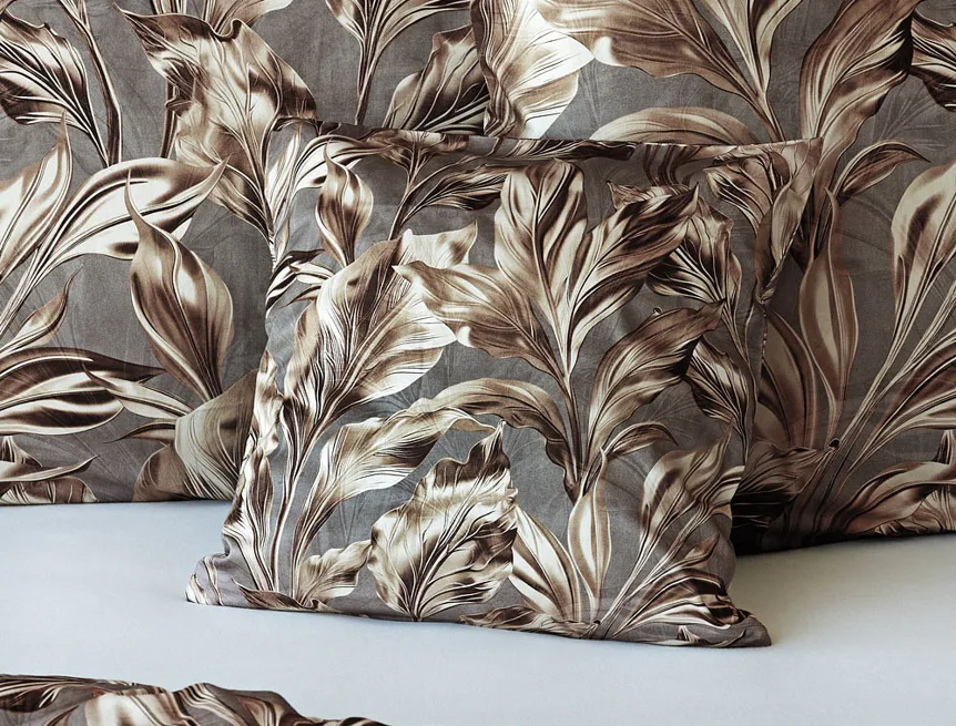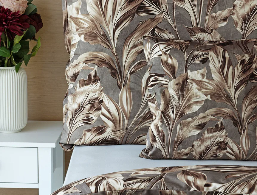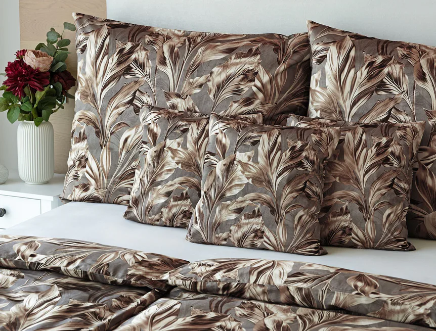 Vzor Ambient zdobí po celé ploše hnědo-zlaté listy na kovově šedém podkladu. Povlak na polštář i na přikrývku je z obou stran stejný, povlečení je opatřeno komfortním zipovým uzávěrem.