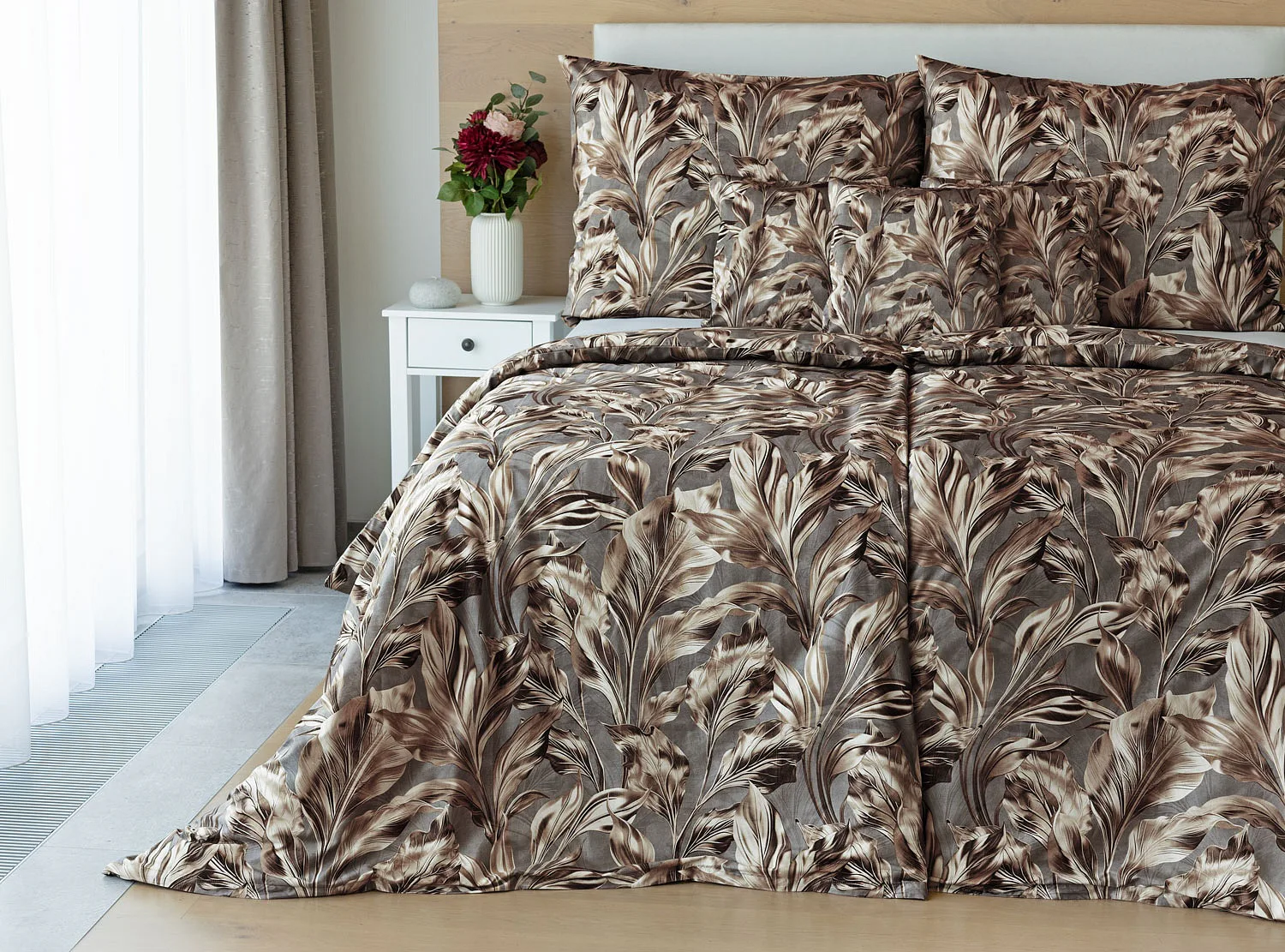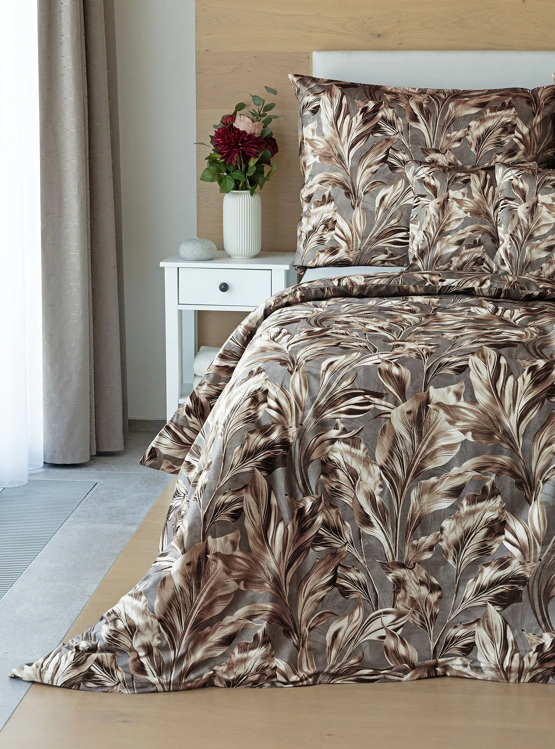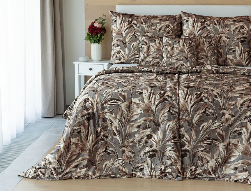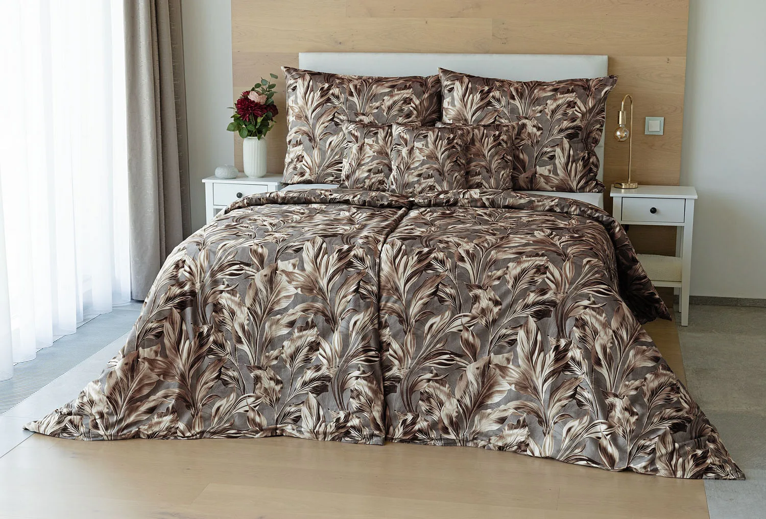 Vzor Ambient zdobí po celé ploše hnědo-zlaté listy na kovově šedém podkladu. Povlak na polštář i na přikrývku je z obou stran stejný, povlečení je opatřeno komfortním zipovým uzávěrem.