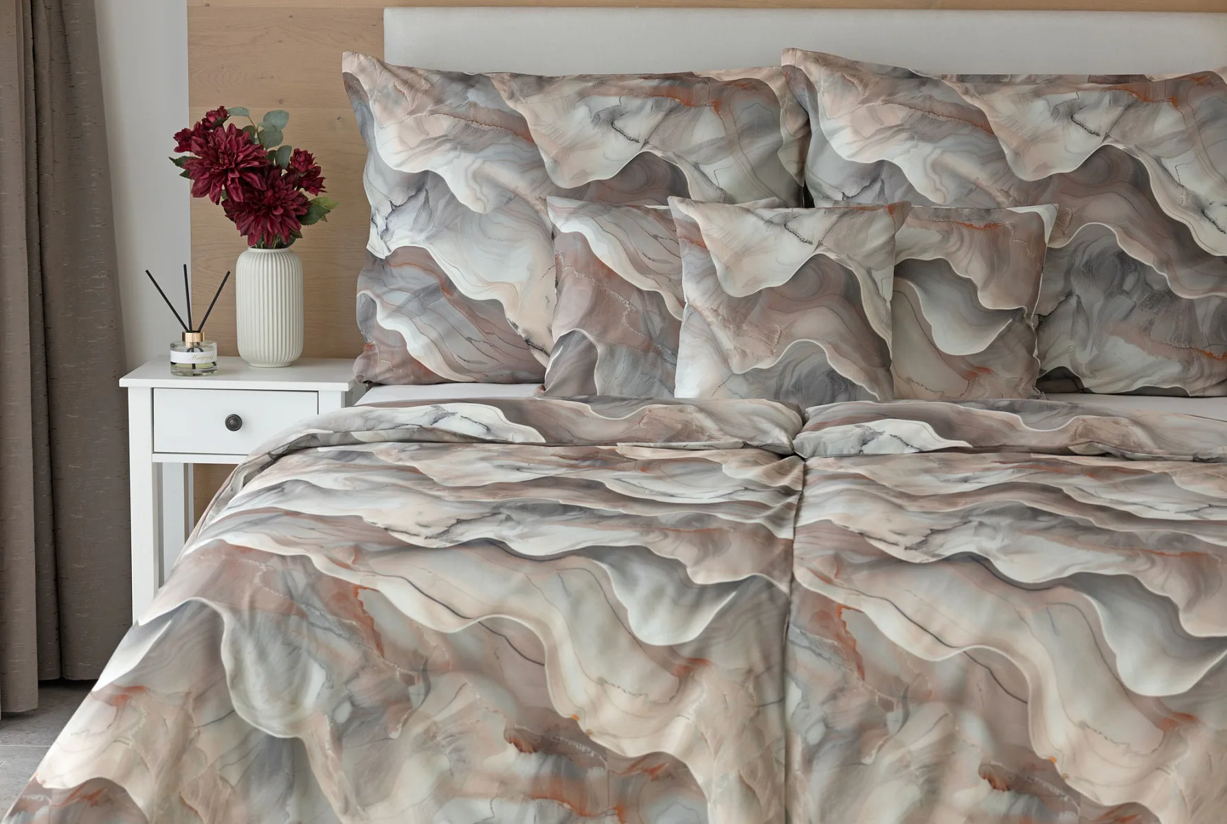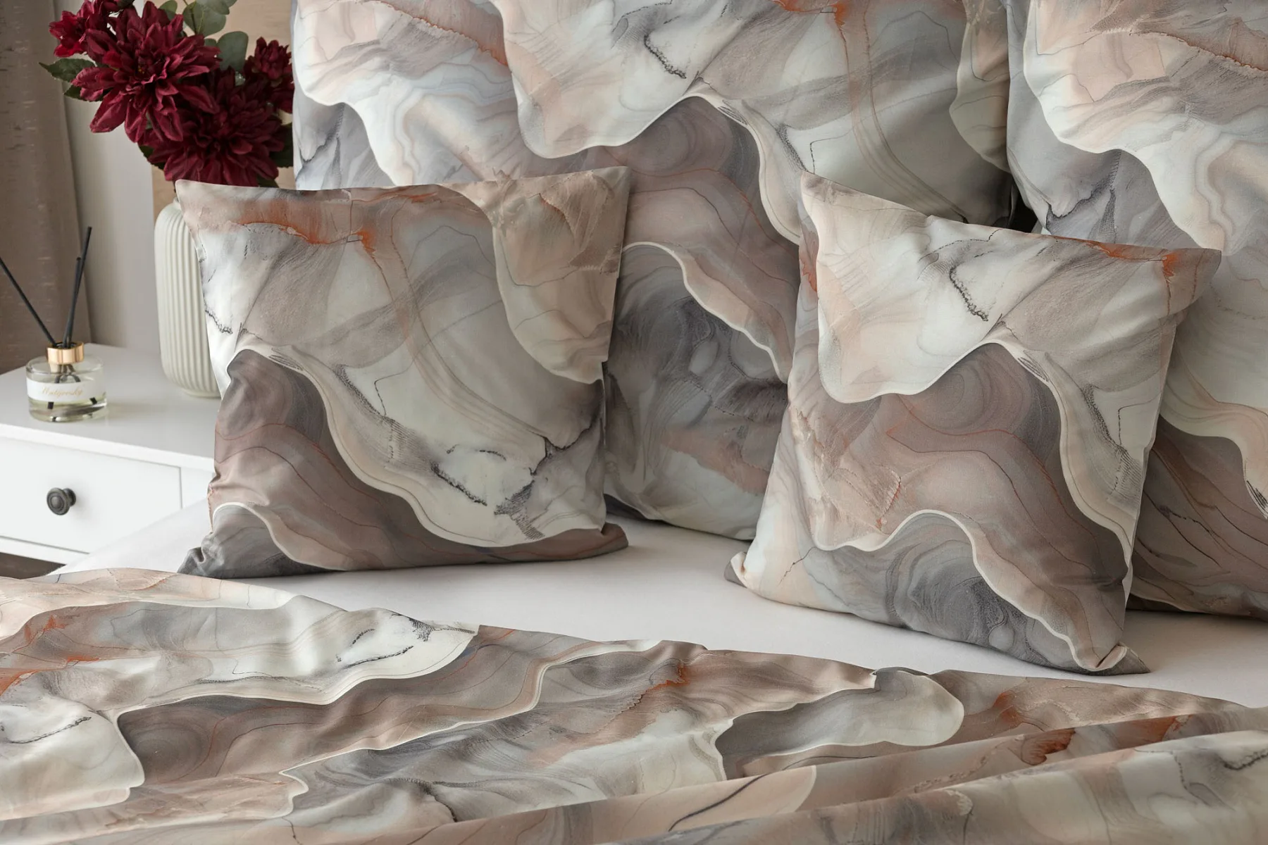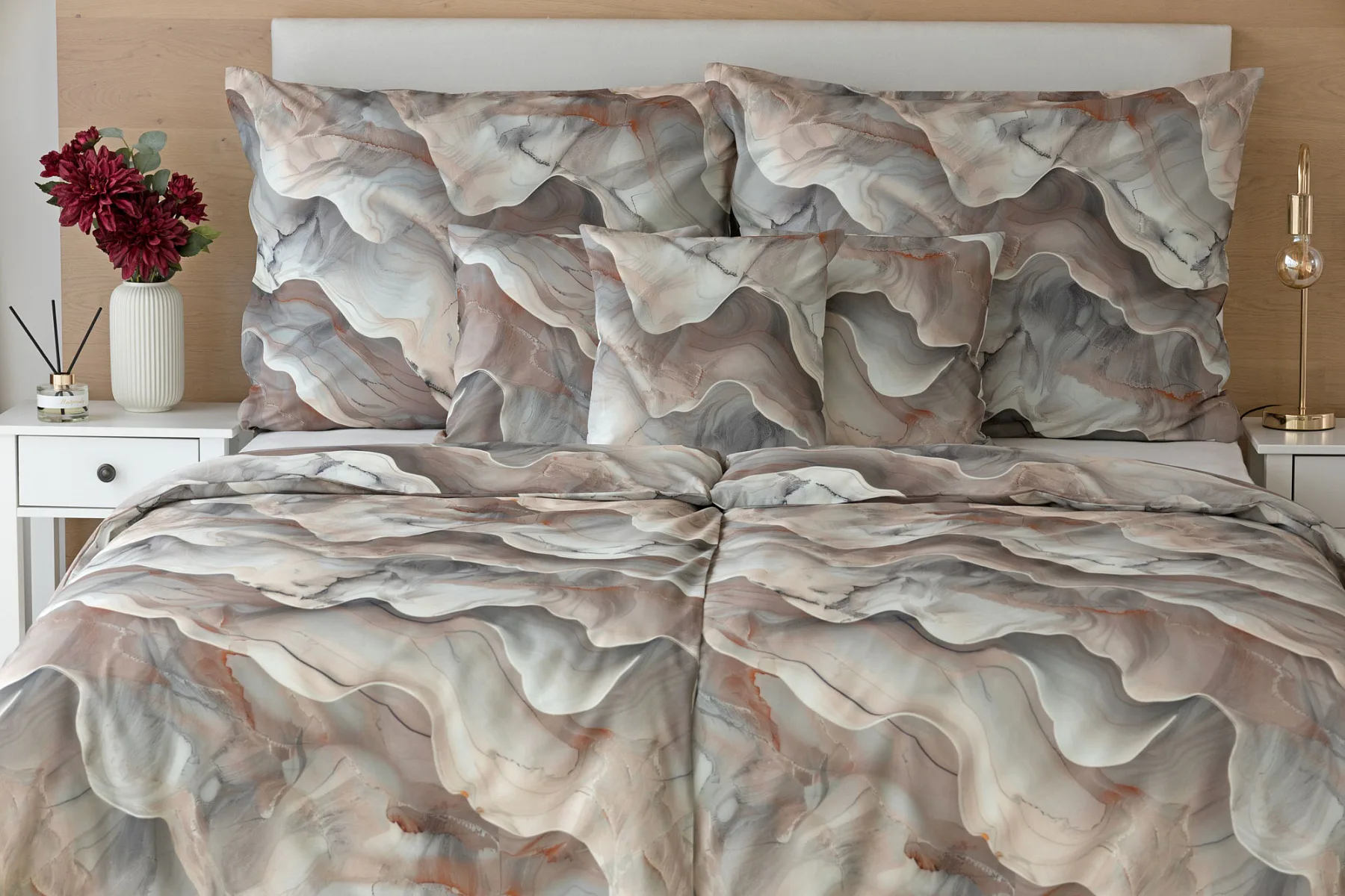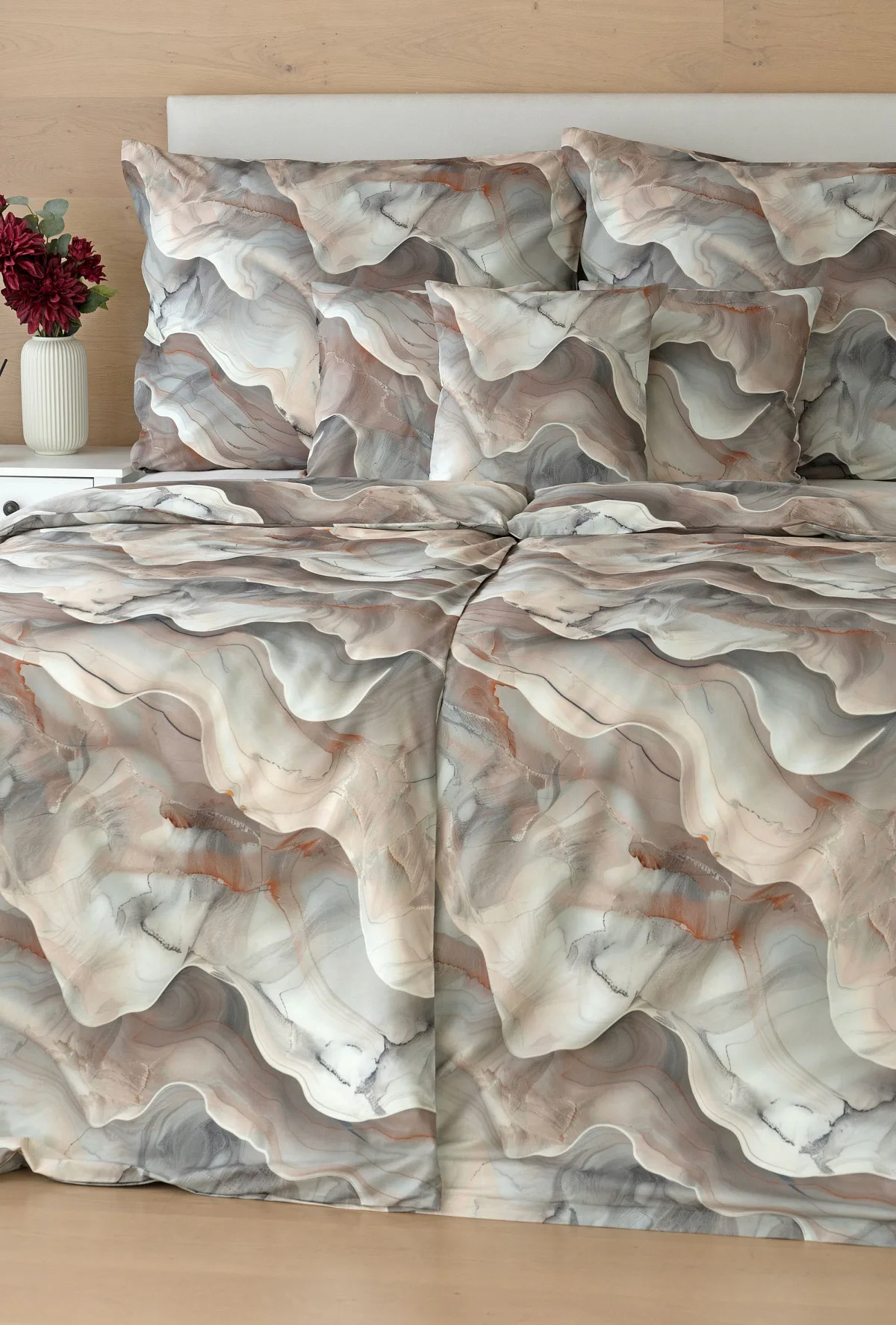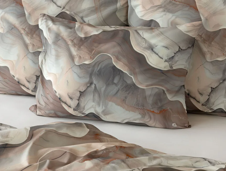 Bavlněné ložní povlečení Amede vnese do vaší ložnice pozitivní energii a nabudí vás do každého dne. Spojení zemitých tónů hnědé, cihlové a šedé barvy v abstraktním vzoru tvoří dokonalý celek, který vyladí váš interiér k dokonalosti. Díky nejmodernější digitální tiskové technologii vyniká vzor v precizním detailu.