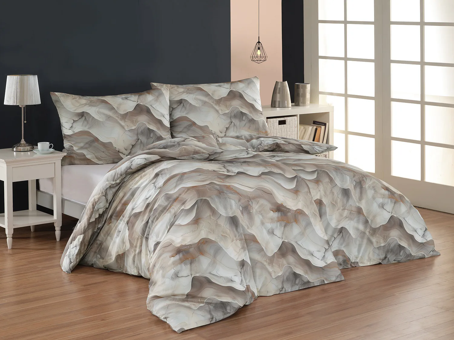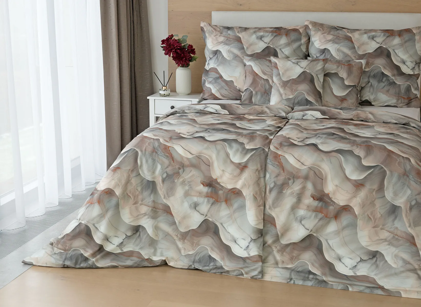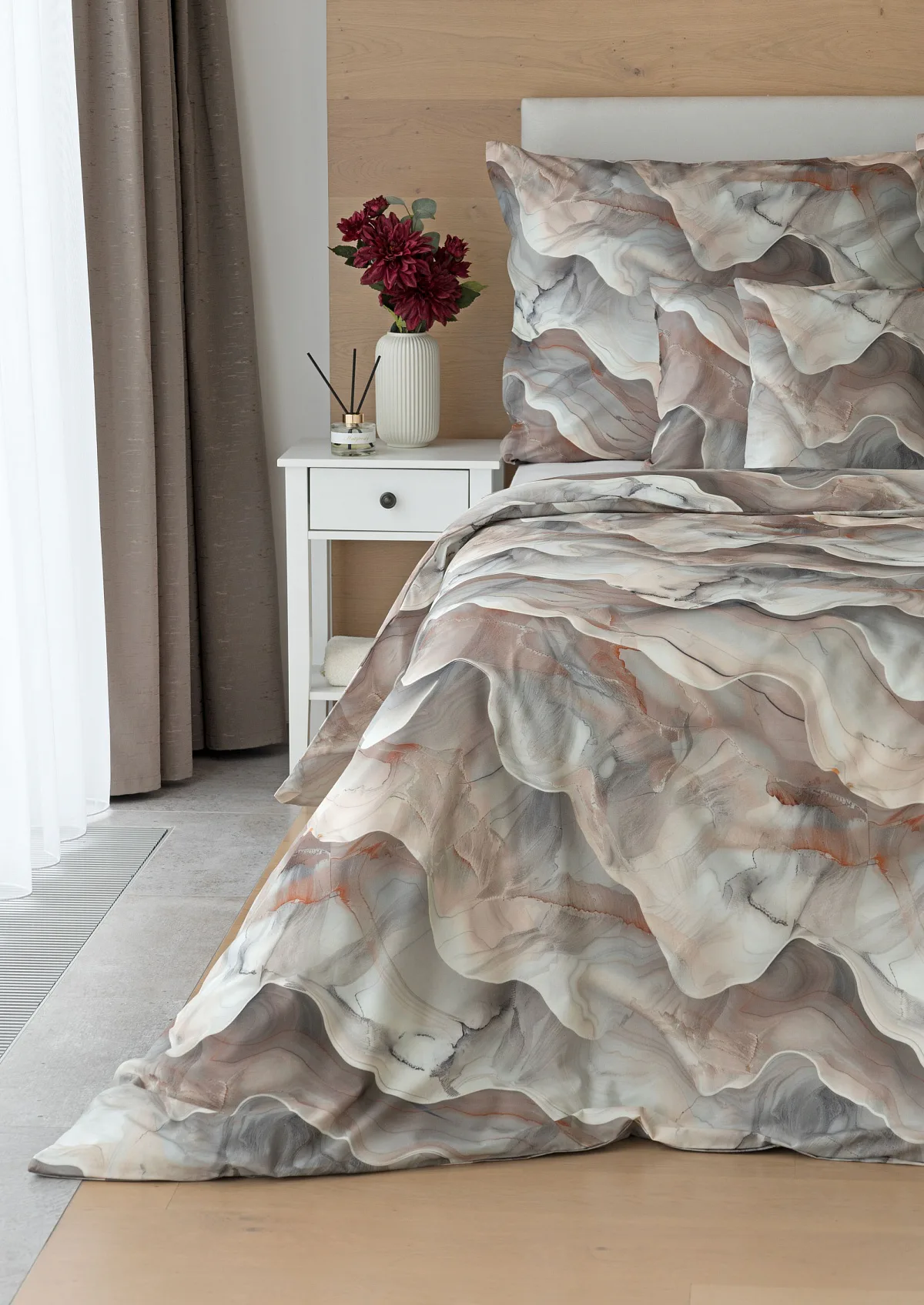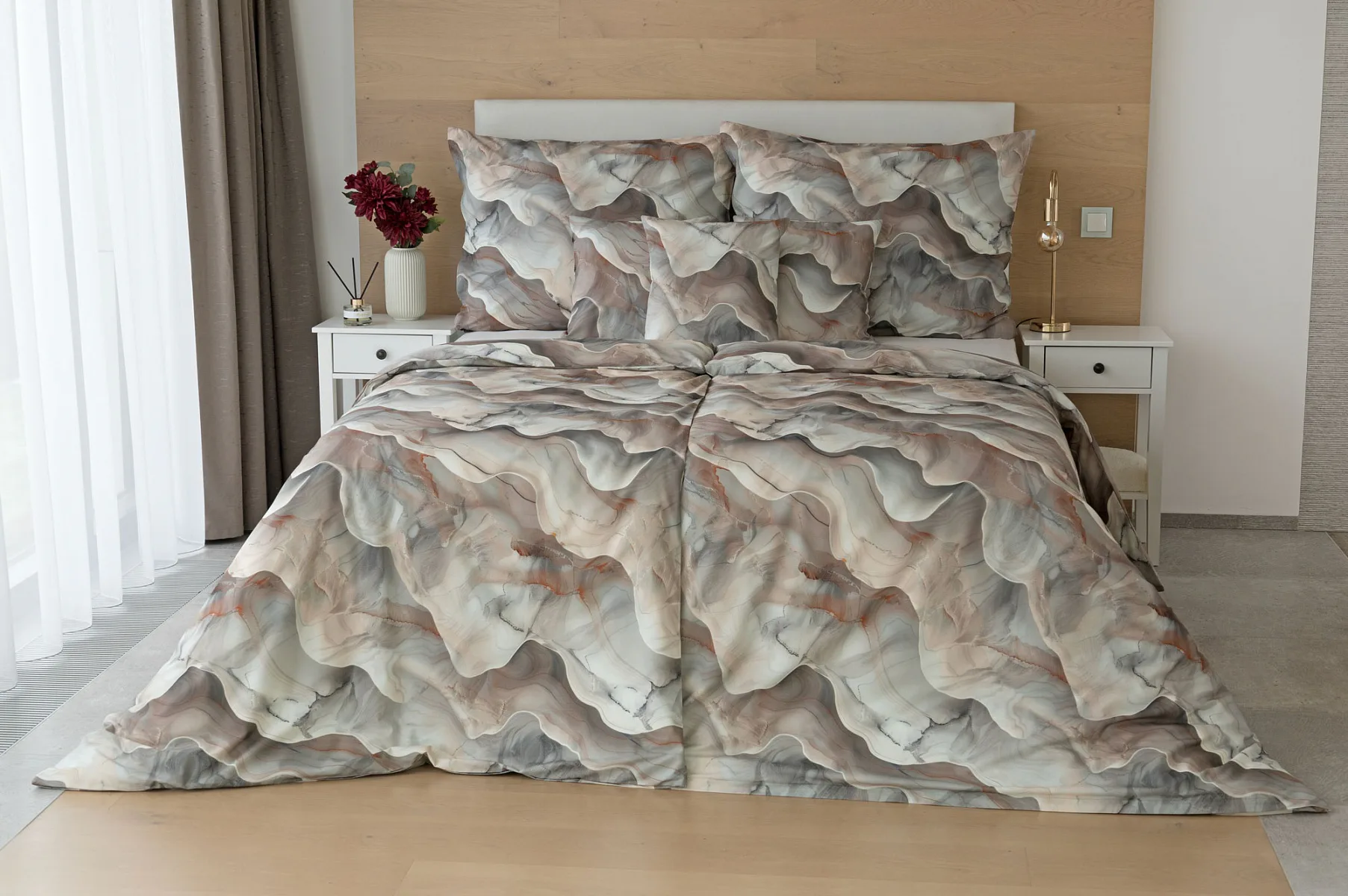 Bavlněné ložní povlečení Amede vnese do vaší ložnice pozitivní energii a nabudí vás do každého dne. Spojení zemitých tónů hnědé, cihlové a šedé barvy v abstraktním vzoru tvoří dokonalý celek, který vyladí váš interiér k dokonalosti. Díky nejmodernější digitální tiskové technologii vyniká vzor v precizním detailu.
