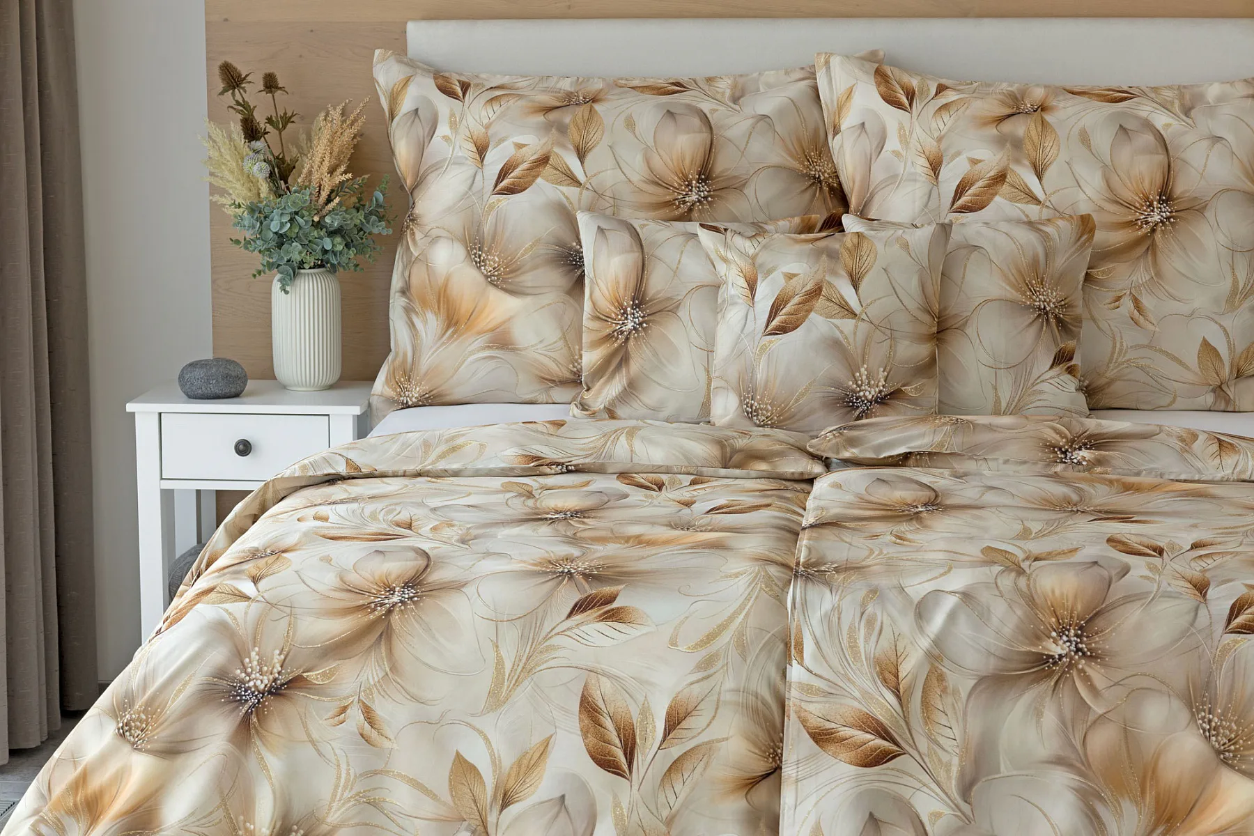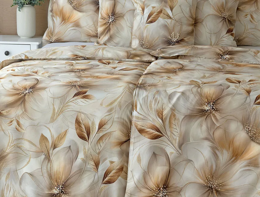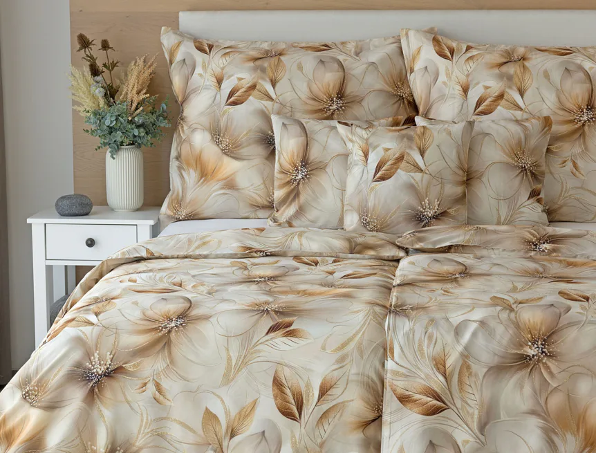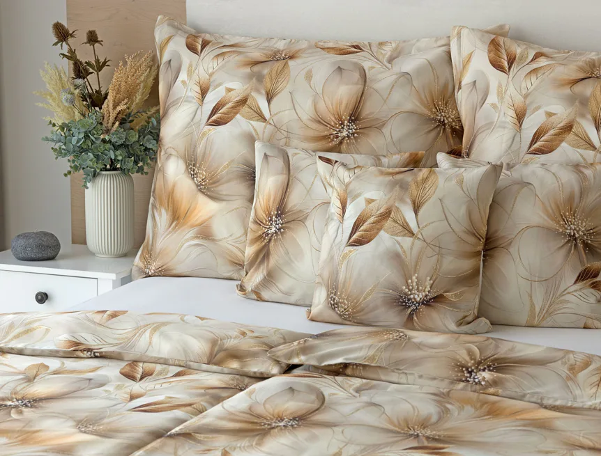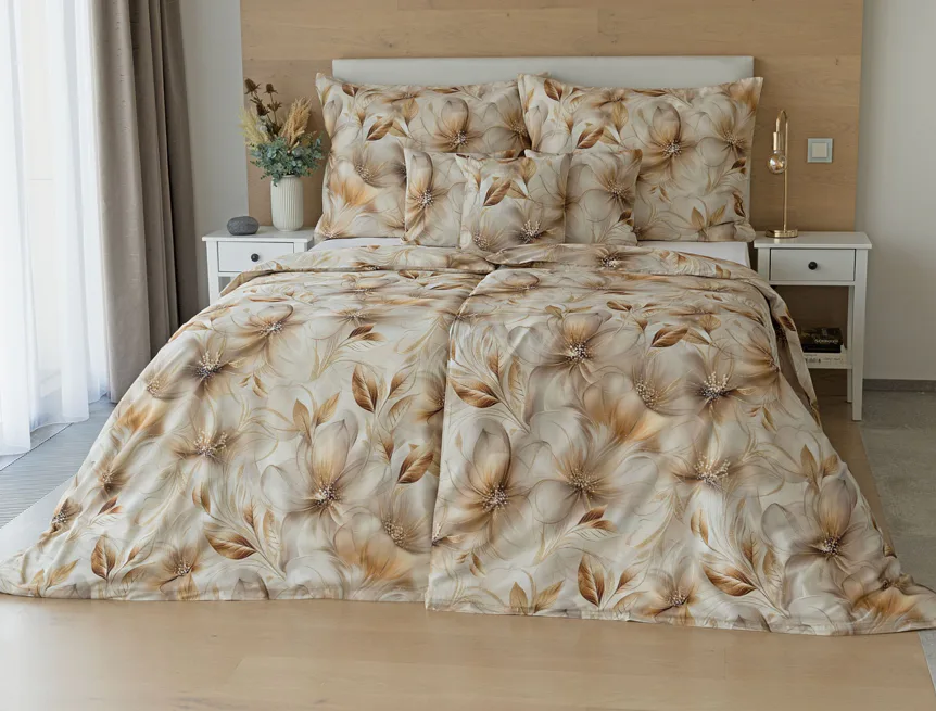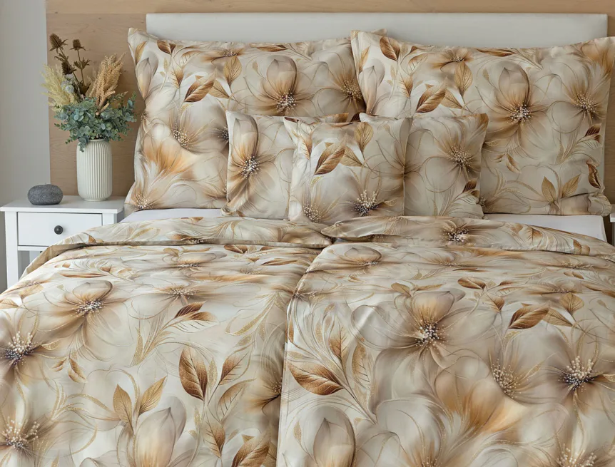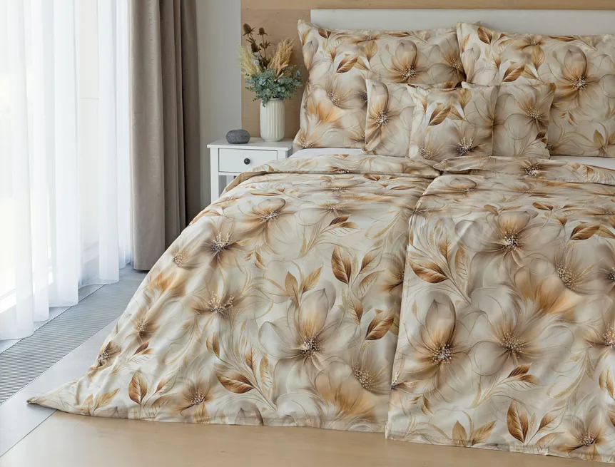 Nesmírně elegantní a poutavý vzor přináší bavlněné povlečení Armide z naší nové kolekce. V propracovaném květinovém motivu se prolíná paleta přírodních béžových a hnědých tónů protnutých zlatavými prvky. O precizní detail originálního autorského díla se postarala nejmodernější digitální tisková technologie. Noblesu tohoto jedinečného designového kousku podtrhuje hebký bavlněný satén s decentním leskem.