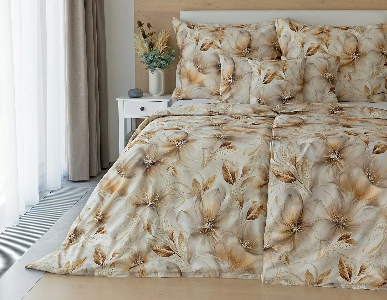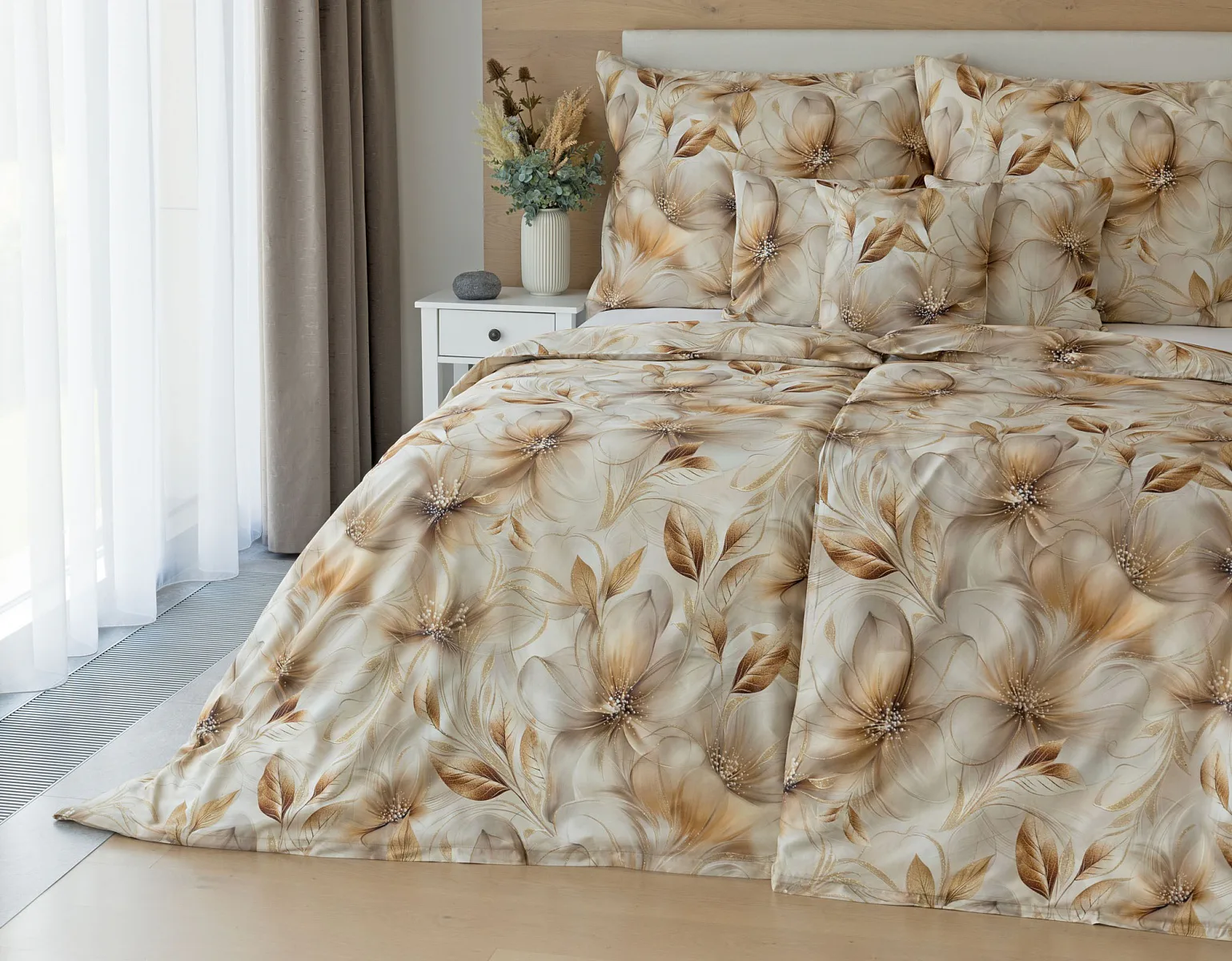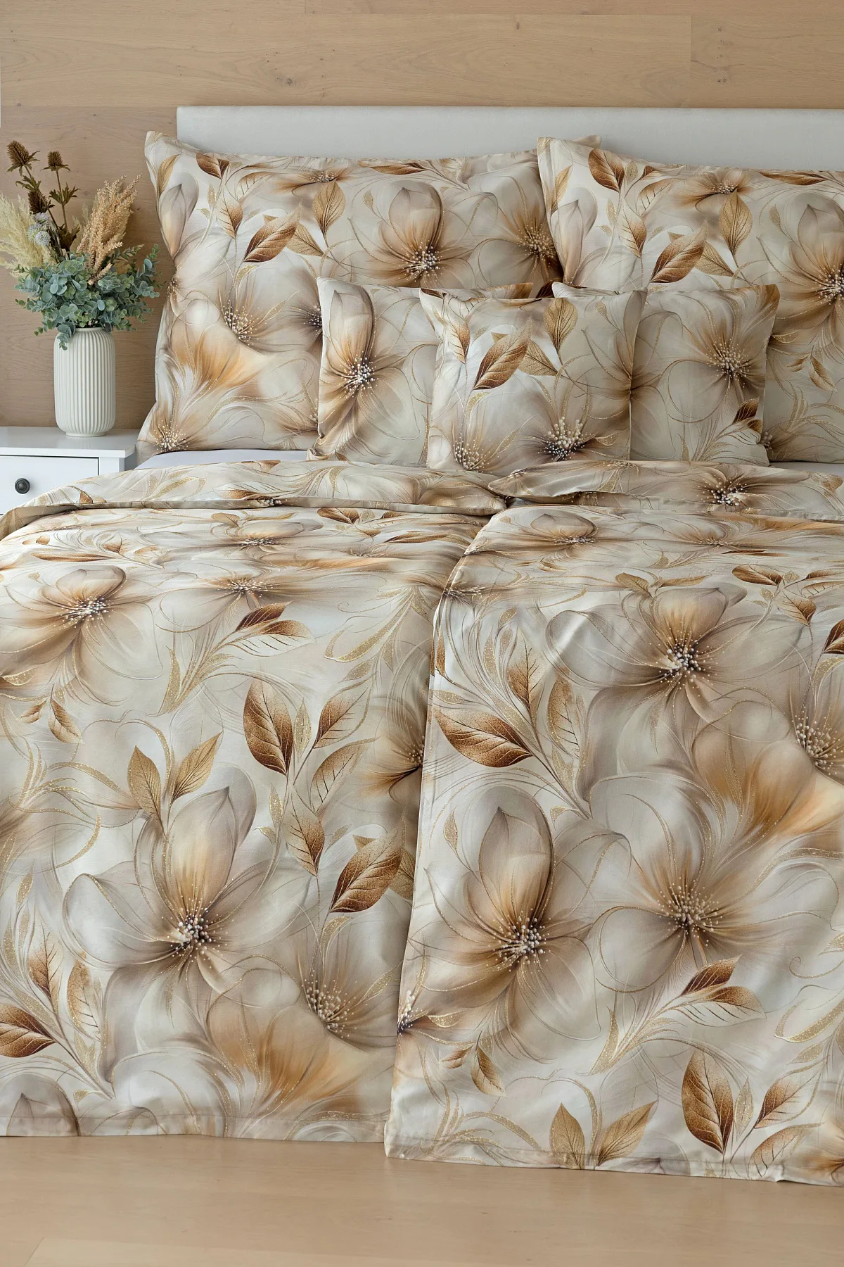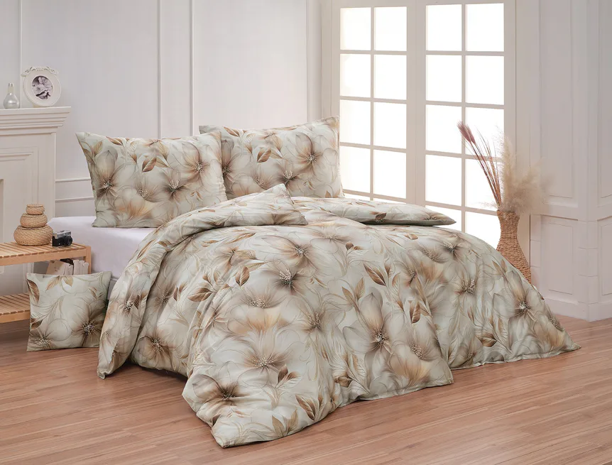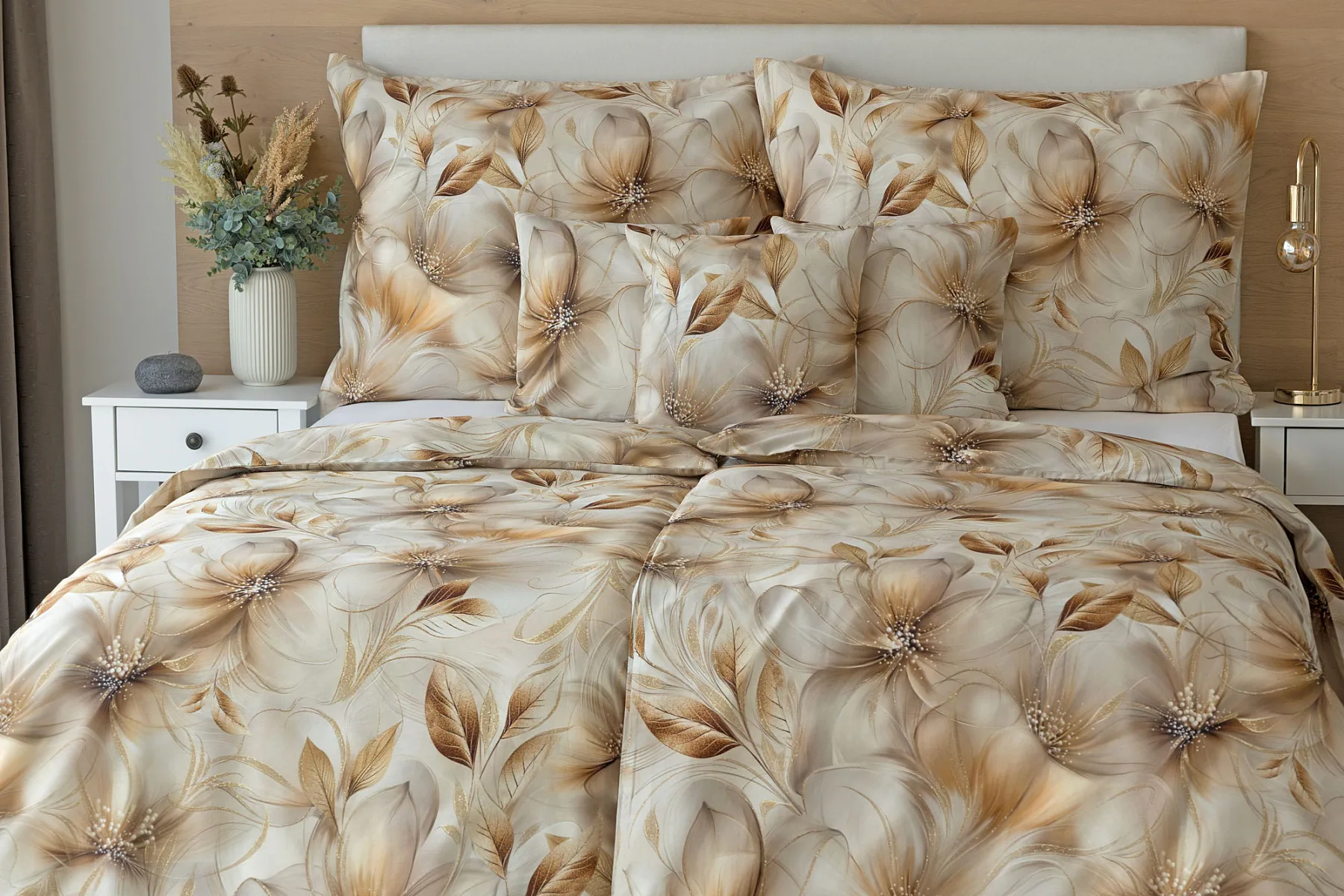 Nesmírně elegantní a poutavý vzor přináší bavlněné povlečení Armide z naší nové kolekce. V propracovaném květinovém motivu se prolíná paleta přírodních béžových a hnědých tónů protnutých zlatavými prvky. O precizní detail originálního autorského díla se postarala nejmodernější digitální tisková technologie. Noblesu tohoto jedinečného designového kousku podtrhuje hebký bavlněný satén s decentním leskem.