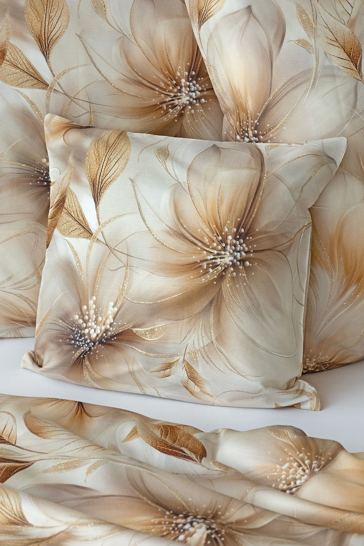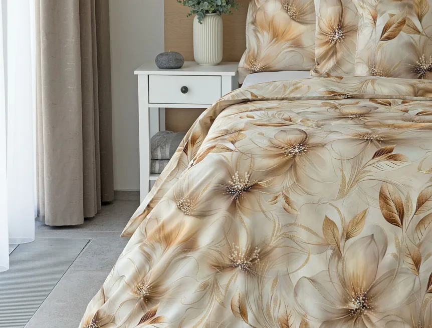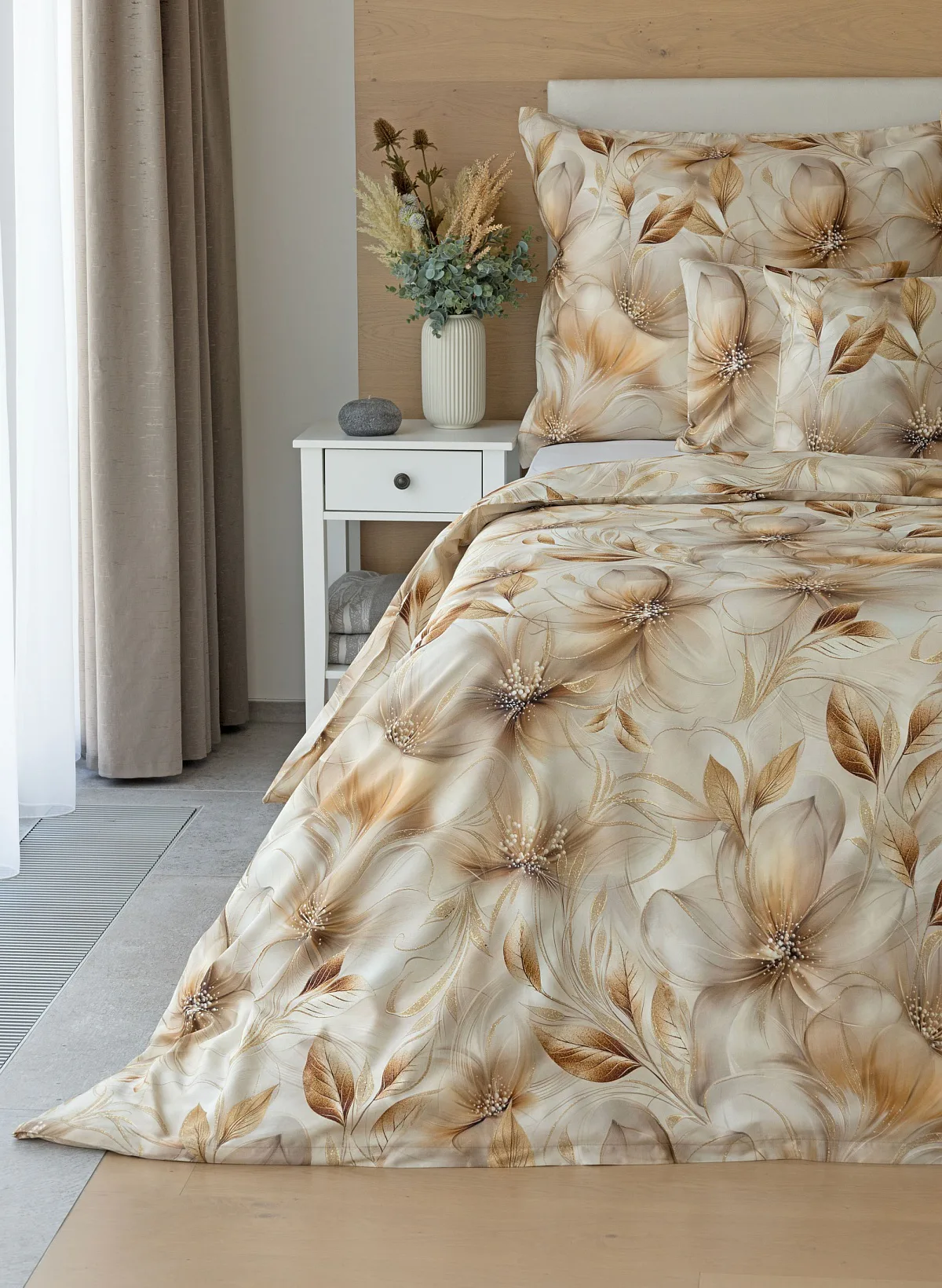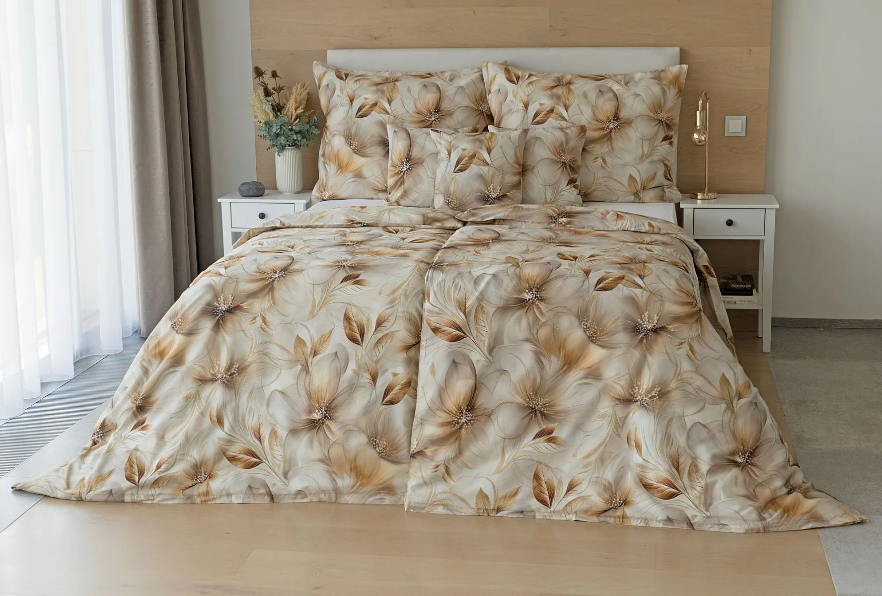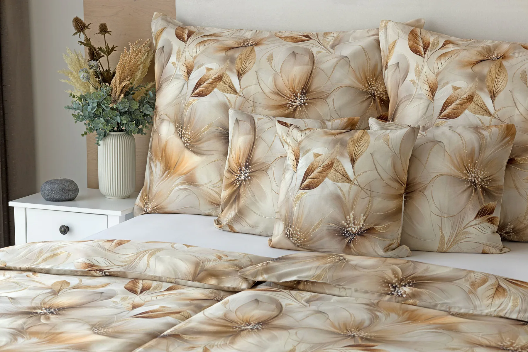 Nesmírně elegantní a poutavý vzor přináší bavlněné povlečení Armide z naší nové kolekce. V propracovaném květinovém motivu se prolíná paleta přírodních béžových a hnědých tónů protnutých zlatavými prvky. O precizní detail originálního autorského díla se postarala nejmodernější digitální tisková technologie. Noblesu tohoto jedinečného designového kousku podtrhuje hebký bavlněný satén s decentním leskem.