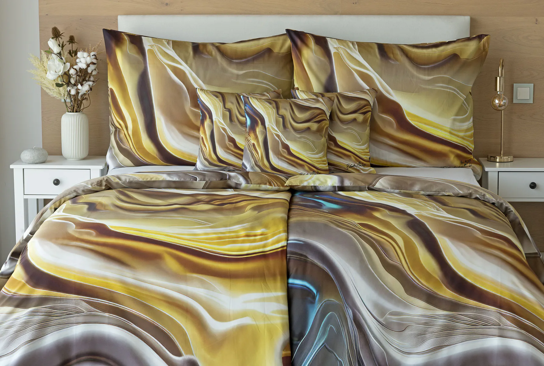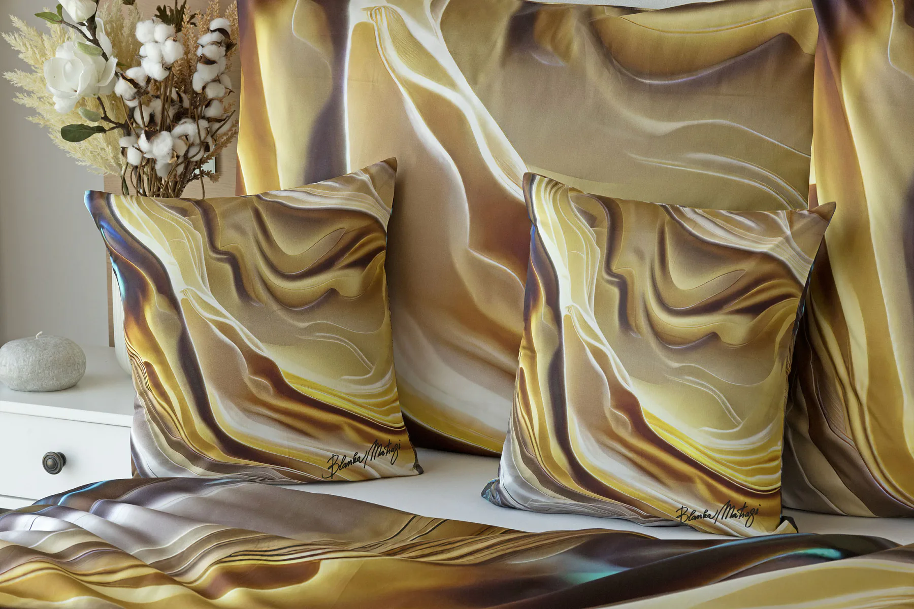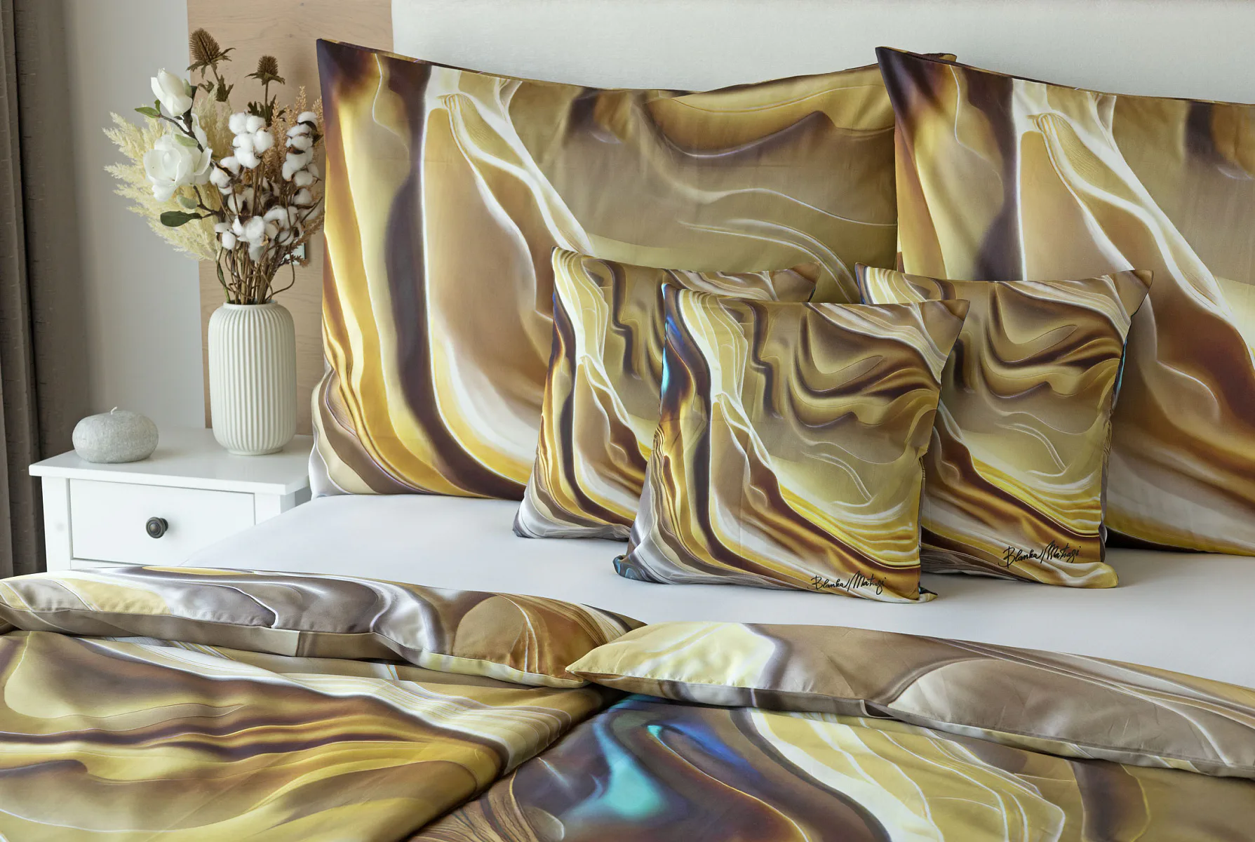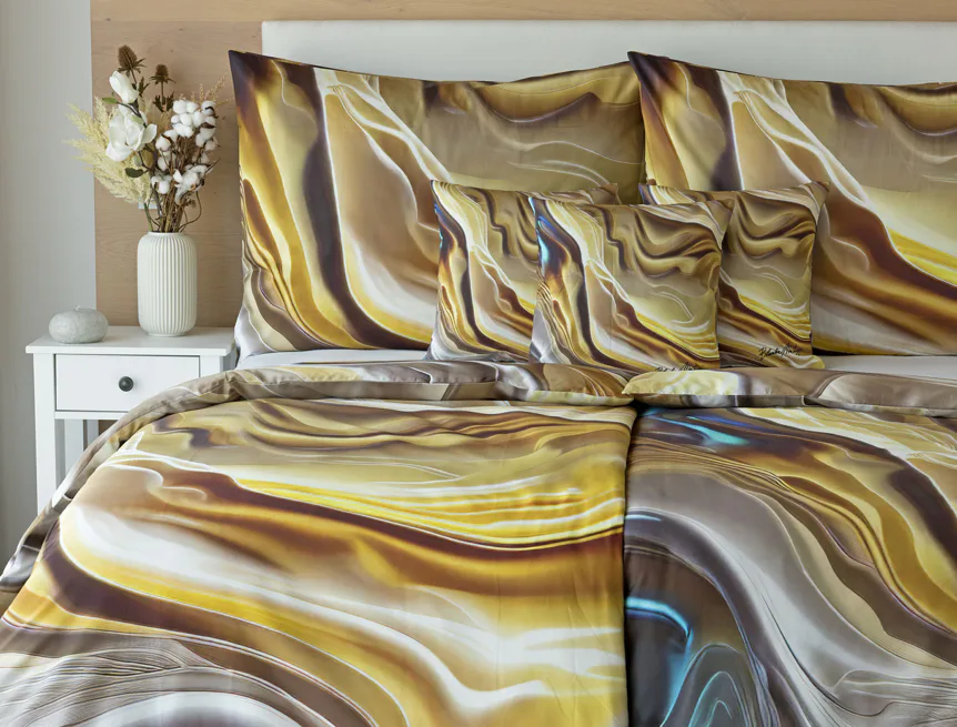 Tento autorský digitálně zpracovaný motiv v sobě snoubí hřejivé odstíny zlaté, béžové a hnědé barvy. Nejmodernější digitální tisk zajišťuje věrný detail přesně dle autorčina záměru, motiv je z obou stran povlečení stejný.