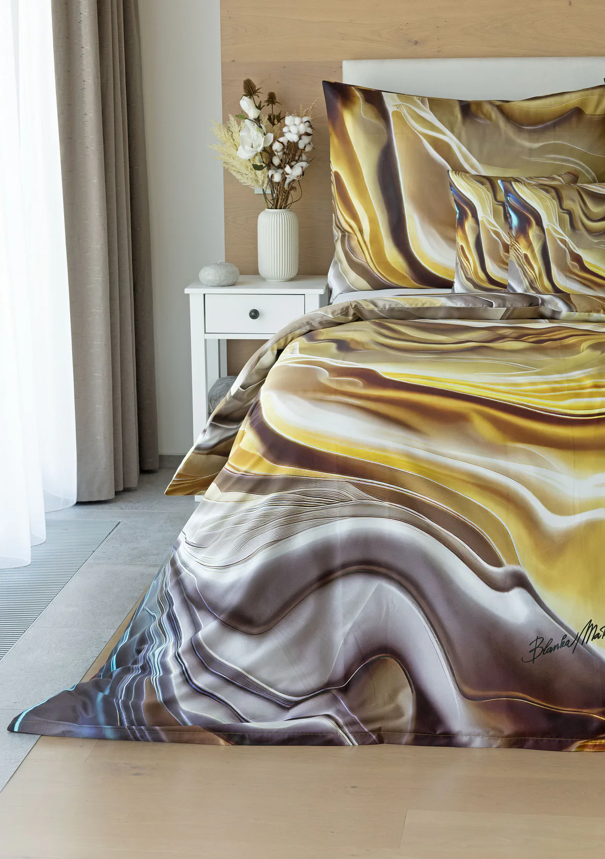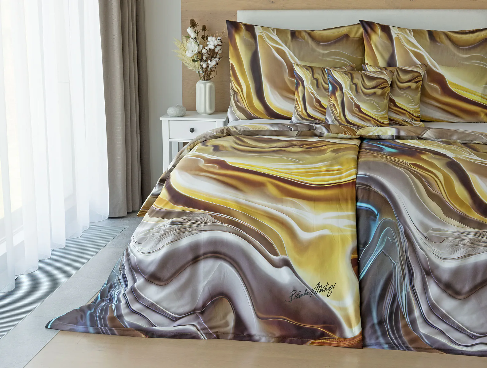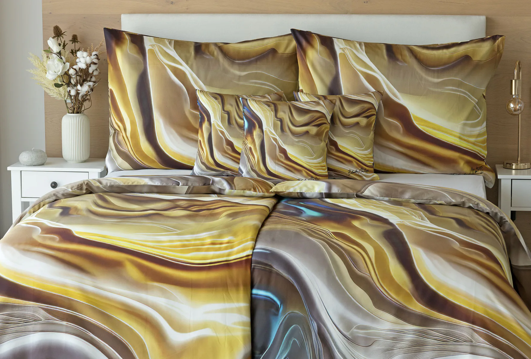 Tento autorský digitálně zpracovaný motiv v sobě snoubí hřejivé odstíny zlaté, béžové a hnědé barvy. Nejmodernější digitální tisk zajišťuje věrný detail přesně dle autorčina záměru, motiv je z obou stran povlečení stejný.